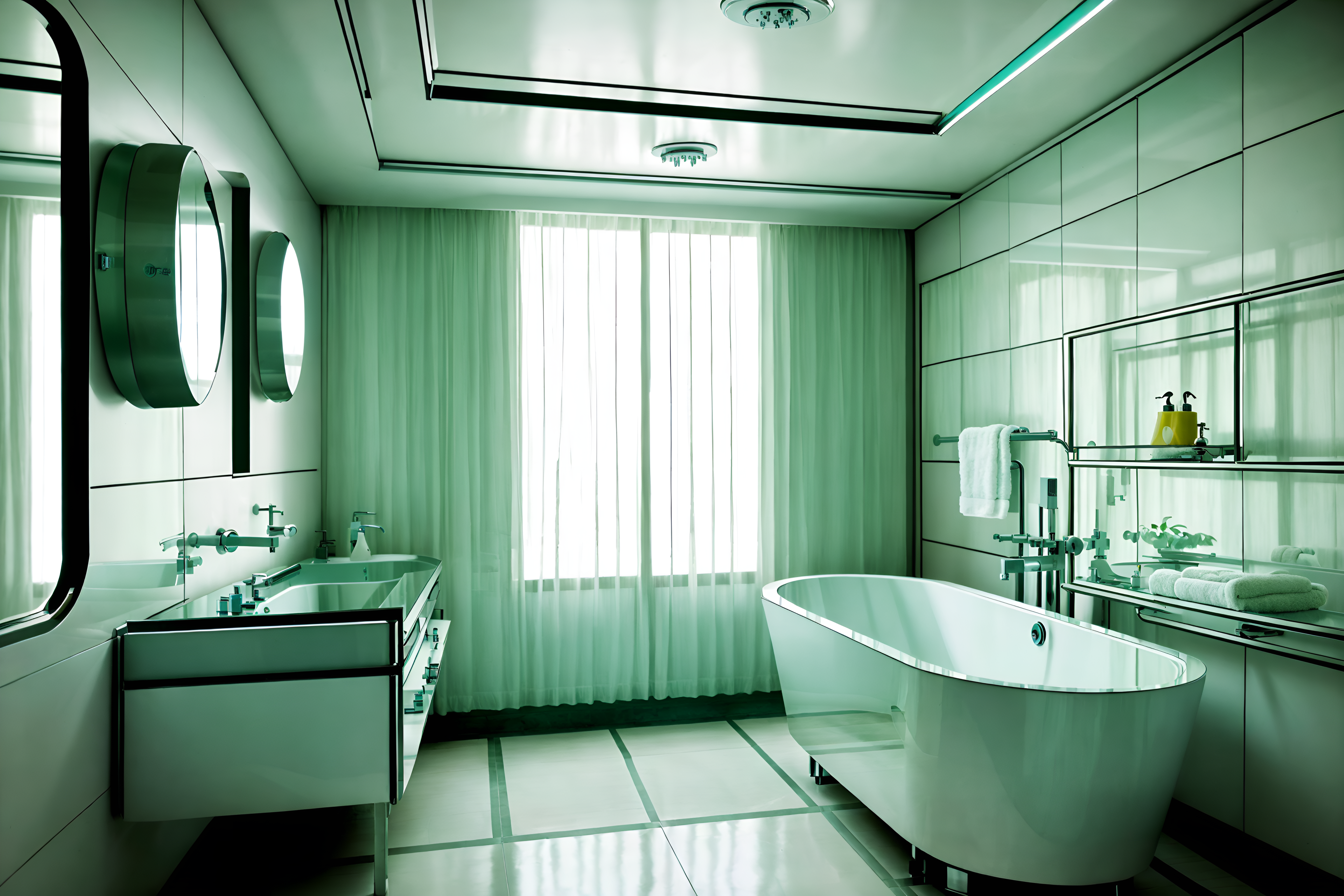 photo from pinterest of retro futuristic-style interior designed (hotel bathroom interior) with mirror and plant and bath towel and shower and bathtub and bathroom cabinet and toilet seat and bathroom sink with faucet. . with neutral background and bright accents and steel finishing and light colors and futuristic interior and floating surfaces and glass panes and circular shapes and minimalist clean lines. . cinematic photo, highly detailed, cinematic lighting, ultra-detailed, ultrarealistic, photorealism, 8k. trending on pinterest. retro futuristic interior design style. masterpiece, cinematic light, ultrarealistic+, photorealistic+, 8k, raw photo, realistic, sharp focus on eyes, (symmetrical eyes), (intact eyes), hyperrealistic, highest quality, best quality, , highly detailed, masterpiece, best quality, extremely detailed 8k wallpaper, masterpiece, best quality, ultra-detailed, best shadow, detailed background, detailed face, detailed eyes, high contrast, best illumination, detailed face, dulux, caustic, dynamic angle, detailed glow. dramatic lighting. highly detailed, insanely detailed hair, symmetrical, intricate details, professionally retouched, 8k high definition. strong bokeh. award winning photo.