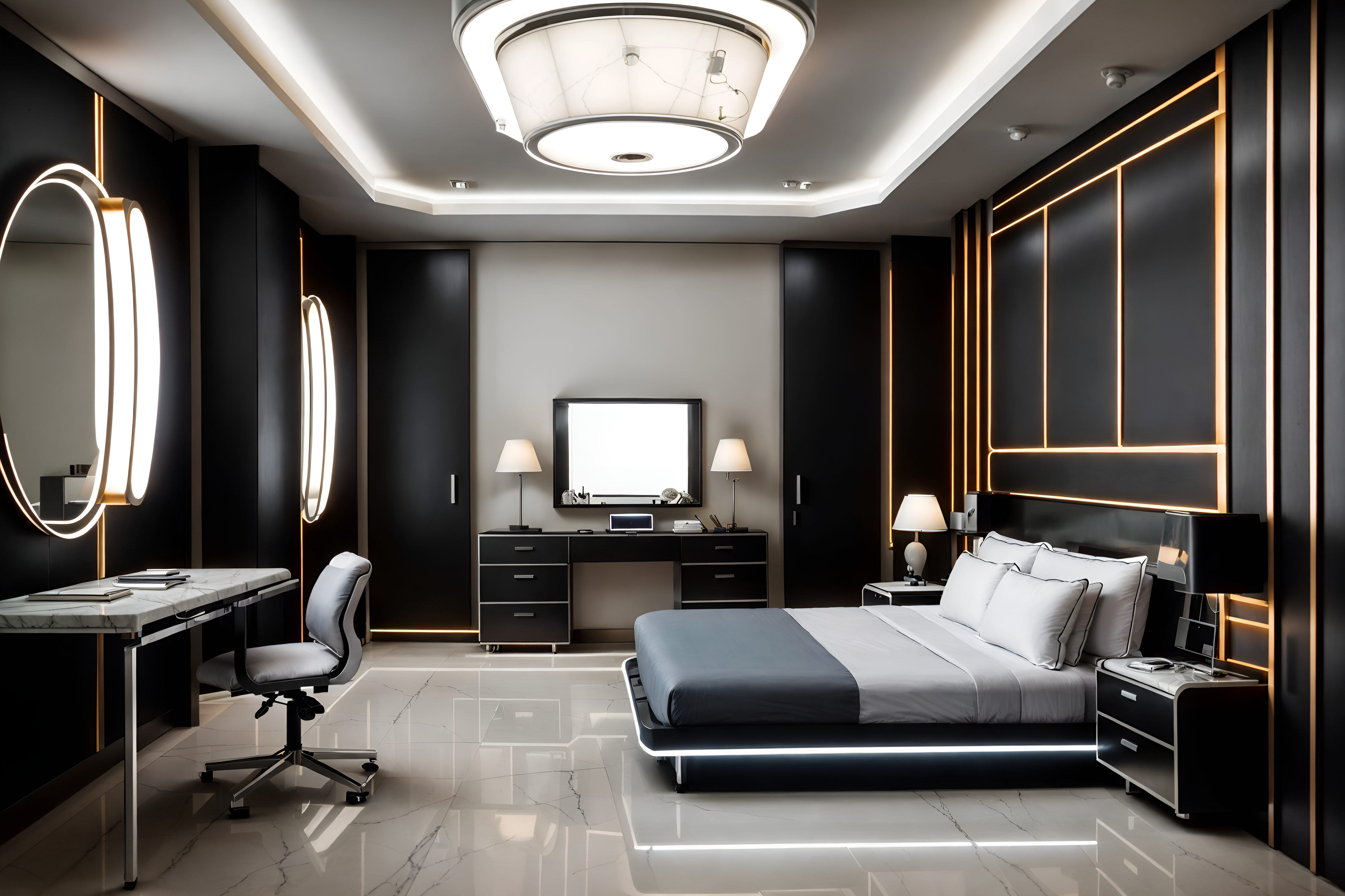 photo from pinterest of retro futuristic-style interior designed (hotel room interior) with bed and working desk with desk chair and hotel bathroom and plant and dresser closet and storage bench or ottoman and night light and mirror. . with futuristic interior and smooth polished marble and minimalist clean lines and strong geometric walls and floating surfaces and circular shapes and monochromatic palette and steel finishing. . cinematic photo, highly detailed, cinematic lighting, ultra-detailed, ultrarealistic, photorealism, 8k. trending on pinterest. retro futuristic interior design style. masterpiece, cinematic light, ultrarealistic+, photorealistic+, 8k, raw photo, realistic, sharp focus on eyes, (symmetrical eyes), (intact eyes), hyperrealistic, highest quality, best quality, , highly detailed, masterpiece, best quality, extremely detailed 8k wallpaper, masterpiece, best quality, ultra-detailed, best shadow, detailed background, detailed face, detailed eyes, high contrast, best illumination, detailed face, dulux, caustic, dynamic angle, detailed glow. dramatic lighting. highly detailed, insanely detailed hair, symmetrical, intricate details, professionally retouched, 8k high definition. strong bokeh. award winning photo.