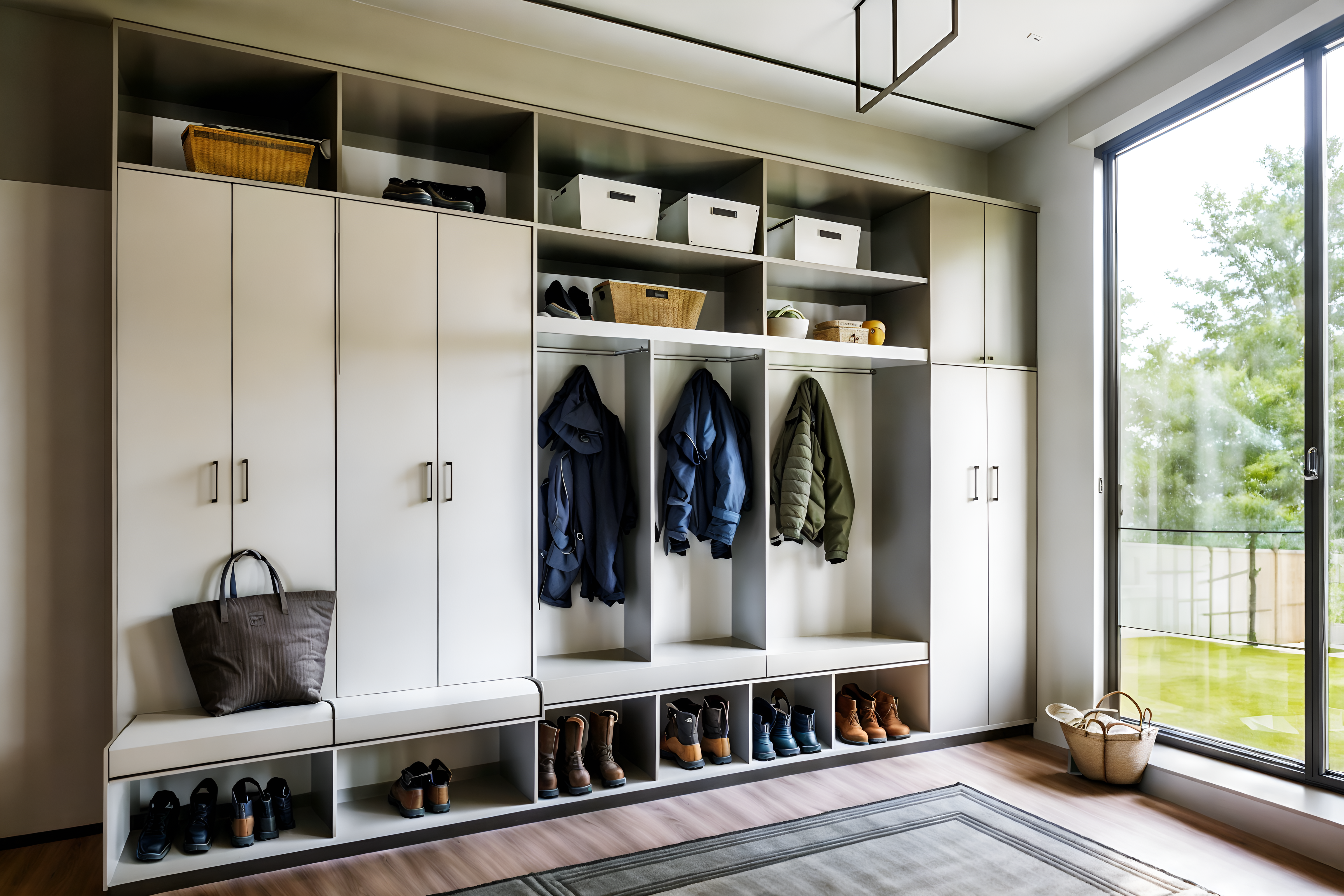 photo from pinterest of retro futuristic-style interior designed (mudroom interior) with a bench and wall hooks for coats and storage baskets and high up storage and storage drawers and cubbies and shelves for shoes and cabinets. . with glass panes and monochromatic palette and futurism minimalist interior and minimalist clean lines and steel finishing and circular shapes and neutral background and bright accents and light colors. . cinematic photo, highly detailed, cinematic lighting, ultra-detailed, ultrarealistic, photorealism, 8k. trending on pinterest. retro futuristic interior design style. masterpiece, cinematic light, ultrarealistic+, photorealistic+, 8k, raw photo, realistic, sharp focus on eyes, (symmetrical eyes), (intact eyes), hyperrealistic, highest quality, best quality, , highly detailed, masterpiece, best quality, extremely detailed 8k wallpaper, masterpiece, best quality, ultra-detailed, best shadow, detailed background, detailed face, detailed eyes, high contrast, best illumination, detailed face, dulux, caustic, dynamic angle, detailed glow. dramatic lighting. highly detailed, insanely detailed hair, symmetrical, intricate details, professionally retouched, 8k high definition. strong bokeh. award winning photo.