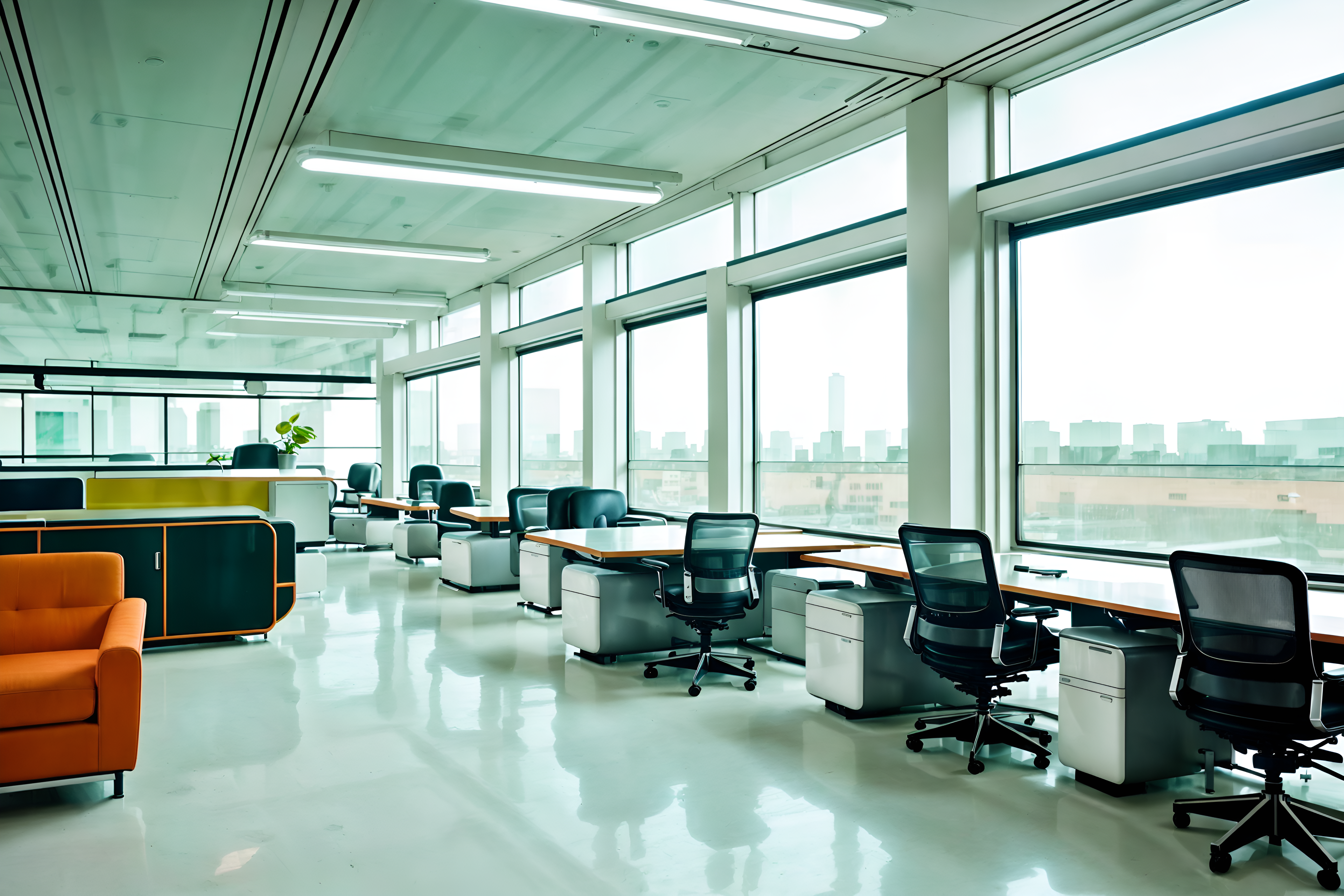 retro futuristic officesinterior decorate this office with retro futuristic style. . . with windows and office chairs and cabinets and seating area with sofa and office desks and plants and computer desks and desk lamps. . with monochromatic palette and steel finishing and glass panes and strong geometric walls and futuristic interior and smooth marble and futurism minimalist interior and neutral background and bright accents. . .