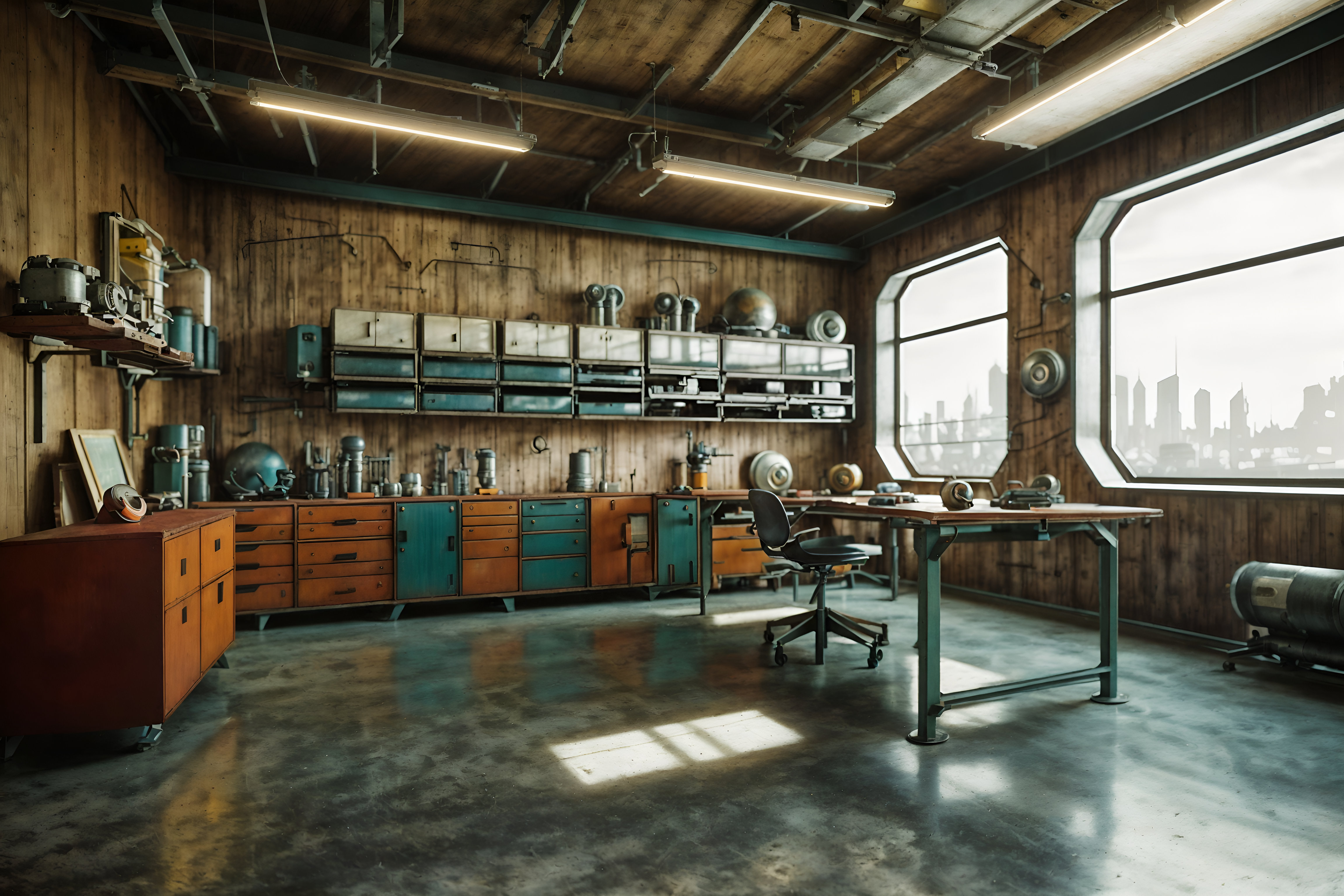 photo from pinterest of retro futuristic-style interior designed (workshop interior) with tool wall and messy and wooden workbench and tool wall. . with futurism minimalist interior and floating surfaces and vintage futurism and strong geometric walls and circular shapes and glass panes and neutral background and bright accents and steel finishing. . cinematic photo, highly detailed, cinematic lighting, ultra-detailed, ultrarealistic, photorealism, 8k. trending on pinterest. retro futuristic interior design style. masterpiece, cinematic light, ultrarealistic+, photorealistic+, 8k, raw photo, realistic, sharp focus on eyes, (symmetrical eyes), (intact eyes), hyperrealistic, highest quality, best quality, , highly detailed, masterpiece, best quality, extremely detailed 8k wallpaper, masterpiece, best quality, ultra-detailed, best shadow, detailed background, detailed face, detailed eyes, high contrast, best illumination, detailed face, dulux, caustic, dynamic angle, detailed glow. dramatic lighting. highly detailed, insanely detailed hair, symmetrical, intricate details, professionally retouched, 8k high definition. strong bokeh. award winning photo.