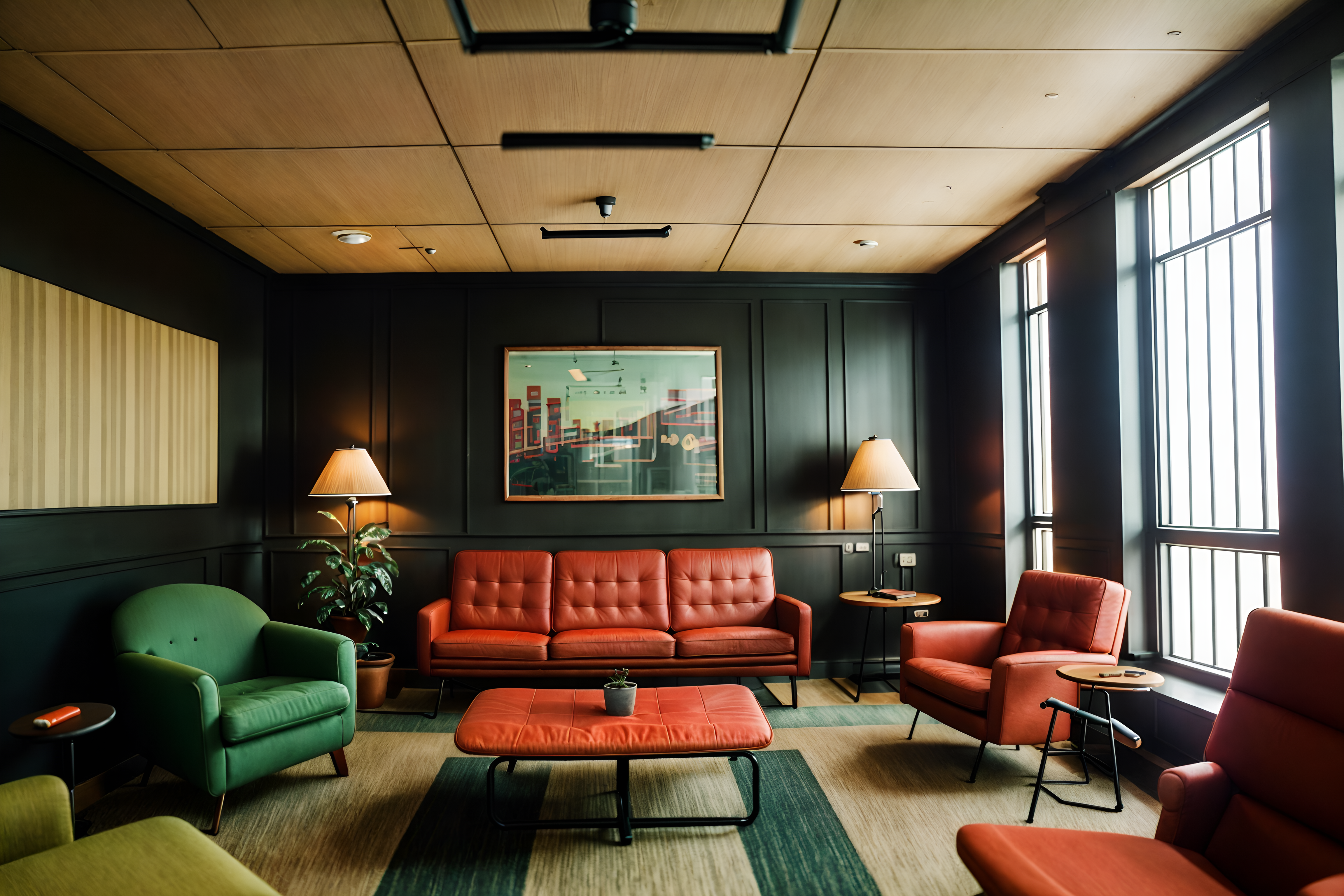 photo from pinterest of retro-style interior designed (coworking space interior) with lounge chairs and office desks and office chairs and seating area with sofa and lounge chairs cinematic photo, highly detailed, cinematic lighting, ultra-detailed, ultrarealistic, photorealism, 8k. trending on pinterest. retro interior design style. masterpiece, cinematic light, ultrarealistic+, photorealistic+, 8k, raw photo, realistic, sharp focus on eyes, (symmetrical eyes), (intact eyes), hyperrealistic, highest quality, best quality, , highly detailed, masterpiece, best quality, extremely detailed 8k wallpaper, masterpiece, best quality, ultra-detailed, best shadow, detailed background, detailed face, detailed eyes, high contrast, best illumination, detailed face, dulux, caustic, dynamic angle, detailed glow. dramatic lighting. highly detailed, insanely detailed hair, symmetrical, intricate details, professionally retouched, 8k high definition. strong bokeh. award winning photo.