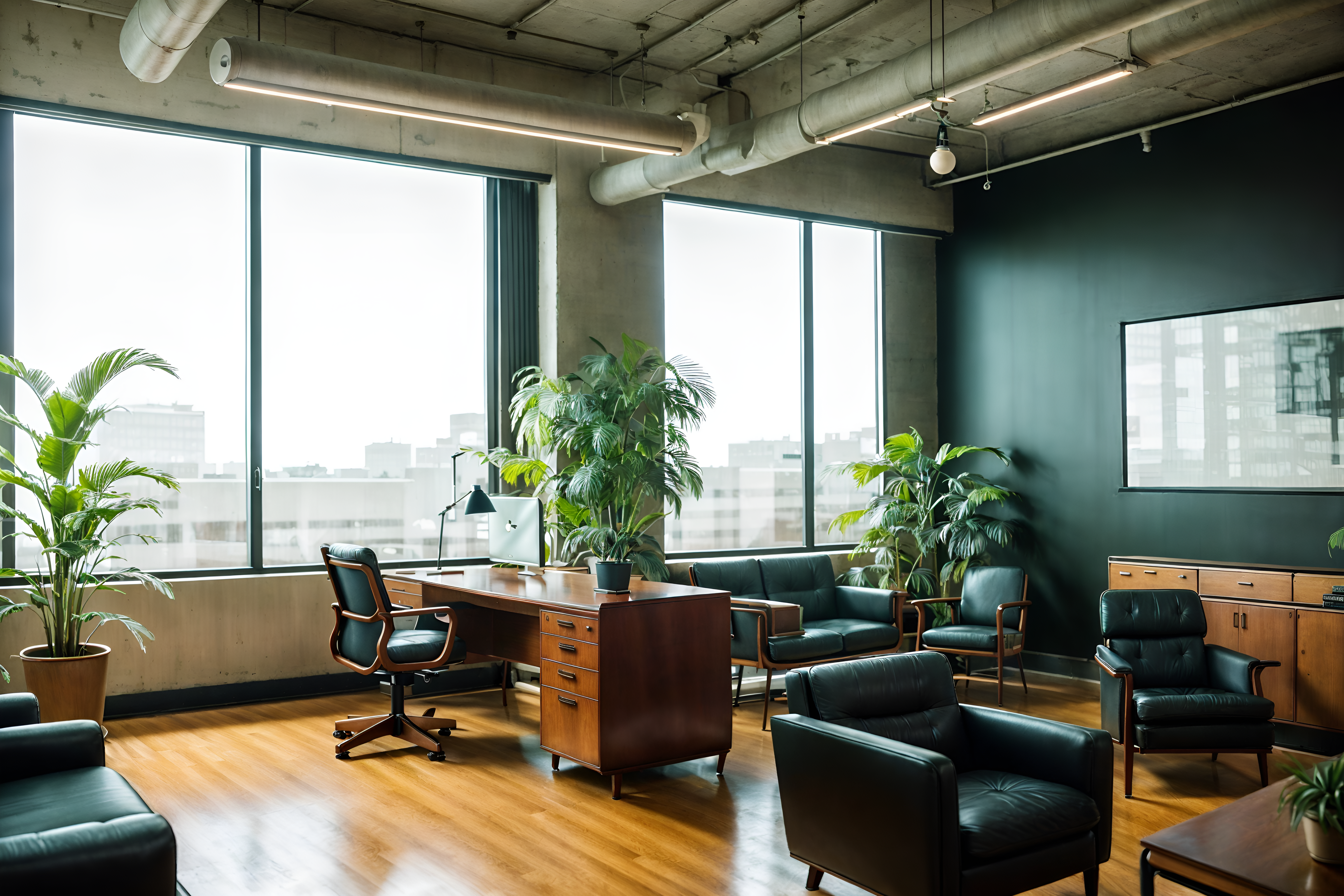 photo from pinterest of retro-style interior designed (office interior) with windows and computer desks and plants and desk lamps and office desks and seating area with sofa and office chairs and lounge chairs cinematic photo, highly detailed, cinematic lighting, ultra-detailed, ultrarealistic, photorealism, 8k. trending on pinterest. retro interior design style. masterpiece, cinematic light, ultrarealistic+, photorealistic+, 8k, raw photo, realistic, sharp focus on eyes, (symmetrical eyes), (intact eyes), hyperrealistic, highest quality, best quality, , highly detailed, masterpiece, best quality, extremely detailed 8k wallpaper, masterpiece, best quality, ultra-detailed, best shadow, detailed background, detailed face, detailed eyes, high contrast, best illumination, detailed face, dulux, caustic, dynamic angle, detailed glow. dramatic lighting. highly detailed, insanely detailed hair, symmetrical, intricate details, professionally retouched, 8k high definition. strong bokeh. award winning photo.