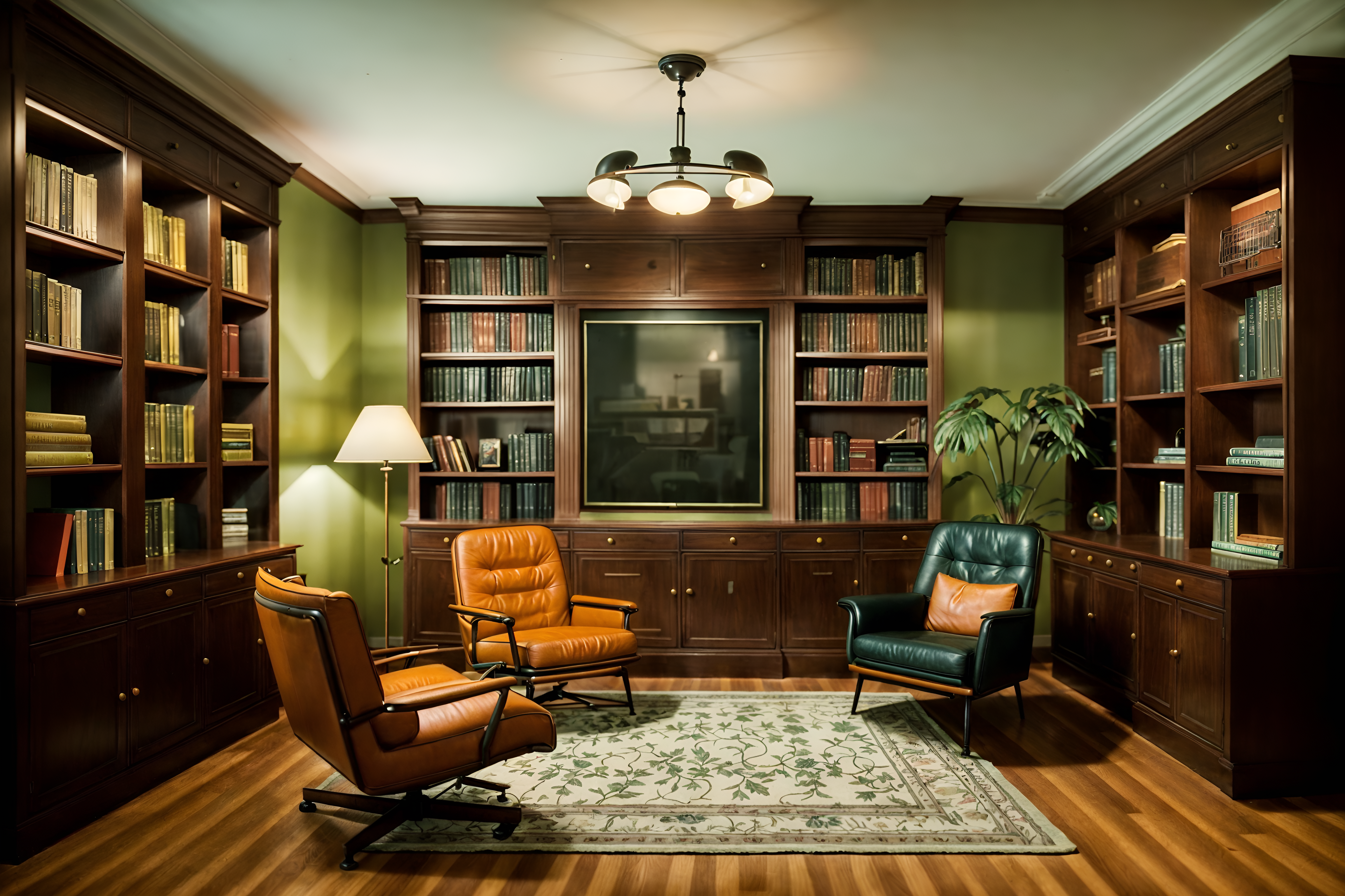 photo from pinterest of retro-style interior designed (study room interior) with lounge chair and cabinets and office chair and plant and bookshelves and writing desk and desk lamp and lounge chair cinematic photo, highly detailed, cinematic lighting, ultra-detailed, ultrarealistic, photorealism, 8k. trending on pinterest. retro interior design style. masterpiece, cinematic light, ultrarealistic+, photorealistic+, 8k, raw photo, realistic, sharp focus on eyes, (symmetrical eyes), (intact eyes), hyperrealistic, highest quality, best quality, , highly detailed, masterpiece, best quality, extremely detailed 8k wallpaper, masterpiece, best quality, ultra-detailed, best shadow, detailed background, detailed face, detailed eyes, high contrast, best illumination, detailed face, dulux, caustic, dynamic angle, detailed glow. dramatic lighting. highly detailed, insanely detailed hair, symmetrical, intricate details, professionally retouched, 8k high definition. strong bokeh. award winning photo.