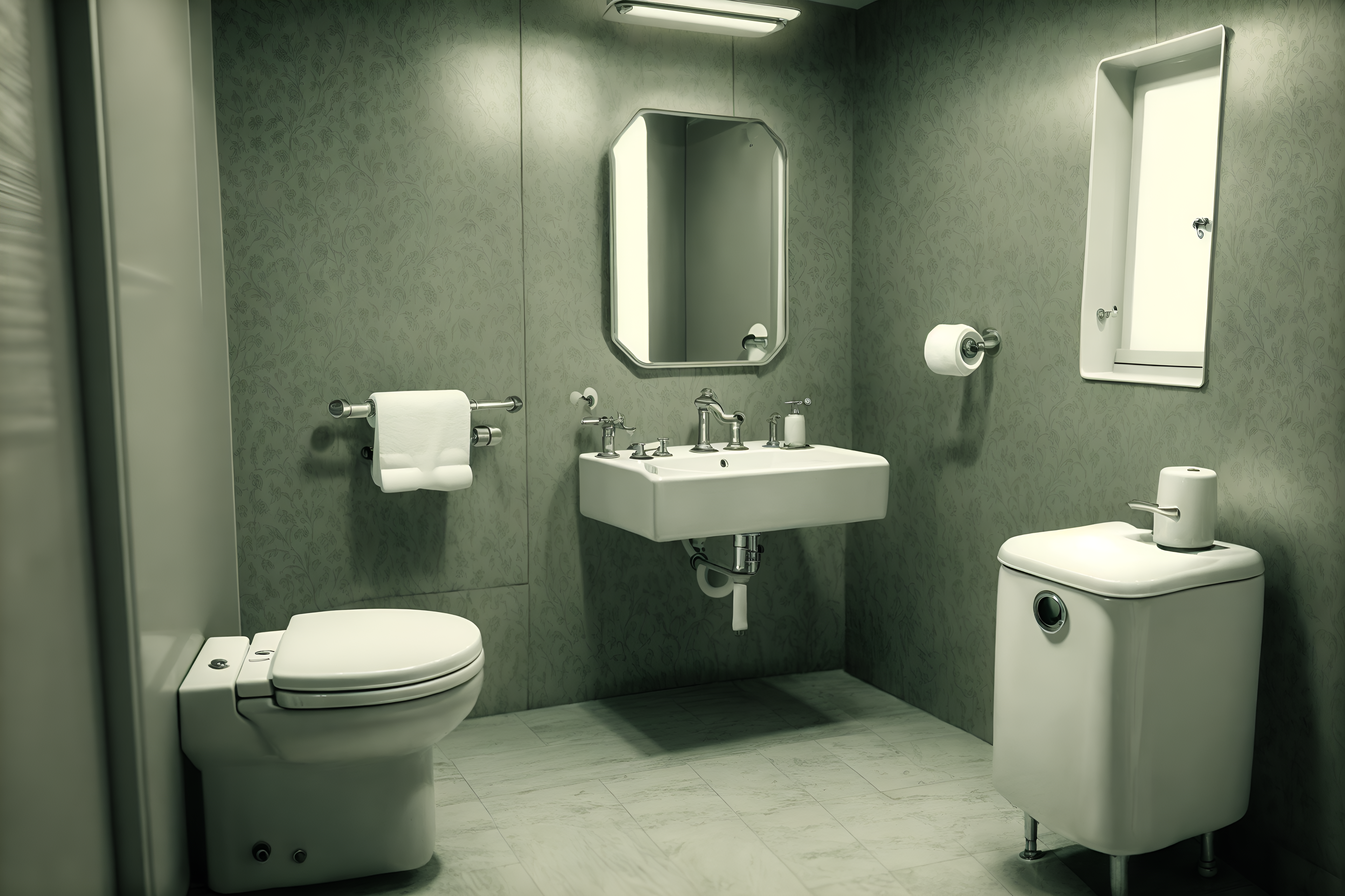 photo from pinterest of retro-style interior designed (toilet interior) with sink with tap and toilet with toilet seat up and toilet paper hanger and sink with tap cinematic photo, highly detailed, cinematic lighting, ultra-detailed, ultrarealistic, photorealism, 8k. trending on pinterest. retro interior design style. masterpiece, cinematic light, ultrarealistic+, photorealistic+, 8k, raw photo, realistic, sharp focus on eyes, (symmetrical eyes), (intact eyes), hyperrealistic, highest quality, best quality, , highly detailed, masterpiece, best quality, extremely detailed 8k wallpaper, masterpiece, best quality, ultra-detailed, best shadow, detailed background, detailed face, detailed eyes, high contrast, best illumination, detailed face, dulux, caustic, dynamic angle, detailed glow. dramatic lighting. highly detailed, insanely detailed hair, symmetrical, intricate details, professionally retouched, 8k high definition. strong bokeh. award winning photo.