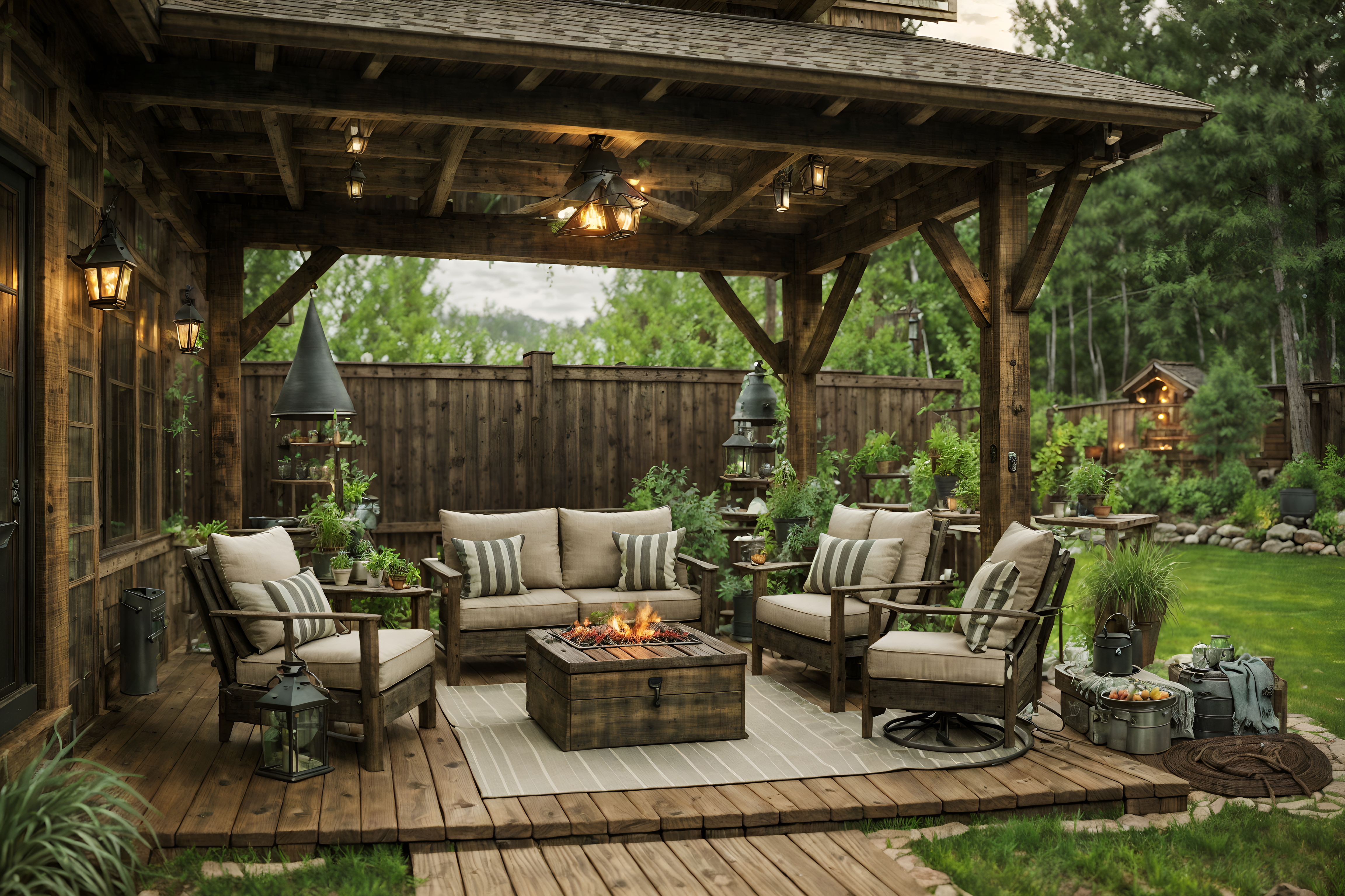 photo from pinterest of rustic-style designed (outdoor patio ) with plant and deck with deck chairs and patio couch with pillows and barbeque or grill and grass and plant. . with . . cinematic photo, highly detailed, cinematic lighting, ultra-detailed, ultrarealistic, photorealism, 8k. trending on pinterest. rustic design style. masterpiece, cinematic light, ultrarealistic+, photorealistic+, 8k, raw photo, realistic, sharp focus on eyes, (symmetrical eyes), (intact eyes), hyperrealistic, highest quality, best quality, , highly detailed, masterpiece, best quality, extremely detailed 8k wallpaper, masterpiece, best quality, ultra-detailed, best shadow, detailed background, detailed face, detailed eyes, high contrast, best illumination, detailed face, dulux, caustic, dynamic angle, detailed glow. dramatic lighting. highly detailed, insanely detailed hair, symmetrical, intricate details, professionally retouched, 8k high definition. strong bokeh. award winning photo.