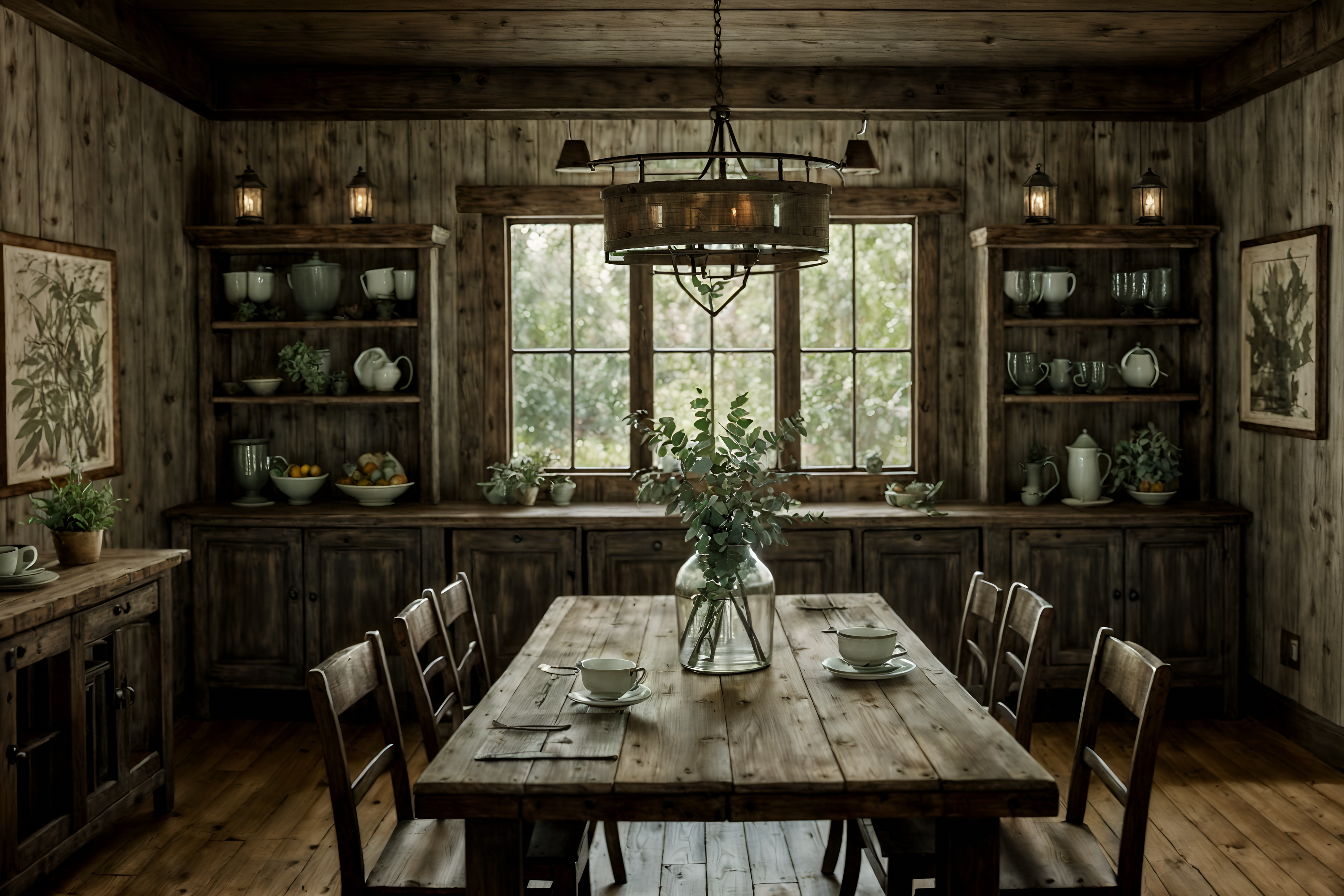 photo from pinterest of rustic-style interior designed (dining room interior) with bookshelves and table cloth and plates, cutlery and glasses on dining table and dining table and painting or photo on wall and vase and plant and dining table chairs. . with . . cinematic photo, highly detailed, cinematic lighting, ultra-detailed, ultrarealistic, photorealism, 8k. trending on pinterest. rustic interior design style. masterpiece, cinematic light, ultrarealistic+, photorealistic+, 8k, raw photo, realistic, sharp focus on eyes, (symmetrical eyes), (intact eyes), hyperrealistic, highest quality, best quality, , highly detailed, masterpiece, best quality, extremely detailed 8k wallpaper, masterpiece, best quality, ultra-detailed, best shadow, detailed background, detailed face, detailed eyes, high contrast, best illumination, detailed face, dulux, caustic, dynamic angle, detailed glow. dramatic lighting. highly detailed, insanely detailed hair, symmetrical, intricate details, professionally retouched, 8k high definition. strong bokeh. award winning photo.