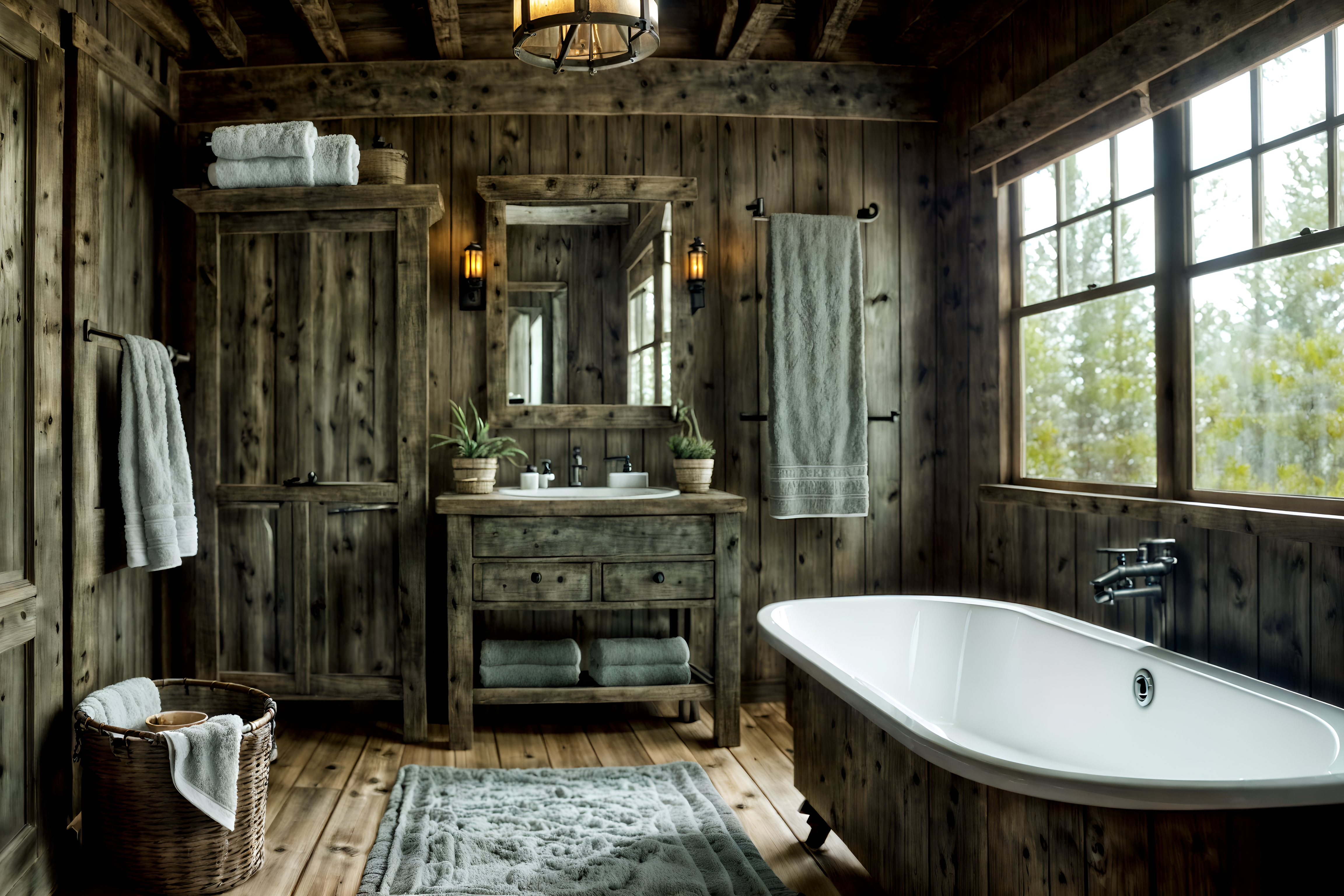 photo from pinterest of rustic-style interior designed (hotel bathroom interior) with bath rail and bathroom cabinet and plant and bath towel and toilet seat and waste basket and mirror and bathtub. . with . . cinematic photo, highly detailed, cinematic lighting, ultra-detailed, ultrarealistic, photorealism, 8k. trending on pinterest. rustic interior design style. masterpiece, cinematic light, ultrarealistic+, photorealistic+, 8k, raw photo, realistic, sharp focus on eyes, (symmetrical eyes), (intact eyes), hyperrealistic, highest quality, best quality, , highly detailed, masterpiece, best quality, extremely detailed 8k wallpaper, masterpiece, best quality, ultra-detailed, best shadow, detailed background, detailed face, detailed eyes, high contrast, best illumination, detailed face, dulux, caustic, dynamic angle, detailed glow. dramatic lighting. highly detailed, insanely detailed hair, symmetrical, intricate details, professionally retouched, 8k high definition. strong bokeh. award winning photo.