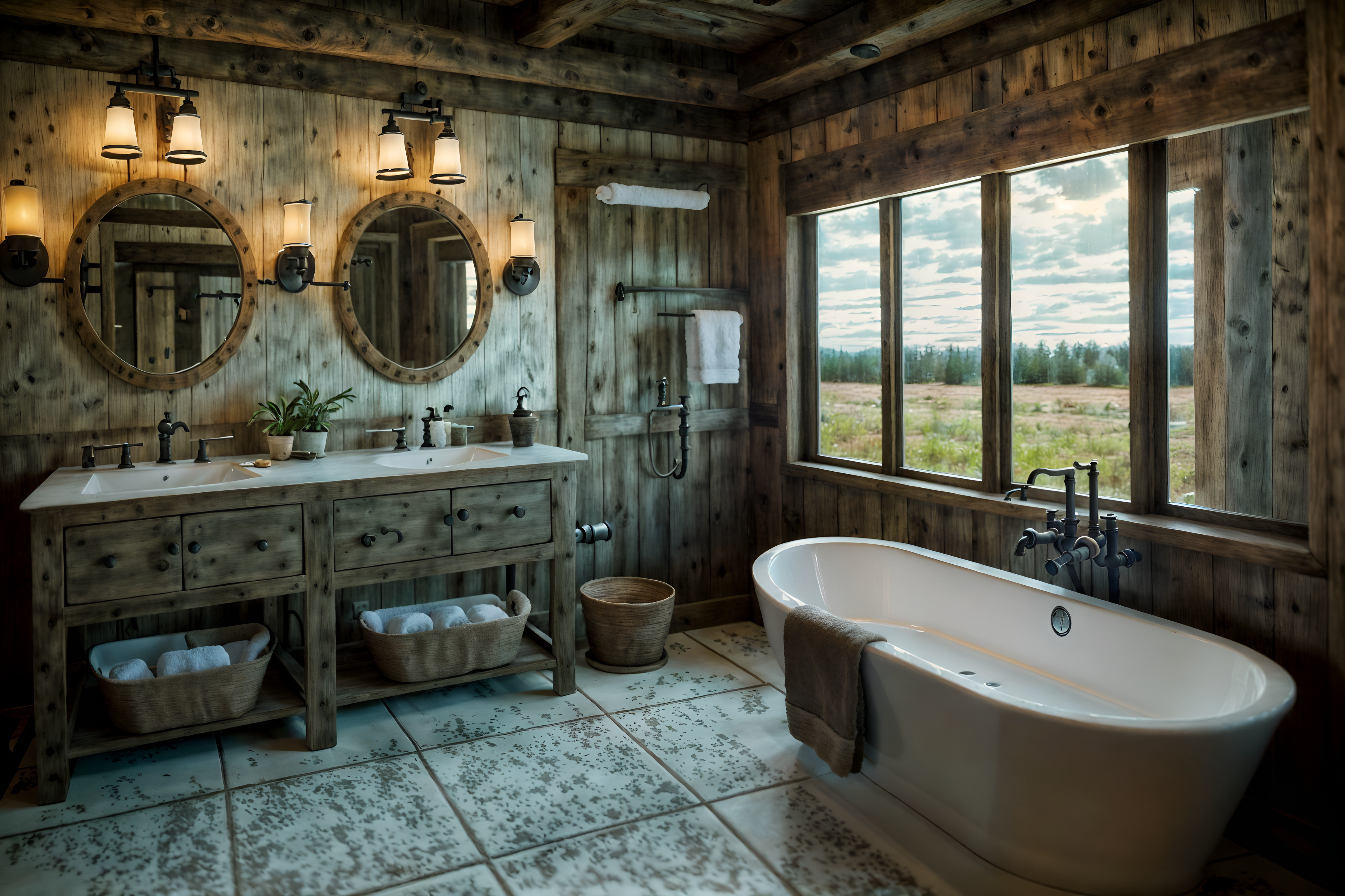 photo from pinterest of rustic-style interior designed (hotel bathroom interior) with toilet seat and bathroom sink with faucet and shower and mirror and bathtub and plant and bath towel and bathroom cabinet. . with . . cinematic photo, highly detailed, cinematic lighting, ultra-detailed, ultrarealistic, photorealism, 8k. trending on pinterest. rustic interior design style. masterpiece, cinematic light, ultrarealistic+, photorealistic+, 8k, raw photo, realistic, sharp focus on eyes, (symmetrical eyes), (intact eyes), hyperrealistic, highest quality, best quality, , highly detailed, masterpiece, best quality, extremely detailed 8k wallpaper, masterpiece, best quality, ultra-detailed, best shadow, detailed background, detailed face, detailed eyes, high contrast, best illumination, detailed face, dulux, caustic, dynamic angle, detailed glow. dramatic lighting. highly detailed, insanely detailed hair, symmetrical, intricate details, professionally retouched, 8k high definition. strong bokeh. award winning photo.