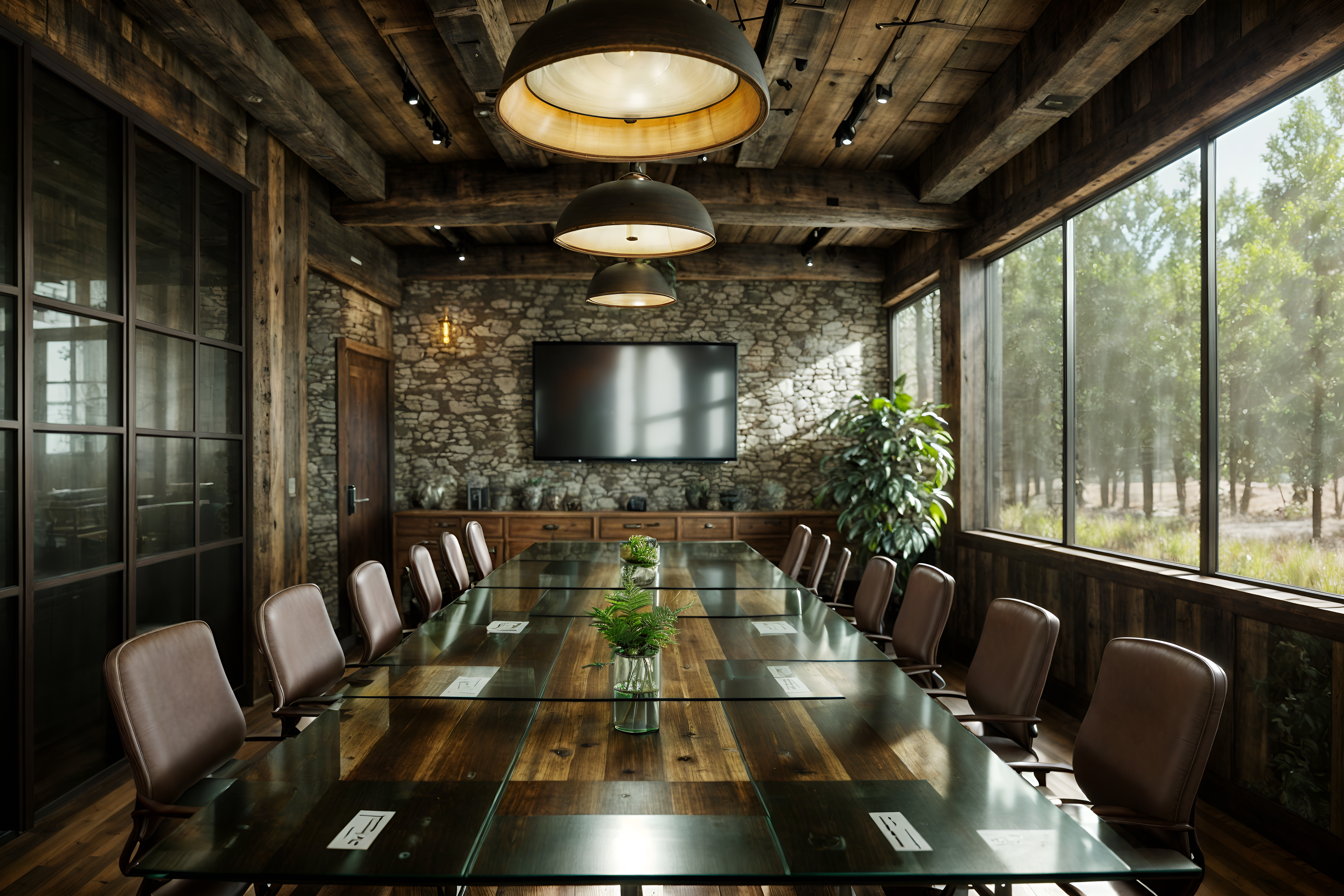 photo from pinterest of rustic-style interior designed (meeting room interior) with cabinets and boardroom table and vase and painting or photo on wall and office chairs and glass walls and plant and glass doors. . with . . cinematic photo, highly detailed, cinematic lighting, ultra-detailed, ultrarealistic, photorealism, 8k. trending on pinterest. rustic interior design style. masterpiece, cinematic light, ultrarealistic+, photorealistic+, 8k, raw photo, realistic, sharp focus on eyes, (symmetrical eyes), (intact eyes), hyperrealistic, highest quality, best quality, , highly detailed, masterpiece, best quality, extremely detailed 8k wallpaper, masterpiece, best quality, ultra-detailed, best shadow, detailed background, detailed face, detailed eyes, high contrast, best illumination, detailed face, dulux, caustic, dynamic angle, detailed glow. dramatic lighting. highly detailed, insanely detailed hair, symmetrical, intricate details, professionally retouched, 8k high definition. strong bokeh. award winning photo.