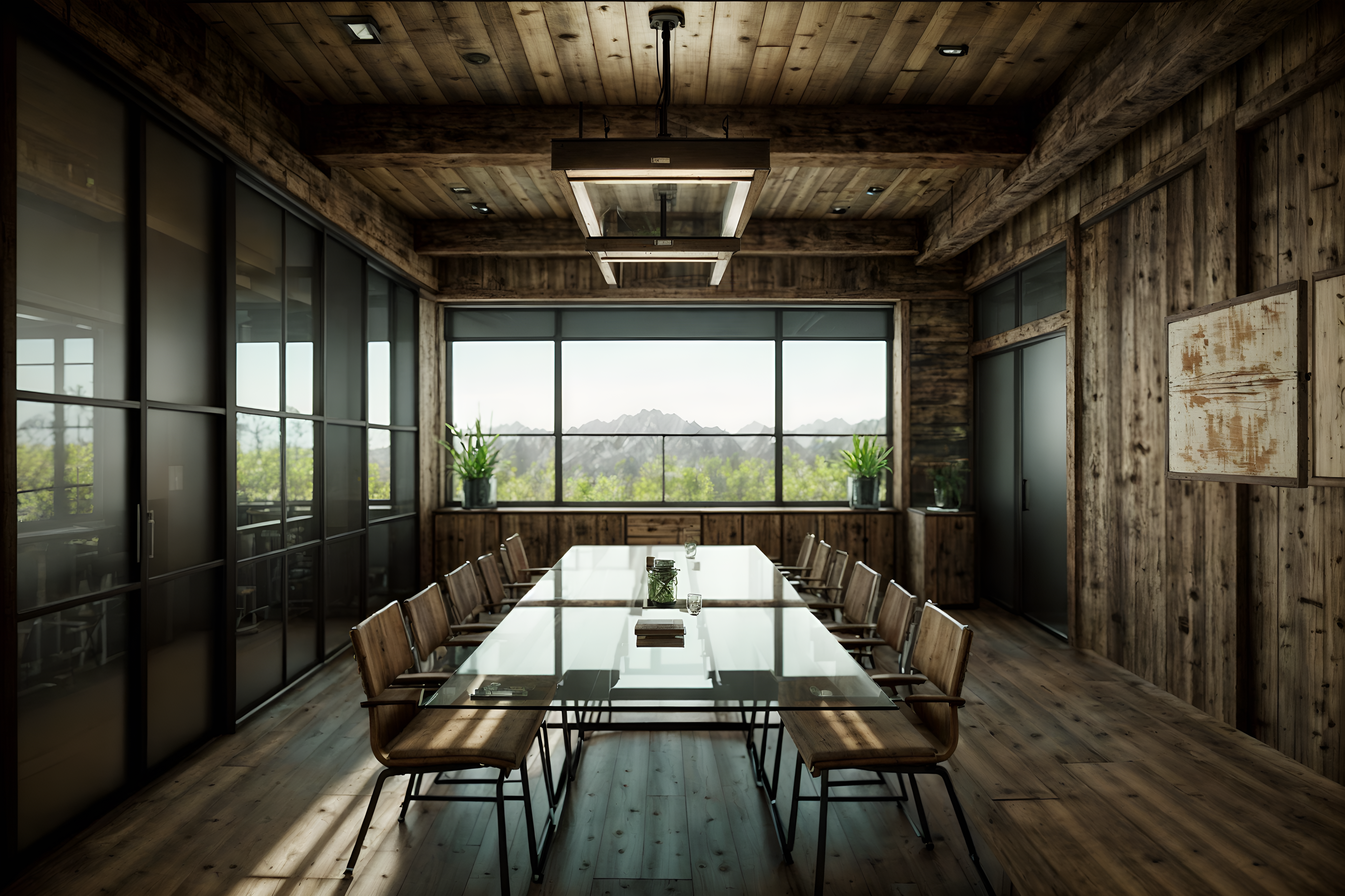photo from pinterest of rustic-style interior designed (meeting room interior) with cabinets and boardroom table and vase and painting or photo on wall and office chairs and glass walls and plant and glass doors. . with . . cinematic photo, highly detailed, cinematic lighting, ultra-detailed, ultrarealistic, photorealism, 8k. trending on pinterest. rustic interior design style. masterpiece, cinematic light, ultrarealistic+, photorealistic+, 8k, raw photo, realistic, sharp focus on eyes, (symmetrical eyes), (intact eyes), hyperrealistic, highest quality, best quality, , highly detailed, masterpiece, best quality, extremely detailed 8k wallpaper, masterpiece, best quality, ultra-detailed, best shadow, detailed background, detailed face, detailed eyes, high contrast, best illumination, detailed face, dulux, caustic, dynamic angle, detailed glow. dramatic lighting. highly detailed, insanely detailed hair, symmetrical, intricate details, professionally retouched, 8k high definition. strong bokeh. award winning photo.