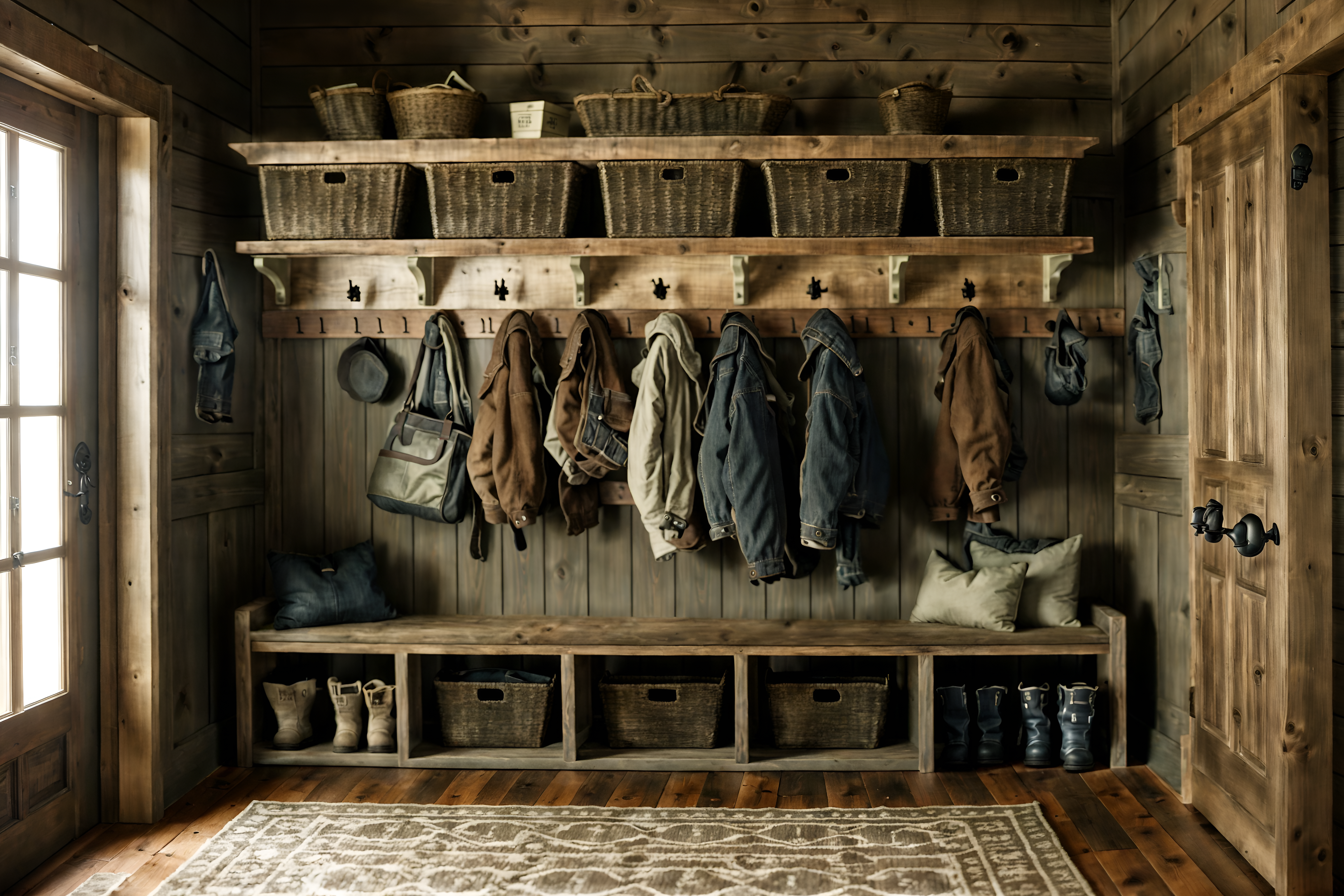 photo from pinterest of rustic-style interior designed (mudroom interior) with a bench and shelves for shoes and storage baskets and wall hooks for coats and cubbies and storage drawers and cabinets and high up storage. . with . . cinematic photo, highly detailed, cinematic lighting, ultra-detailed, ultrarealistic, photorealism, 8k. trending on pinterest. rustic interior design style. masterpiece, cinematic light, ultrarealistic+, photorealistic+, 8k, raw photo, realistic, sharp focus on eyes, (symmetrical eyes), (intact eyes), hyperrealistic, highest quality, best quality, , highly detailed, masterpiece, best quality, extremely detailed 8k wallpaper, masterpiece, best quality, ultra-detailed, best shadow, detailed background, detailed face, detailed eyes, high contrast, best illumination, detailed face, dulux, caustic, dynamic angle, detailed glow. dramatic lighting. highly detailed, insanely detailed hair, symmetrical, intricate details, professionally retouched, 8k high definition. strong bokeh. award winning photo.