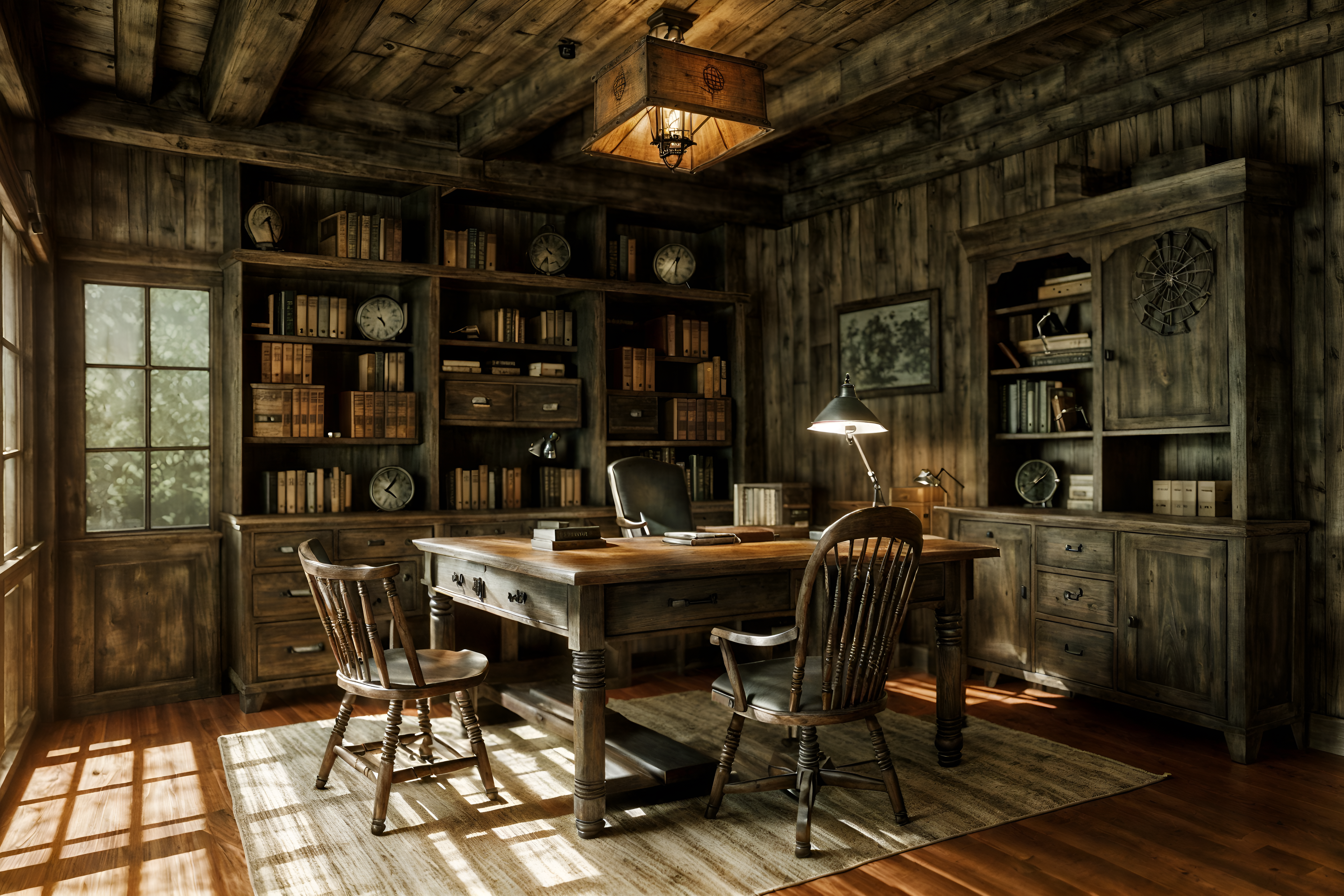 photo from pinterest of rustic-style interior designed (study room interior) with office chair and writing desk and cabinets and desk lamp and lounge chair and bookshelves and plant and office chair. . with . . cinematic photo, highly detailed, cinematic lighting, ultra-detailed, ultrarealistic, photorealism, 8k. trending on pinterest. rustic interior design style. masterpiece, cinematic light, ultrarealistic+, photorealistic+, 8k, raw photo, realistic, sharp focus on eyes, (symmetrical eyes), (intact eyes), hyperrealistic, highest quality, best quality, , highly detailed, masterpiece, best quality, extremely detailed 8k wallpaper, masterpiece, best quality, ultra-detailed, best shadow, detailed background, detailed face, detailed eyes, high contrast, best illumination, detailed face, dulux, caustic, dynamic angle, detailed glow. dramatic lighting. highly detailed, insanely detailed hair, symmetrical, intricate details, professionally retouched, 8k high definition. strong bokeh. award winning photo.