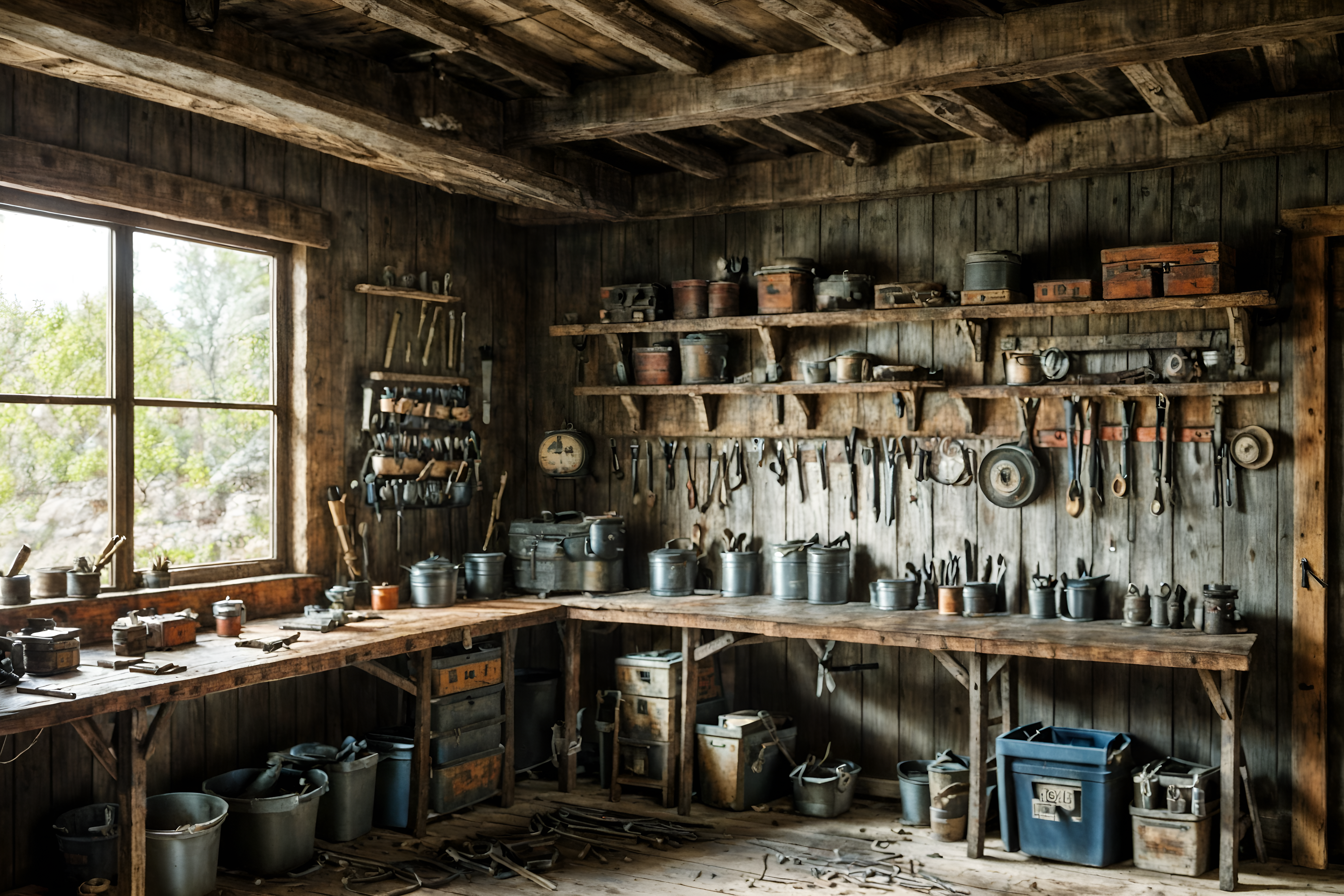 photo from pinterest of rustic-style interior designed (workshop interior) with tool wall and messy and wooden workbench and tool wall. . with . . cinematic photo, highly detailed, cinematic lighting, ultra-detailed, ultrarealistic, photorealism, 8k. trending on pinterest. rustic interior design style. masterpiece, cinematic light, ultrarealistic+, photorealistic+, 8k, raw photo, realistic, sharp focus on eyes, (symmetrical eyes), (intact eyes), hyperrealistic, highest quality, best quality, , highly detailed, masterpiece, best quality, extremely detailed 8k wallpaper, masterpiece, best quality, ultra-detailed, best shadow, detailed background, detailed face, detailed eyes, high contrast, best illumination, detailed face, dulux, caustic, dynamic angle, detailed glow. dramatic lighting. highly detailed, insanely detailed hair, symmetrical, intricate details, professionally retouched, 8k high definition. strong bokeh. award winning photo.