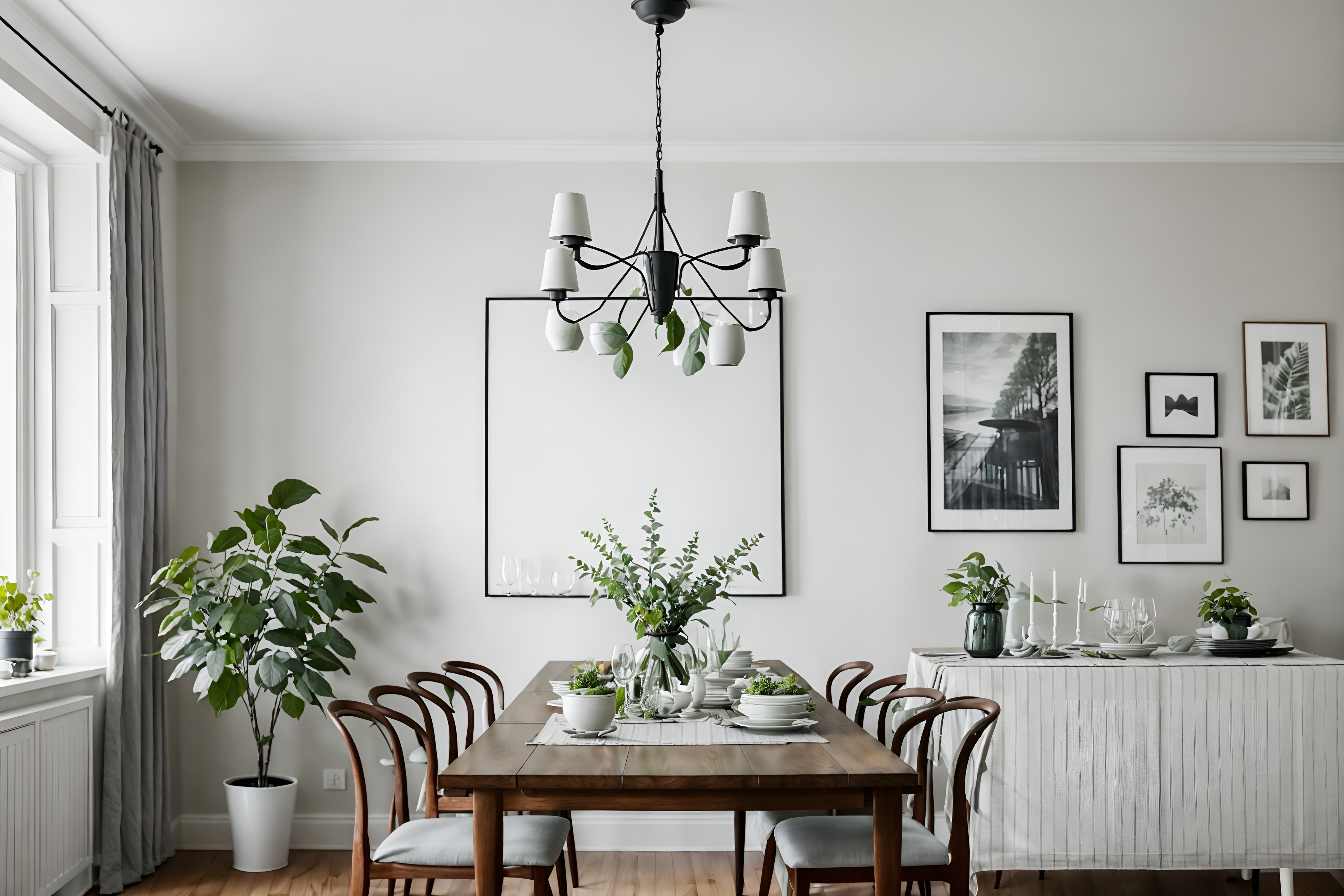 photo from pinterest of scandinavian-style interior designed (dining room interior) with plant and dining table and plates, cutlery and glasses on dining table and dining table chairs and vase and bookshelves and painting or photo on wall and table cloth. . with . . cinematic photo, highly detailed, cinematic lighting, ultra-detailed, ultrarealistic, photorealism, 8k. trending on pinterest. scandinavian interior design style. masterpiece, cinematic light, ultrarealistic+, photorealistic+, 8k, raw photo, realistic, sharp focus on eyes, (symmetrical eyes), (intact eyes), hyperrealistic, highest quality, best quality, , highly detailed, masterpiece, best quality, extremely detailed 8k wallpaper, masterpiece, best quality, ultra-detailed, best shadow, detailed background, detailed face, detailed eyes, high contrast, best illumination, detailed face, dulux, caustic, dynamic angle, detailed glow. dramatic lighting. highly detailed, insanely detailed hair, symmetrical, intricate details, professionally retouched, 8k high definition. strong bokeh. award winning photo.