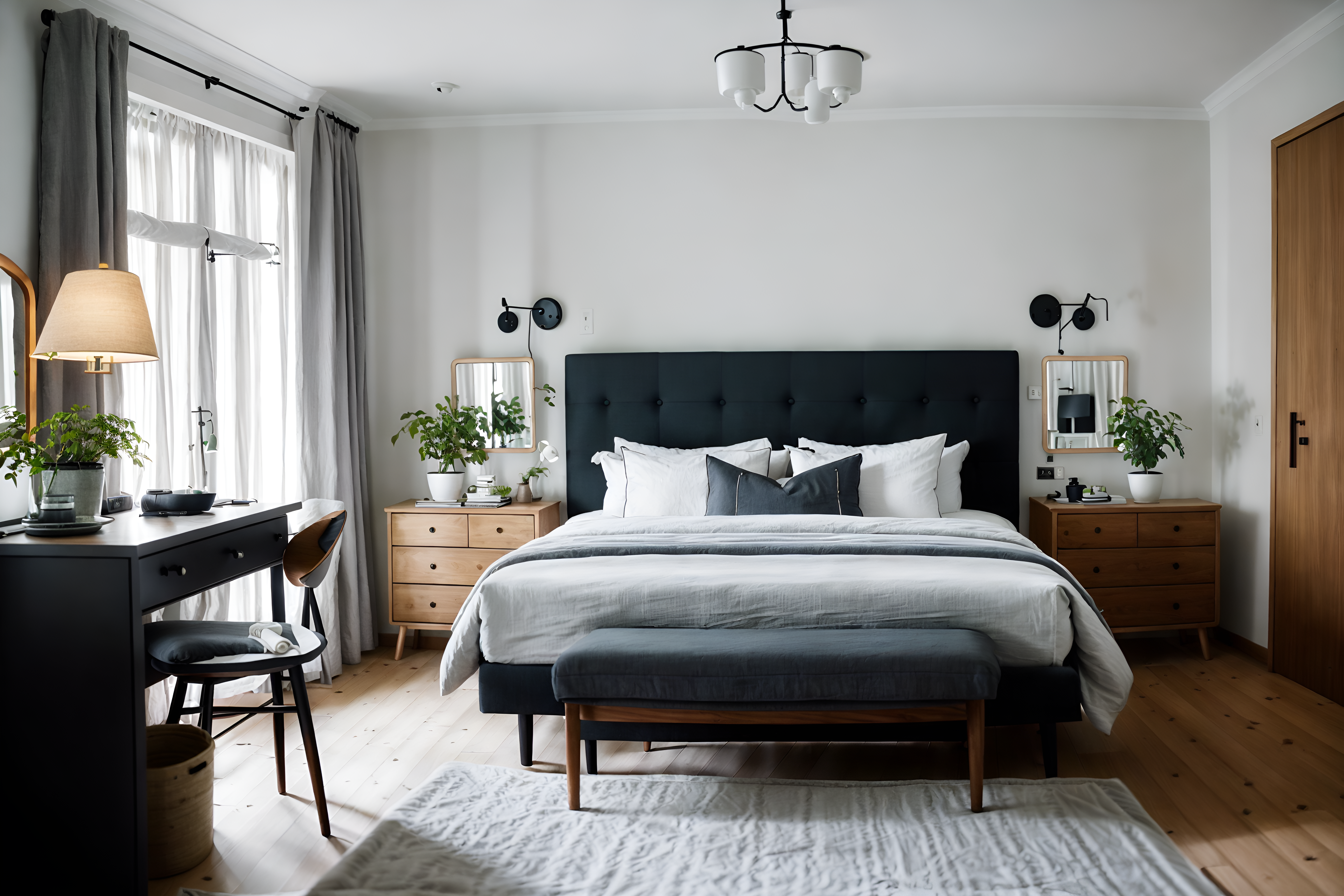 photo from pinterest of scandinavian-style interior designed (hotel room interior) with hotel bathroom and bed and headboard and mirror and bedside table or night stand and plant and storage bench or ottoman and dresser closet. . with . . cinematic photo, highly detailed, cinematic lighting, ultra-detailed, ultrarealistic, photorealism, 8k. trending on pinterest. scandinavian interior design style. masterpiece, cinematic light, ultrarealistic+, photorealistic+, 8k, raw photo, realistic, sharp focus on eyes, (symmetrical eyes), (intact eyes), hyperrealistic, highest quality, best quality, , highly detailed, masterpiece, best quality, extremely detailed 8k wallpaper, masterpiece, best quality, ultra-detailed, best shadow, detailed background, detailed face, detailed eyes, high contrast, best illumination, detailed face, dulux, caustic, dynamic angle, detailed glow. dramatic lighting. highly detailed, insanely detailed hair, symmetrical, intricate details, professionally retouched, 8k high definition. strong bokeh. award winning photo.