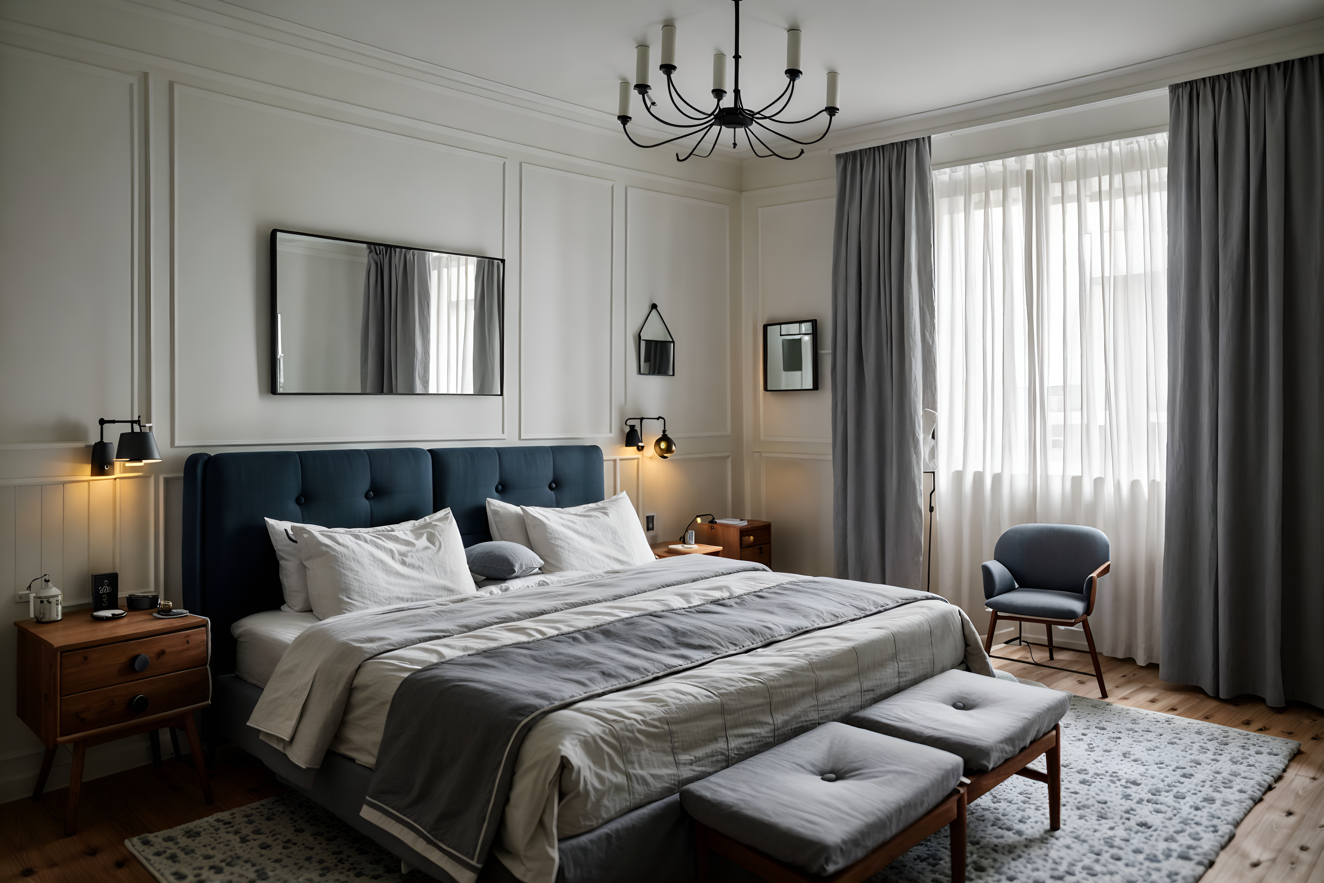photo from pinterest of scandinavian-style interior designed (hotel room interior) with hotel bathroom and bed and headboard and mirror and bedside table or night stand and plant and storage bench or ottoman and dresser closet. . with . . cinematic photo, highly detailed, cinematic lighting, ultra-detailed, ultrarealistic, photorealism, 8k. trending on pinterest. scandinavian interior design style. masterpiece, cinematic light, ultrarealistic+, photorealistic+, 8k, raw photo, realistic, sharp focus on eyes, (symmetrical eyes), (intact eyes), hyperrealistic, highest quality, best quality, , highly detailed, masterpiece, best quality, extremely detailed 8k wallpaper, masterpiece, best quality, ultra-detailed, best shadow, detailed background, detailed face, detailed eyes, high contrast, best illumination, detailed face, dulux, caustic, dynamic angle, detailed glow. dramatic lighting. highly detailed, insanely detailed hair, symmetrical, intricate details, professionally retouched, 8k high definition. strong bokeh. award winning photo.