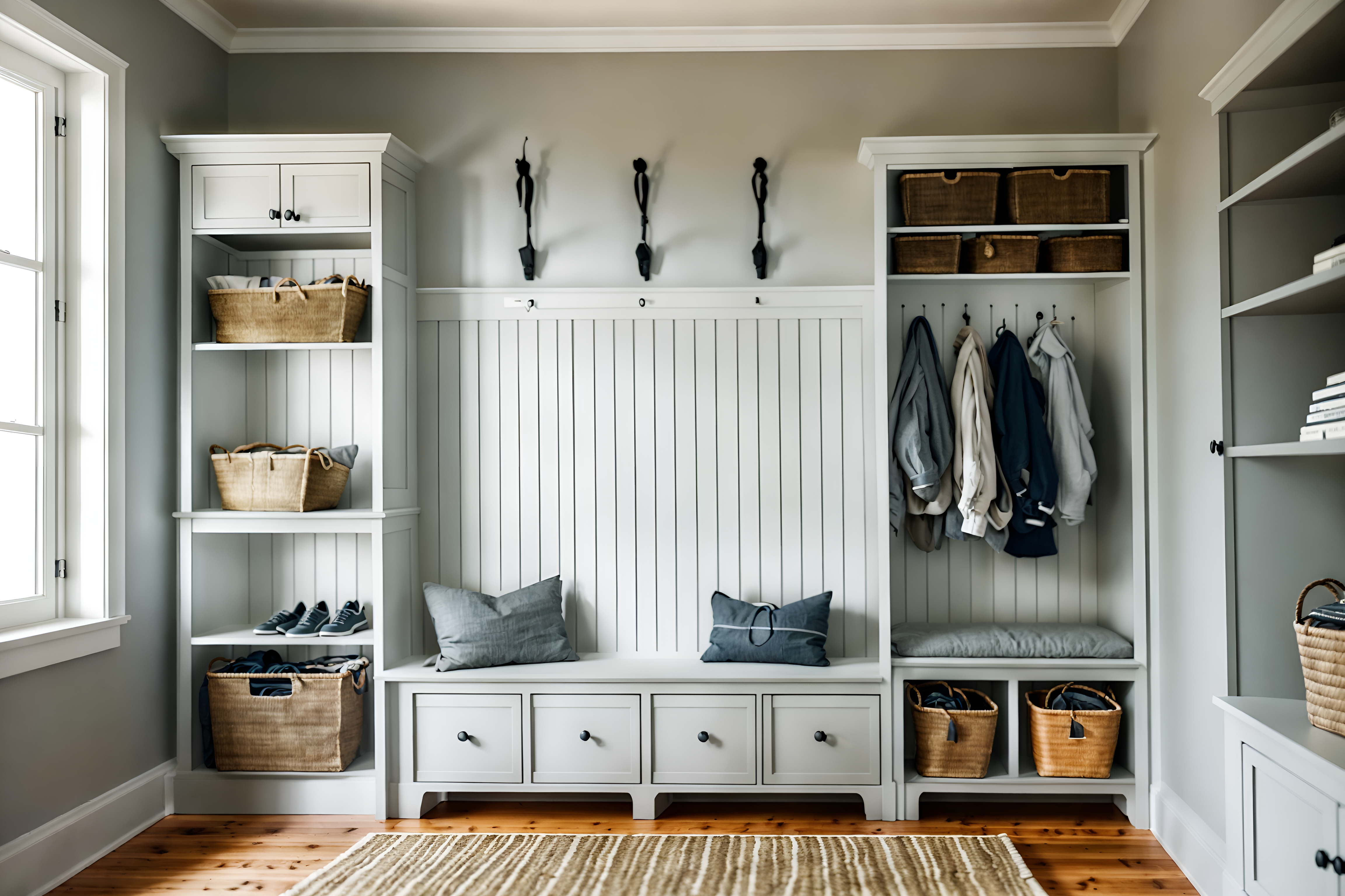 mudroomsinterior decorate this mudroom with hollywood glam style. . . with shelves for shoes and a bench and high up storage and storage baskets and wall hooks for coats and storage drawers and cubbies and cabinets. . with crystal chandeliers and art deco influence and star quality and opulent details and bold colors and metallic accents and glamorous style and dramatic lighting. . .interior decorate this mudroom with modern style. . . with high up storage and a bench and wall hooks for coats and storage baskets and shelves for shoes and storage drawers and cabinets and cubbies. . with natural materials and elements and neutral walls and textures and simple, clean lines and simplistic furniture and open and natural lighting and practicality and functionality and natural materials and elements. . .interior decorate this mudroom with nautical style. . . with shelves for shoes and cabinets and storage drawers and high up storage and wall hooks for coats and a bench and cubbies and storage baskets. . with coastal vibes and rope details and navy blue and crisp white and weathered wood and striped patterns and sailboat elements and ocean inspiration. . .interior decorate this mudroom with eclectic style. . . with storage baskets and cabinets and high up storage and wall hooks for coats and shelves for shoes and storage drawers and cubbies and a bench. . with personal expression and unexpected elements and creative freedom and unique pieces and layered textures and bold combinations and colorful palette and vintage finds. . .interior decorate this mudroom with cyberpunk style. . . with wall hooks for coats and storage baskets and high up storage and storage drawers and cubbies and a bench and shelves for shoes and cabinets. . with clean straight square lines and synthwave and black lights and surrealist paintings and synthetic objects and cyberpunk lights and cyberpunk style and military uniforms and gear. . .interior decorate this mudroom with bohemian style. . . with storage baskets and cubbies and shelves for shoes and a bench and wall hooks for coats and high up storage and storage drawers and cabinets. . with animal hides and natural materials and travel trinkets and bold colors and carefree layers of pattern, texture, and color and woods and mixed patterns and metals. . .interior decorate this mudroom with coastal style. . . with shelves for shoes and storage baskets and a bench and cabinets and high up storage and cubbies and storage drawers and wall hooks for coats. . with airy feel and sand tones and white decor and natural materials and nautical decor and light blue and beach vibes and ocean-inspired. . .interior decorate this mudroom with modern boho style. . . with storage drawers and storage baskets and cabinets and high up storage and cubbies and shelves for shoes and a bench and wall hooks for coats. . with eclectic style and vintage furniture and jute rugs and minimalist and comfortable and airy space and cotton textiles and natural materials. . .interior decorate this mudroom with shabby chic style. . . with a bench and cabinets and storage drawers and shelves for shoes and wall hooks for coats and cubbies and storage baskets and high up storage. . with floral patterns and vintage charm and cottage feel and romantic style and delicate details and pastel colors and distressed furniture and weathered finishes. . .