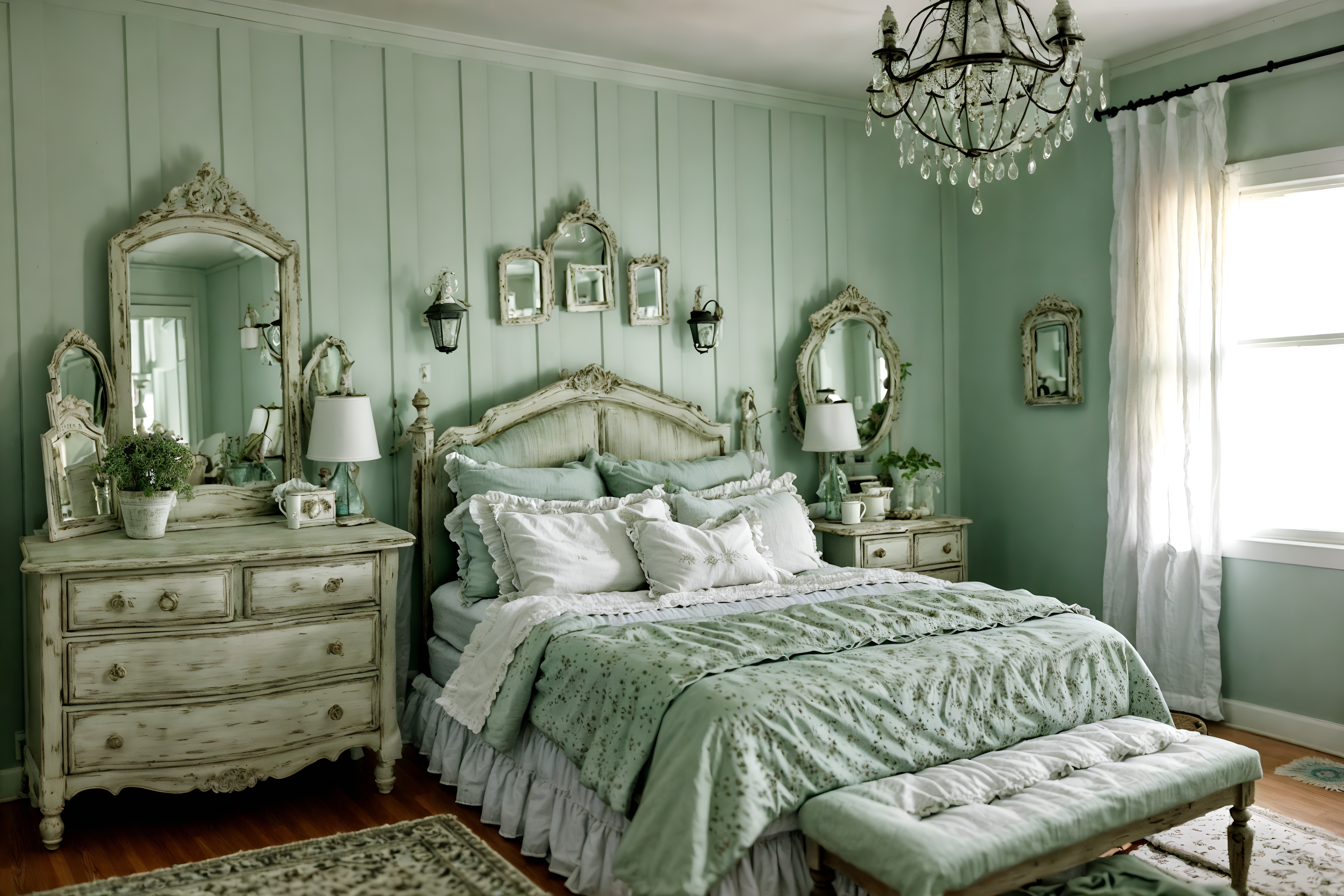photo from pinterest of shabby chic-style interior designed (bedroom interior) with bedside table or night stand and dresser closet and plant and accent chair and mirror and storage bench or ottoman and night light and headboard cinematic photo, highly detailed, cinematic lighting, ultra-detailed, ultrarealistic, photorealism, 8k. trending on pinterest. shabby chic interior design style. masterpiece, cinematic light, ultrarealistic+, photorealistic+, 8k, raw photo, realistic, sharp focus on eyes, (symmetrical eyes), (intact eyes), hyperrealistic, highest quality, best quality, , highly detailed, masterpiece, best quality, extremely detailed 8k wallpaper, masterpiece, best quality, ultra-detailed, best shadow, detailed background, detailed face, detailed eyes, high contrast, best illumination, detailed face, dulux, caustic, dynamic angle, detailed glow. dramatic lighting. highly detailed, insanely detailed hair, symmetrical, intricate details, professionally retouched, 8k high definition. strong bokeh. award winning photo.