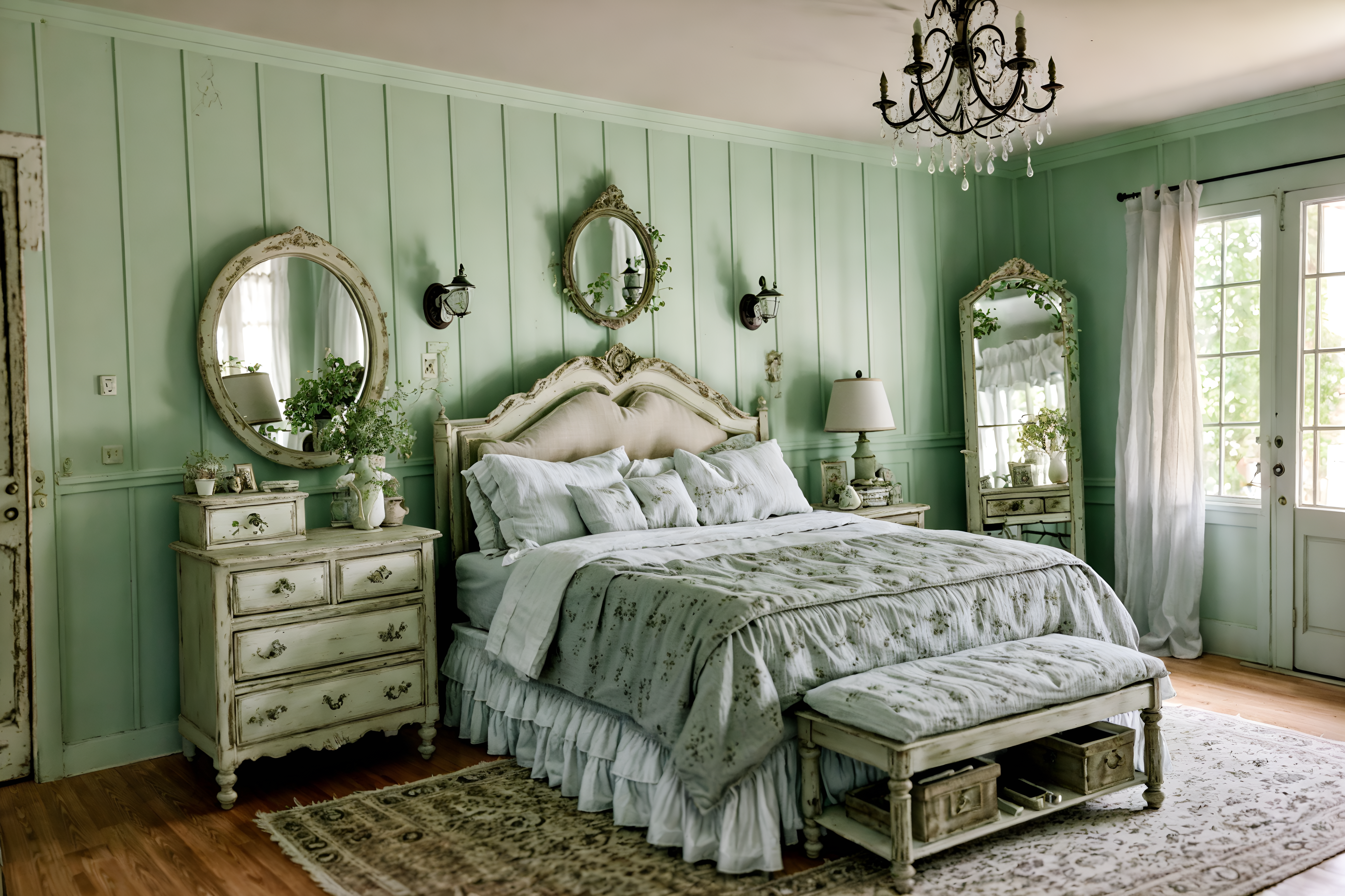 photo from pinterest of shabby chic-style interior designed (bedroom interior) with bedside table or night stand and dresser closet and plant and accent chair and mirror and storage bench or ottoman and night light and headboard cinematic photo, highly detailed, cinematic lighting, ultra-detailed, ultrarealistic, photorealism, 8k. trending on pinterest. shabby chic interior design style. masterpiece, cinematic light, ultrarealistic+, photorealistic+, 8k, raw photo, realistic, sharp focus on eyes, (symmetrical eyes), (intact eyes), hyperrealistic, highest quality, best quality, , highly detailed, masterpiece, best quality, extremely detailed 8k wallpaper, masterpiece, best quality, ultra-detailed, best shadow, detailed background, detailed face, detailed eyes, high contrast, best illumination, detailed face, dulux, caustic, dynamic angle, detailed glow. dramatic lighting. highly detailed, insanely detailed hair, symmetrical, intricate details, professionally retouched, 8k high definition. strong bokeh. award winning photo.