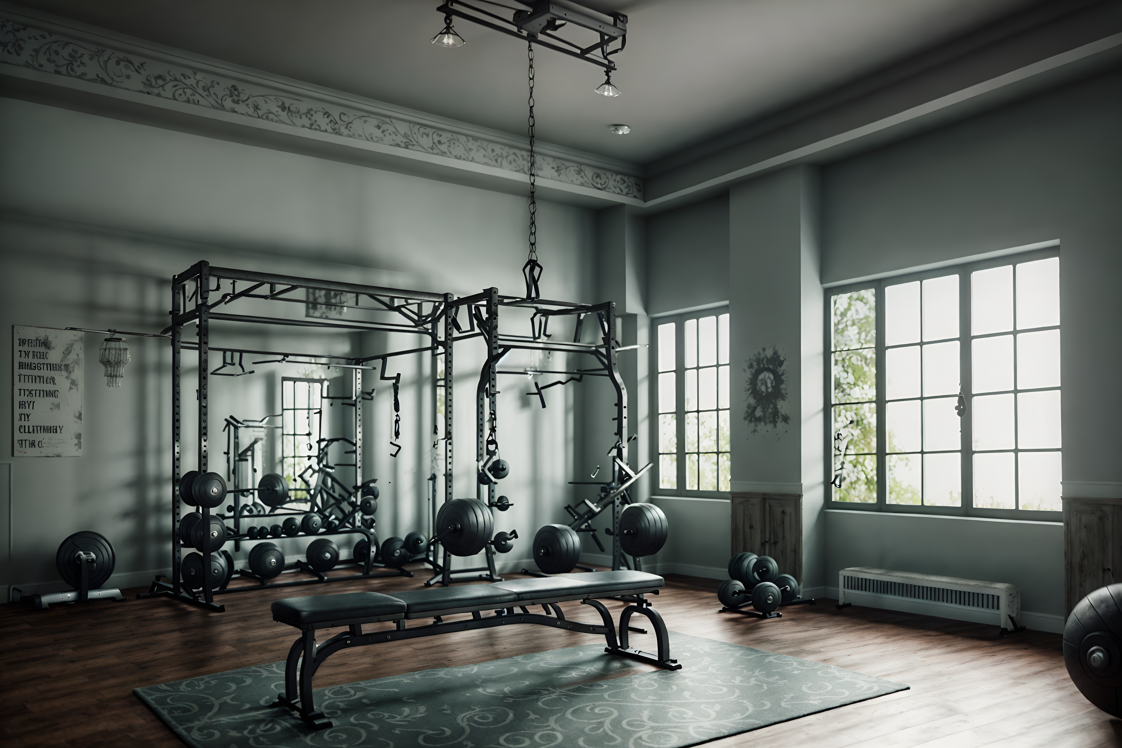 photo from pinterest of shabby chic-style interior designed (fitness gym interior) with dumbbell stand and bench press and exercise bicycle and squat rack and crosstrainer and dumbbell stand cinematic photo, highly detailed, cinematic lighting, ultra-detailed, ultrarealistic, photorealism, 8k. trending on pinterest. shabby chic interior design style. masterpiece, cinematic light, ultrarealistic+, photorealistic+, 8k, raw photo, realistic, sharp focus on eyes, (symmetrical eyes), (intact eyes), hyperrealistic, highest quality, best quality, , highly detailed, masterpiece, best quality, extremely detailed 8k wallpaper, masterpiece, best quality, ultra-detailed, best shadow, detailed background, detailed face, detailed eyes, high contrast, best illumination, detailed face, dulux, caustic, dynamic angle, detailed glow. dramatic lighting. highly detailed, insanely detailed hair, symmetrical, intricate details, professionally retouched, 8k high definition. strong bokeh. award winning photo.