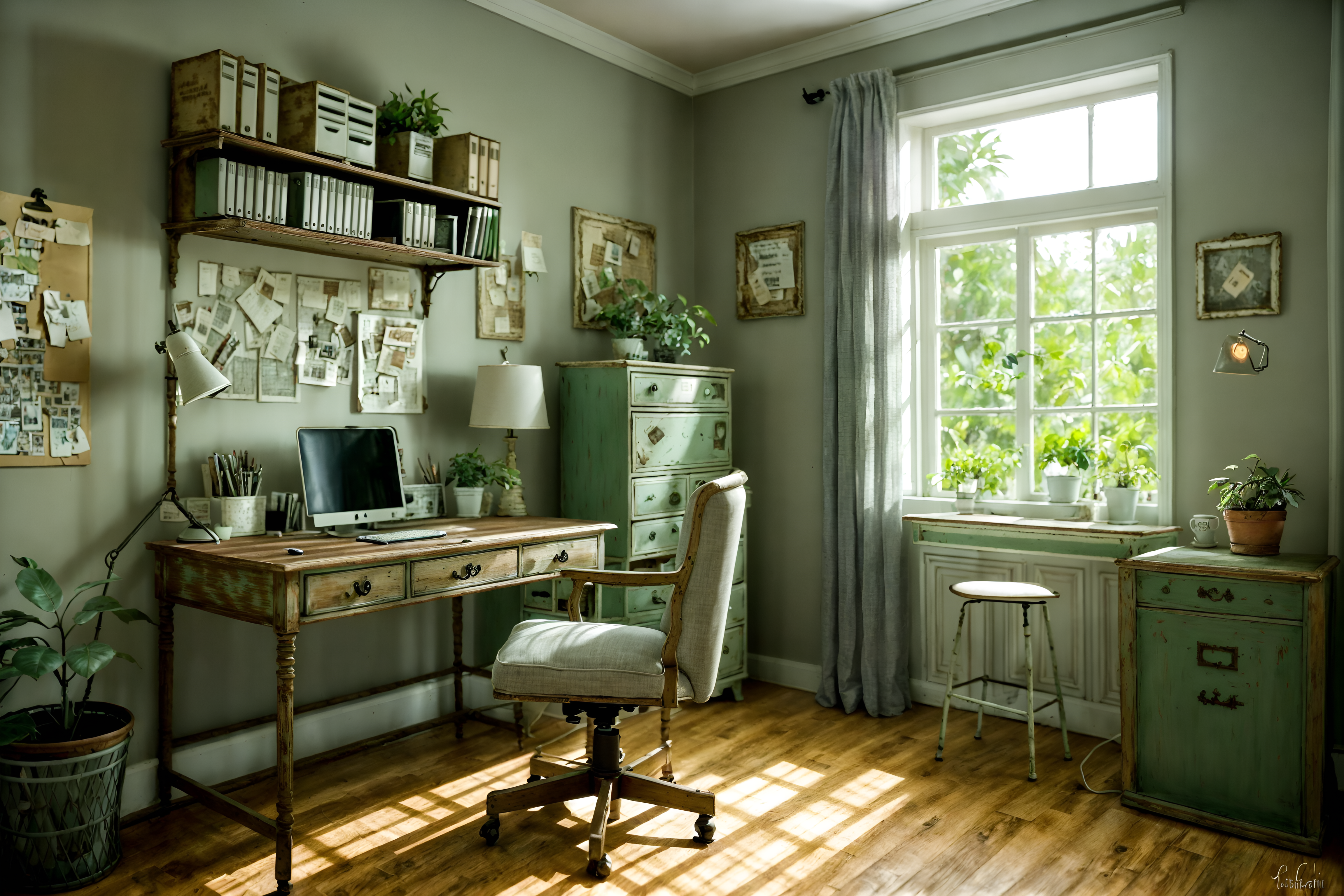 photo from pinterest of shabby chic-style interior designed (home office interior) with computer desk and office chair and plant and desk lamp and cabinets and computer desk cinematic photo, highly detailed, cinematic lighting, ultra-detailed, ultrarealistic, photorealism, 8k. trending on pinterest. shabby chic interior design style. masterpiece, cinematic light, ultrarealistic+, photorealistic+, 8k, raw photo, realistic, sharp focus on eyes, (symmetrical eyes), (intact eyes), hyperrealistic, highest quality, best quality, , highly detailed, masterpiece, best quality, extremely detailed 8k wallpaper, masterpiece, best quality, ultra-detailed, best shadow, detailed background, detailed face, detailed eyes, high contrast, best illumination, detailed face, dulux, caustic, dynamic angle, detailed glow. dramatic lighting. highly detailed, insanely detailed hair, symmetrical, intricate details, professionally retouched, 8k high definition. strong bokeh. award winning photo.