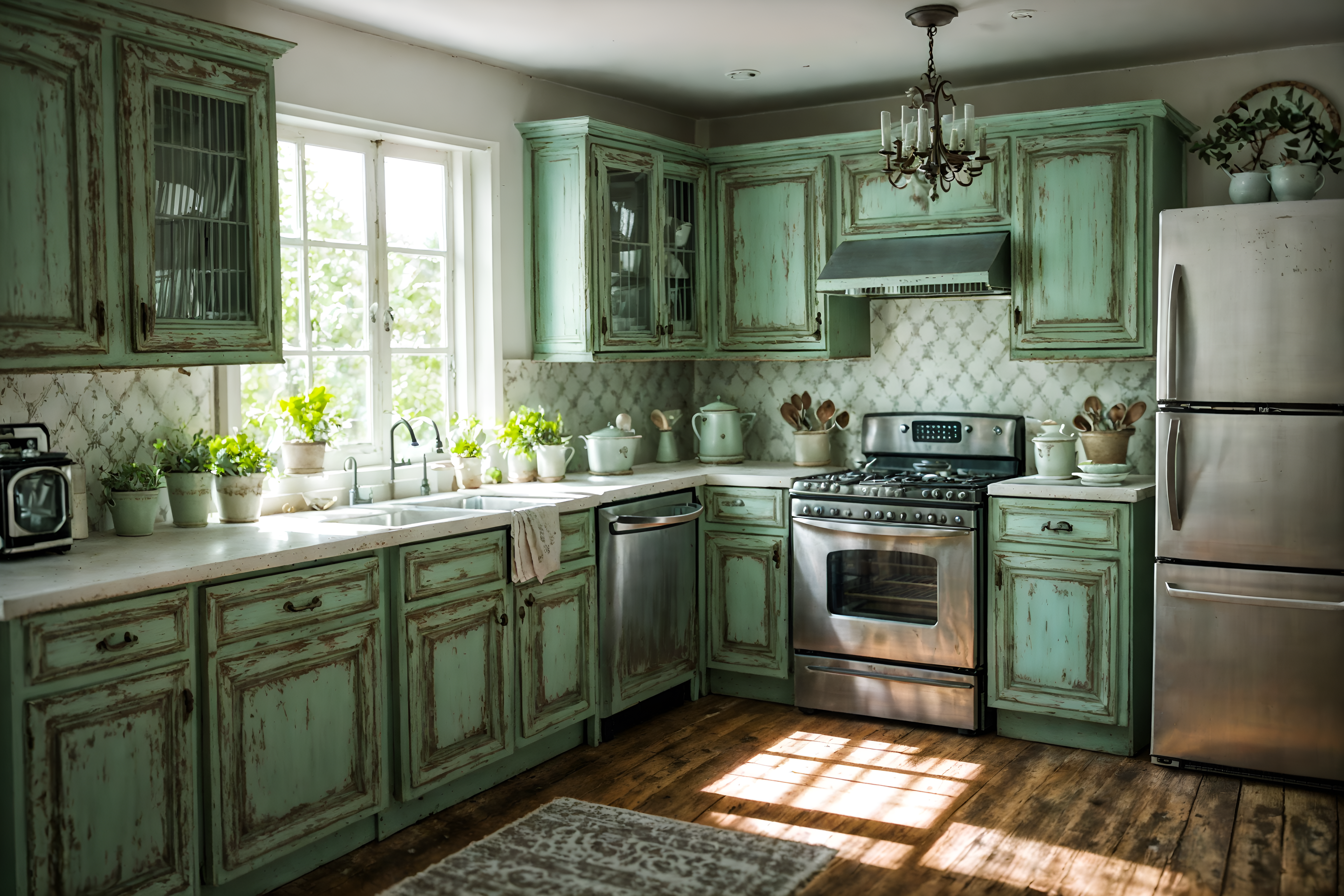 photo from pinterest of shabby chic-style interior designed (kitchen interior) with refrigerator and kitchen cabinets and plant and stove and worktops and sink and refrigerator cinematic photo, highly detailed, cinematic lighting, ultra-detailed, ultrarealistic, photorealism, 8k. trending on pinterest. shabby chic interior design style. masterpiece, cinematic light, ultrarealistic+, photorealistic+, 8k, raw photo, realistic, sharp focus on eyes, (symmetrical eyes), (intact eyes), hyperrealistic, highest quality, best quality, , highly detailed, masterpiece, best quality, extremely detailed 8k wallpaper, masterpiece, best quality, ultra-detailed, best shadow, detailed background, detailed face, detailed eyes, high contrast, best illumination, detailed face, dulux, caustic, dynamic angle, detailed glow. dramatic lighting. highly detailed, insanely detailed hair, symmetrical, intricate details, professionally retouched, 8k high definition. strong bokeh. award winning photo.