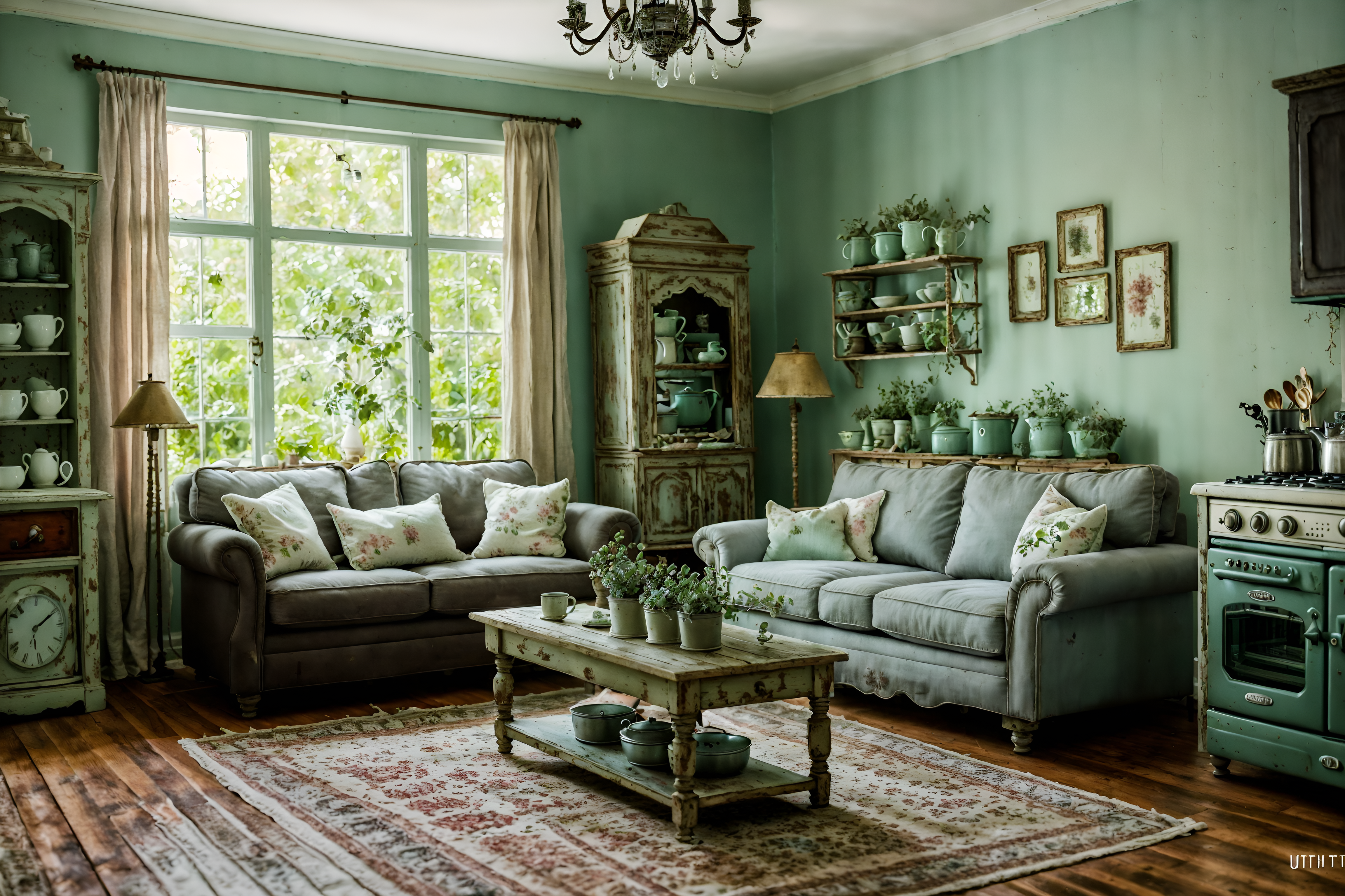 photo from pinterest of shabby chic-style interior designed (kitchen living combo interior) with coffee tables and sofa and occasional tables and stove and electric lamps and refrigerator and plant and sink cinematic photo, highly detailed, cinematic lighting, ultra-detailed, ultrarealistic, photorealism, 8k. trending on pinterest. shabby chic interior design style. masterpiece, cinematic light, ultrarealistic+, photorealistic+, 8k, raw photo, realistic, sharp focus on eyes, (symmetrical eyes), (intact eyes), hyperrealistic, highest quality, best quality, , highly detailed, masterpiece, best quality, extremely detailed 8k wallpaper, masterpiece, best quality, ultra-detailed, best shadow, detailed background, detailed face, detailed eyes, high contrast, best illumination, detailed face, dulux, caustic, dynamic angle, detailed glow. dramatic lighting. highly detailed, insanely detailed hair, symmetrical, intricate details, professionally retouched, 8k high definition. strong bokeh. award winning photo.
