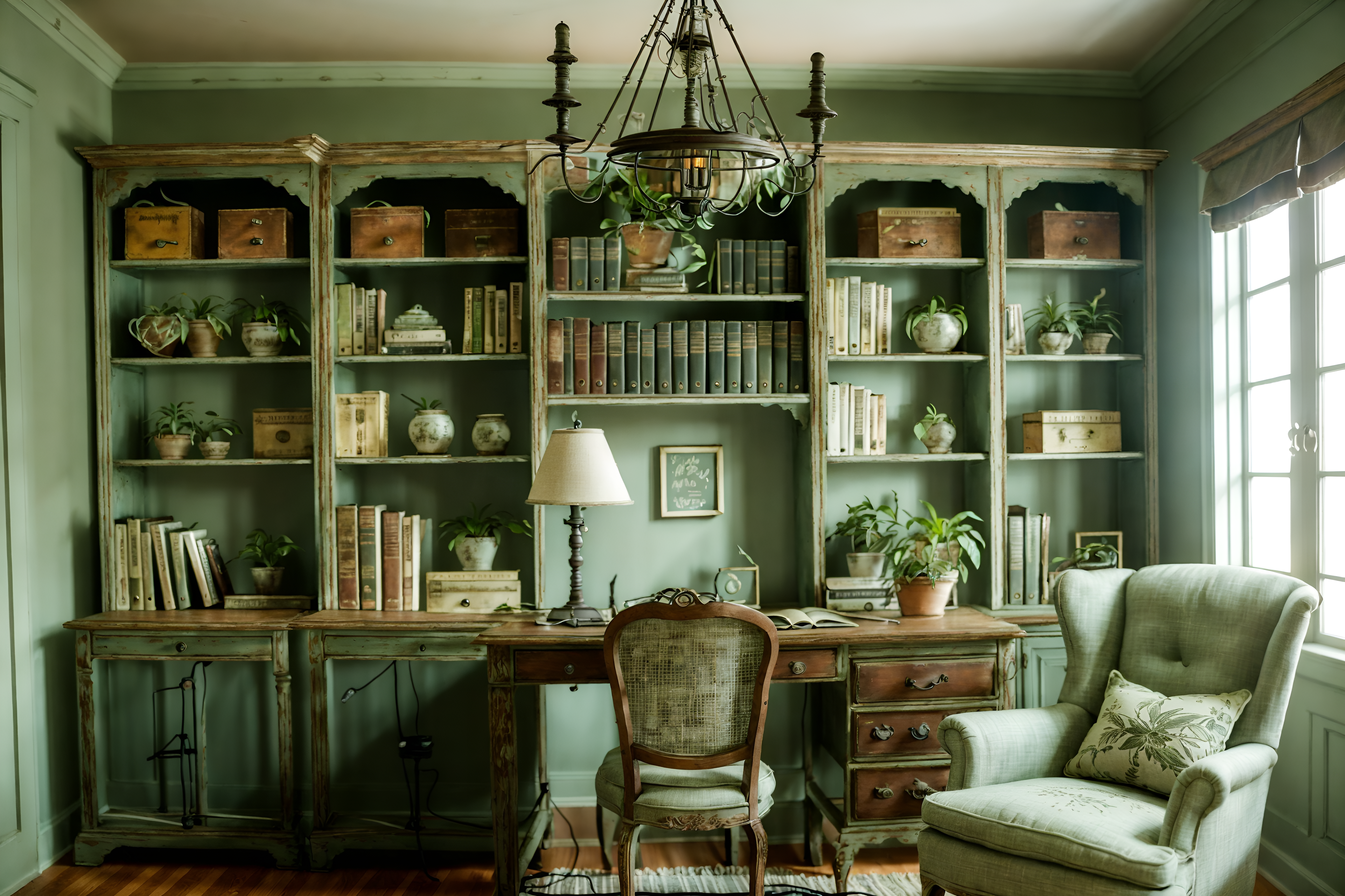 photo from pinterest of shabby chic-style interior designed (study room interior) with plant and bookshelves and lounge chair and desk lamp and writing desk and cabinets and office chair and plant cinematic photo, highly detailed, cinematic lighting, ultra-detailed, ultrarealistic, photorealism, 8k. trending on pinterest. shabby chic interior design style. masterpiece, cinematic light, ultrarealistic+, photorealistic+, 8k, raw photo, realistic, sharp focus on eyes, (symmetrical eyes), (intact eyes), hyperrealistic, highest quality, best quality, , highly detailed, masterpiece, best quality, extremely detailed 8k wallpaper, masterpiece, best quality, ultra-detailed, best shadow, detailed background, detailed face, detailed eyes, high contrast, best illumination, detailed face, dulux, caustic, dynamic angle, detailed glow. dramatic lighting. highly detailed, insanely detailed hair, symmetrical, intricate details, professionally retouched, 8k high definition. strong bokeh. award winning photo.