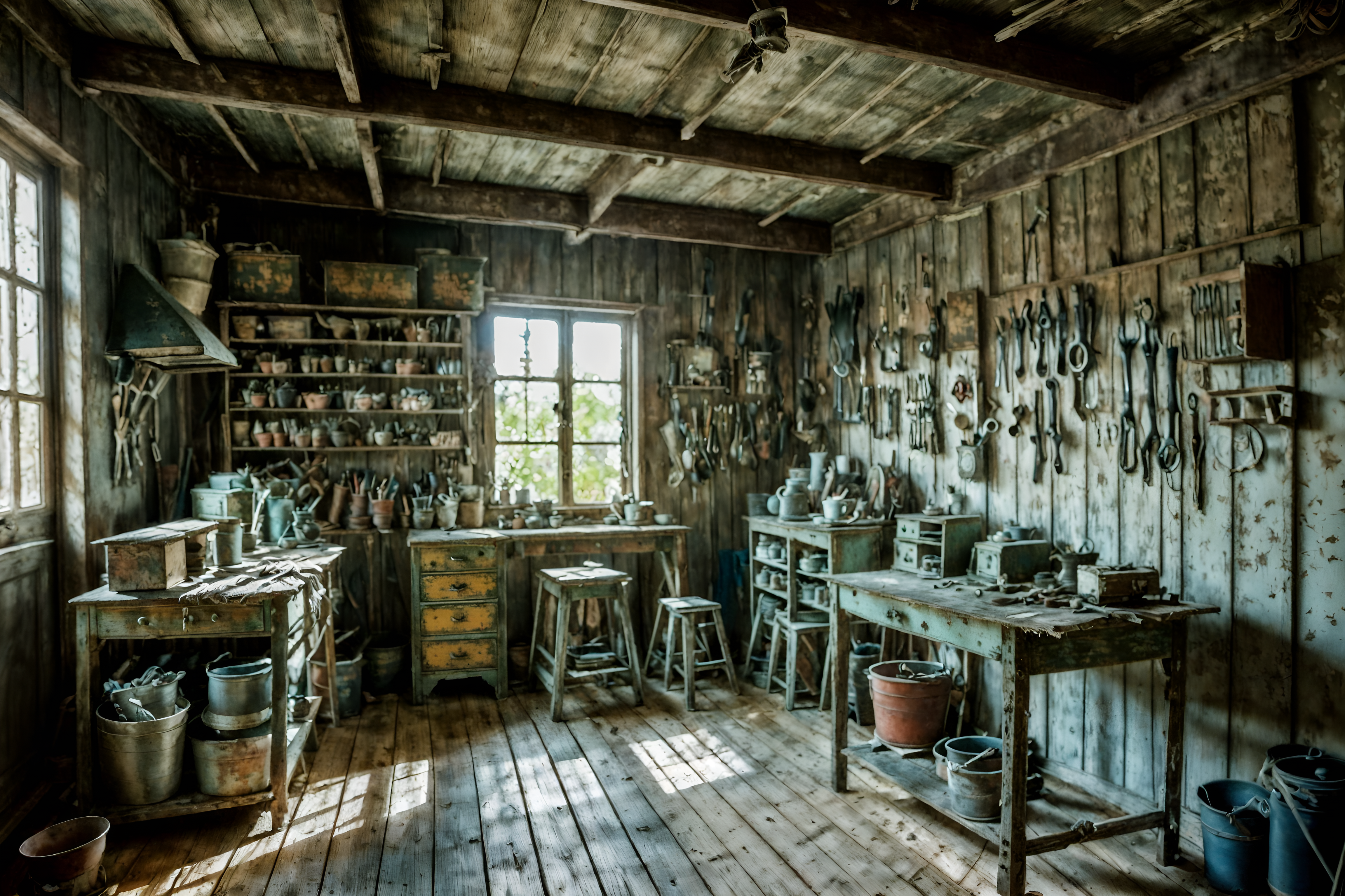 photo from pinterest of shabby chic-style interior designed (workshop interior) with messy and tool wall and wooden workbench and messy cinematic photo, highly detailed, cinematic lighting, ultra-detailed, ultrarealistic, photorealism, 8k. trending on pinterest. shabby chic interior design style. masterpiece, cinematic light, ultrarealistic+, photorealistic+, 8k, raw photo, realistic, sharp focus on eyes, (symmetrical eyes), (intact eyes), hyperrealistic, highest quality, best quality, , highly detailed, masterpiece, best quality, extremely detailed 8k wallpaper, masterpiece, best quality, ultra-detailed, best shadow, detailed background, detailed face, detailed eyes, high contrast, best illumination, detailed face, dulux, caustic, dynamic angle, detailed glow. dramatic lighting. highly detailed, insanely detailed hair, symmetrical, intricate details, professionally retouched, 8k high definition. strong bokeh. award winning photo.