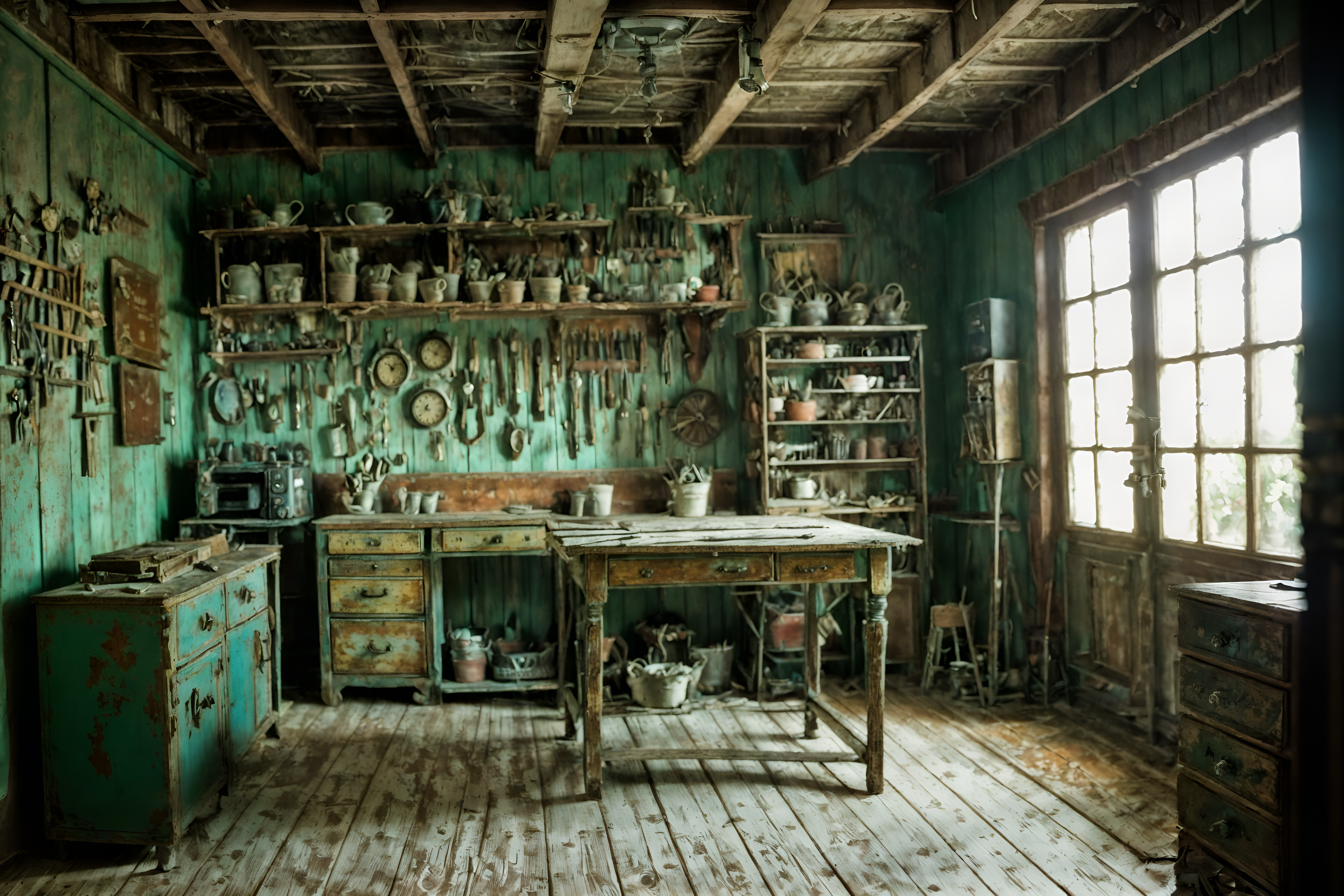 photo from pinterest of shabby chic-style interior designed (workshop interior) with messy and tool wall and wooden workbench and messy cinematic photo, highly detailed, cinematic lighting, ultra-detailed, ultrarealistic, photorealism, 8k. trending on pinterest. shabby chic interior design style. masterpiece, cinematic light, ultrarealistic+, photorealistic+, 8k, raw photo, realistic, sharp focus on eyes, (symmetrical eyes), (intact eyes), hyperrealistic, highest quality, best quality, , highly detailed, masterpiece, best quality, extremely detailed 8k wallpaper, masterpiece, best quality, ultra-detailed, best shadow, detailed background, detailed face, detailed eyes, high contrast, best illumination, detailed face, dulux, caustic, dynamic angle, detailed glow. dramatic lighting. highly detailed, insanely detailed hair, symmetrical, intricate details, professionally retouched, 8k high definition. strong bokeh. award winning photo.