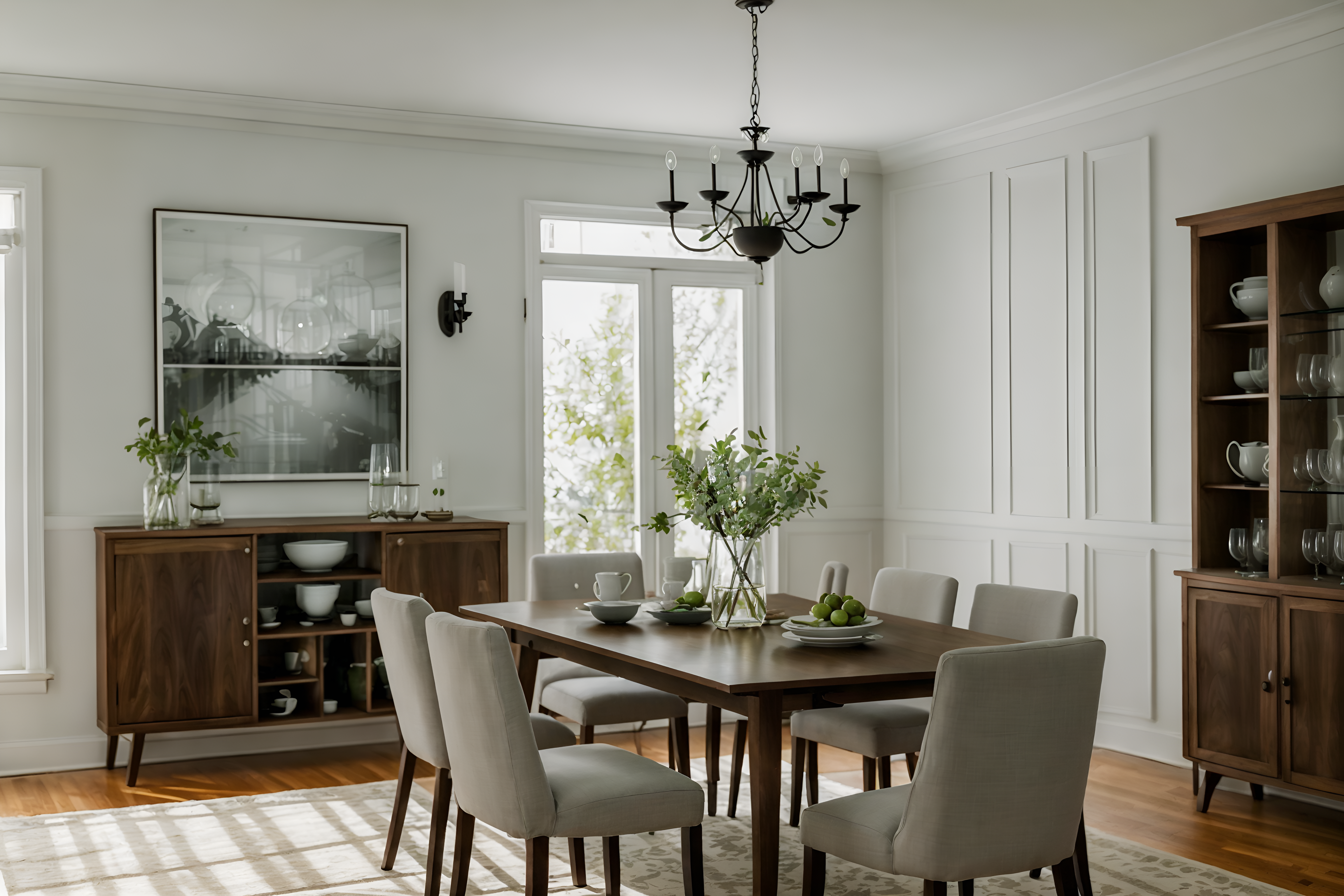photo from pinterest of simple-style interior designed (dining room interior) with plates, cutlery and glasses on dining table and bookshelves and dining table and painting or photo on wall and vase and plant and light or chandelier and table cloth cinematic photo, highly detailed, cinematic lighting, ultra-detailed, ultrarealistic, photorealism, 8k. trending on pinterest. simple interior design style. masterpiece, cinematic light, ultrarealistic+, photorealistic+, 8k, raw photo, realistic, sharp focus on eyes, (symmetrical eyes), (intact eyes), hyperrealistic, highest quality, best quality, , highly detailed, masterpiece, best quality, extremely detailed 8k wallpaper, masterpiece, best quality, ultra-detailed, best shadow, detailed background, detailed face, detailed eyes, high contrast, best illumination, detailed face, dulux, caustic, dynamic angle, detailed glow. dramatic lighting. highly detailed, insanely detailed hair, symmetrical, intricate details, professionally retouched, 8k high definition. strong bokeh. award winning photo.