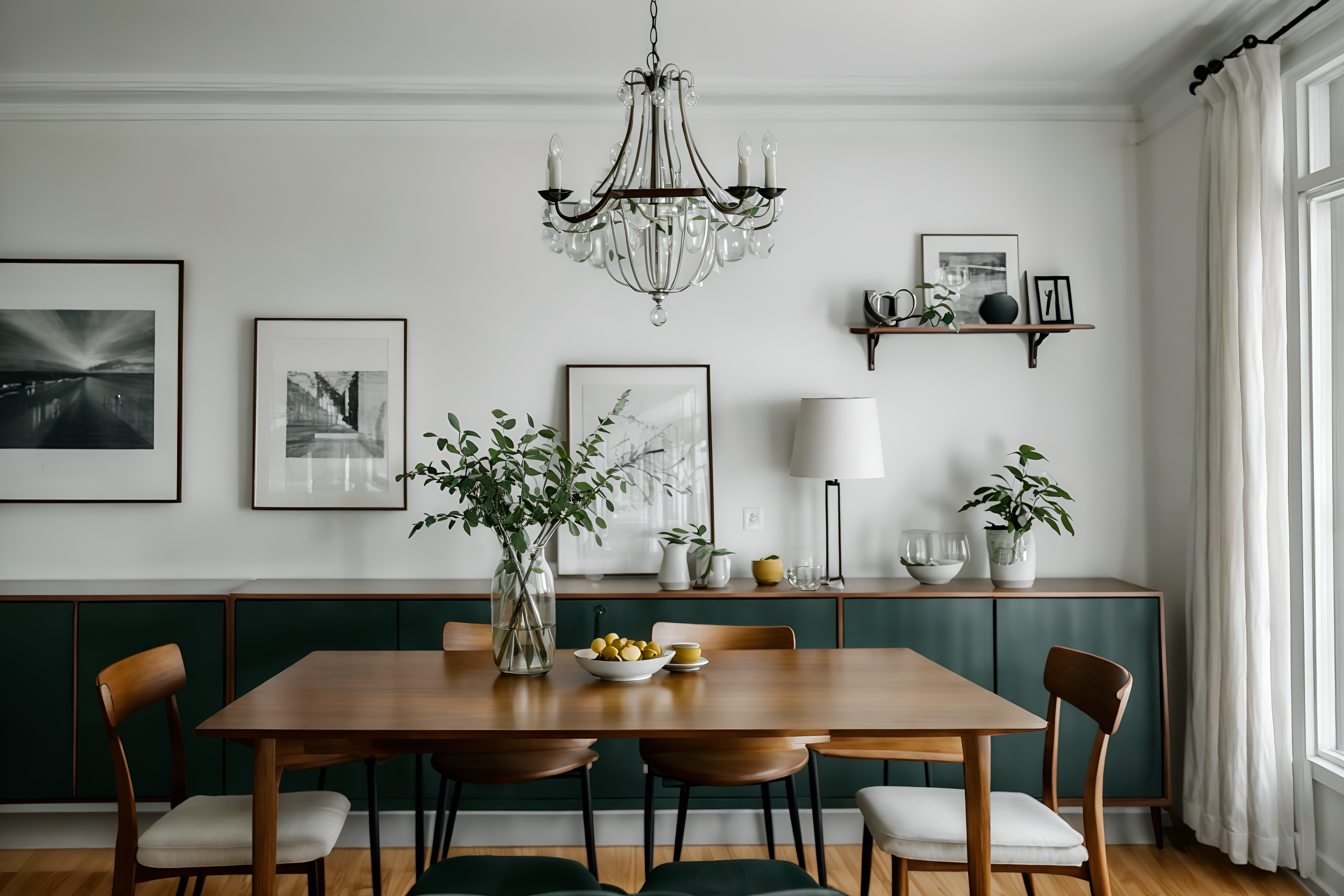 photo from pinterest of simple-style interior designed (dining room interior) with plates, cutlery and glasses on dining table and bookshelves and dining table and painting or photo on wall and vase and plant and light or chandelier and table cloth cinematic photo, highly detailed, cinematic lighting, ultra-detailed, ultrarealistic, photorealism, 8k. trending on pinterest. simple interior design style. masterpiece, cinematic light, ultrarealistic+, photorealistic+, 8k, raw photo, realistic, sharp focus on eyes, (symmetrical eyes), (intact eyes), hyperrealistic, highest quality, best quality, , highly detailed, masterpiece, best quality, extremely detailed 8k wallpaper, masterpiece, best quality, ultra-detailed, best shadow, detailed background, detailed face, detailed eyes, high contrast, best illumination, detailed face, dulux, caustic, dynamic angle, detailed glow. dramatic lighting. highly detailed, insanely detailed hair, symmetrical, intricate details, professionally retouched, 8k high definition. strong bokeh. award winning photo.