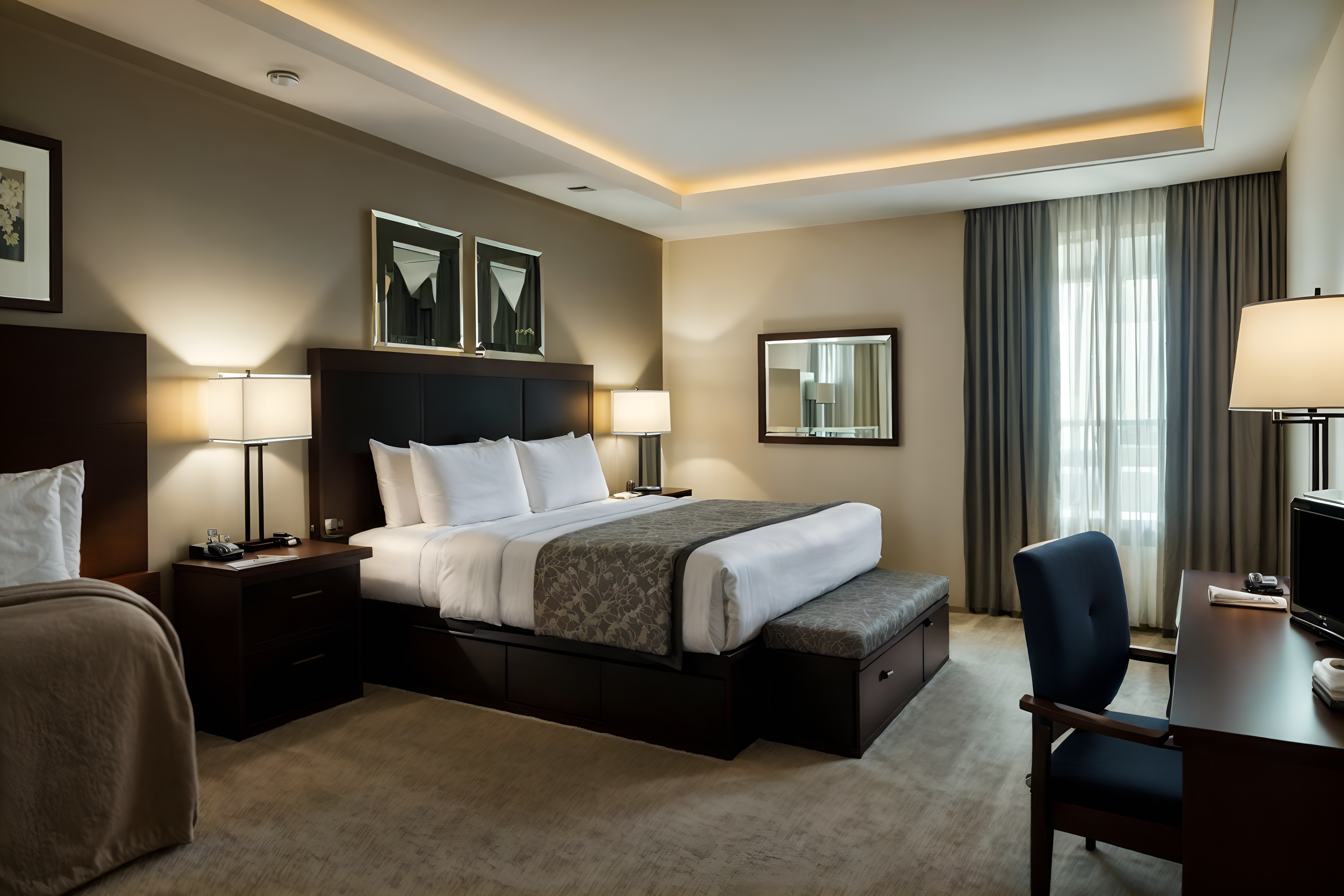 photo from pinterest of simple-style interior designed (hotel room interior) with mirror and hotel bathroom and accent chair and headboard and dresser closet and storage bench or ottoman and night light and working desk with desk chair cinematic photo, highly detailed, cinematic lighting, ultra-detailed, ultrarealistic, photorealism, 8k. trending on pinterest. simple interior design style. masterpiece, cinematic light, ultrarealistic+, photorealistic+, 8k, raw photo, realistic, sharp focus on eyes, (symmetrical eyes), (intact eyes), hyperrealistic, highest quality, best quality, , highly detailed, masterpiece, best quality, extremely detailed 8k wallpaper, masterpiece, best quality, ultra-detailed, best shadow, detailed background, detailed face, detailed eyes, high contrast, best illumination, detailed face, dulux, caustic, dynamic angle, detailed glow. dramatic lighting. highly detailed, insanely detailed hair, symmetrical, intricate details, professionally retouched, 8k high definition. strong bokeh. award winning photo.