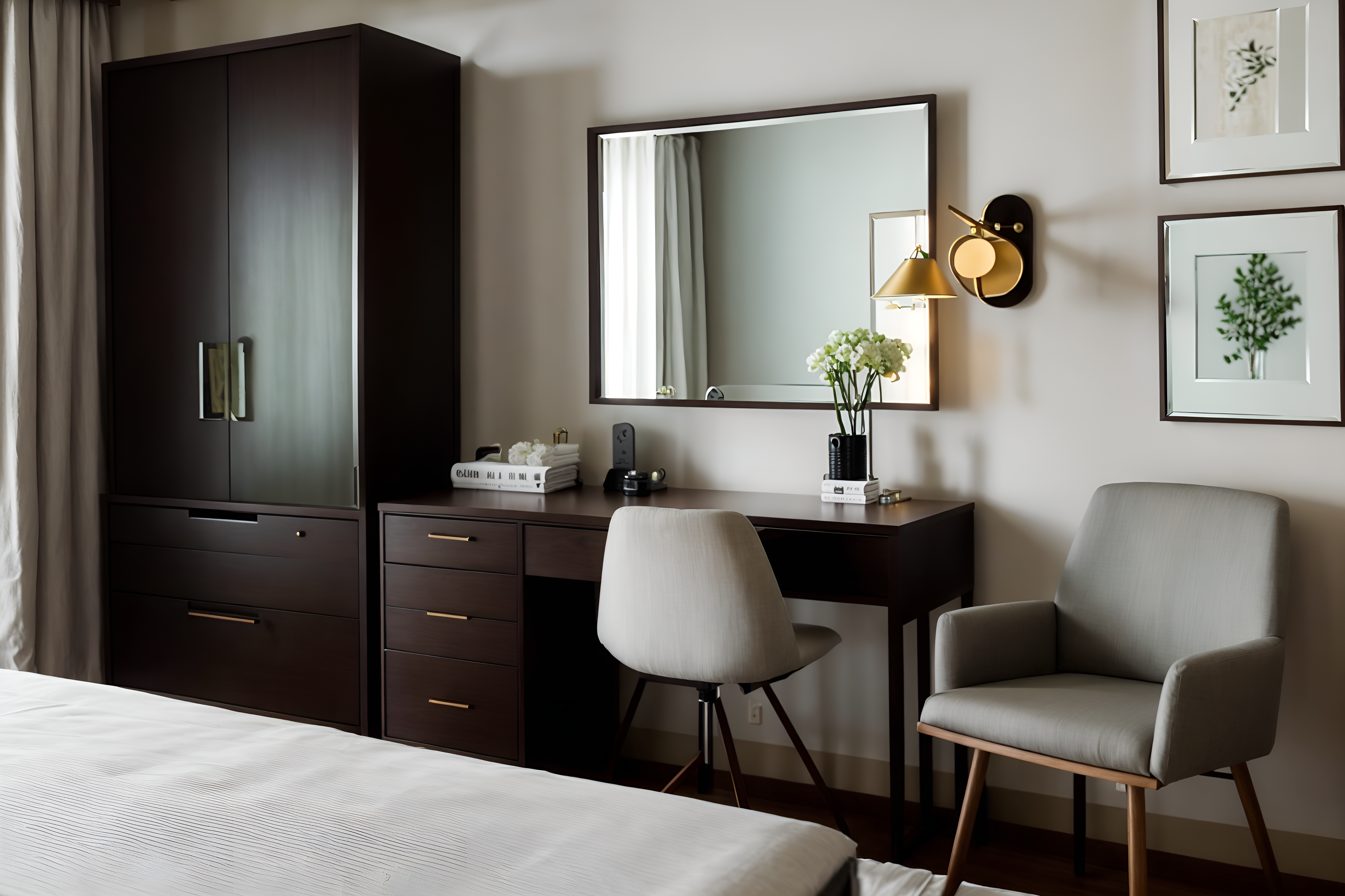 photo from pinterest of simple-style interior designed (hotel room interior) with mirror and hotel bathroom and accent chair and headboard and dresser closet and storage bench or ottoman and night light and working desk with desk chair cinematic photo, highly detailed, cinematic lighting, ultra-detailed, ultrarealistic, photorealism, 8k. trending on pinterest. simple interior design style. masterpiece, cinematic light, ultrarealistic+, photorealistic+, 8k, raw photo, realistic, sharp focus on eyes, (symmetrical eyes), (intact eyes), hyperrealistic, highest quality, best quality, , highly detailed, masterpiece, best quality, extremely detailed 8k wallpaper, masterpiece, best quality, ultra-detailed, best shadow, detailed background, detailed face, detailed eyes, high contrast, best illumination, detailed face, dulux, caustic, dynamic angle, detailed glow. dramatic lighting. highly detailed, insanely detailed hair, symmetrical, intricate details, professionally retouched, 8k high definition. strong bokeh. award winning photo.