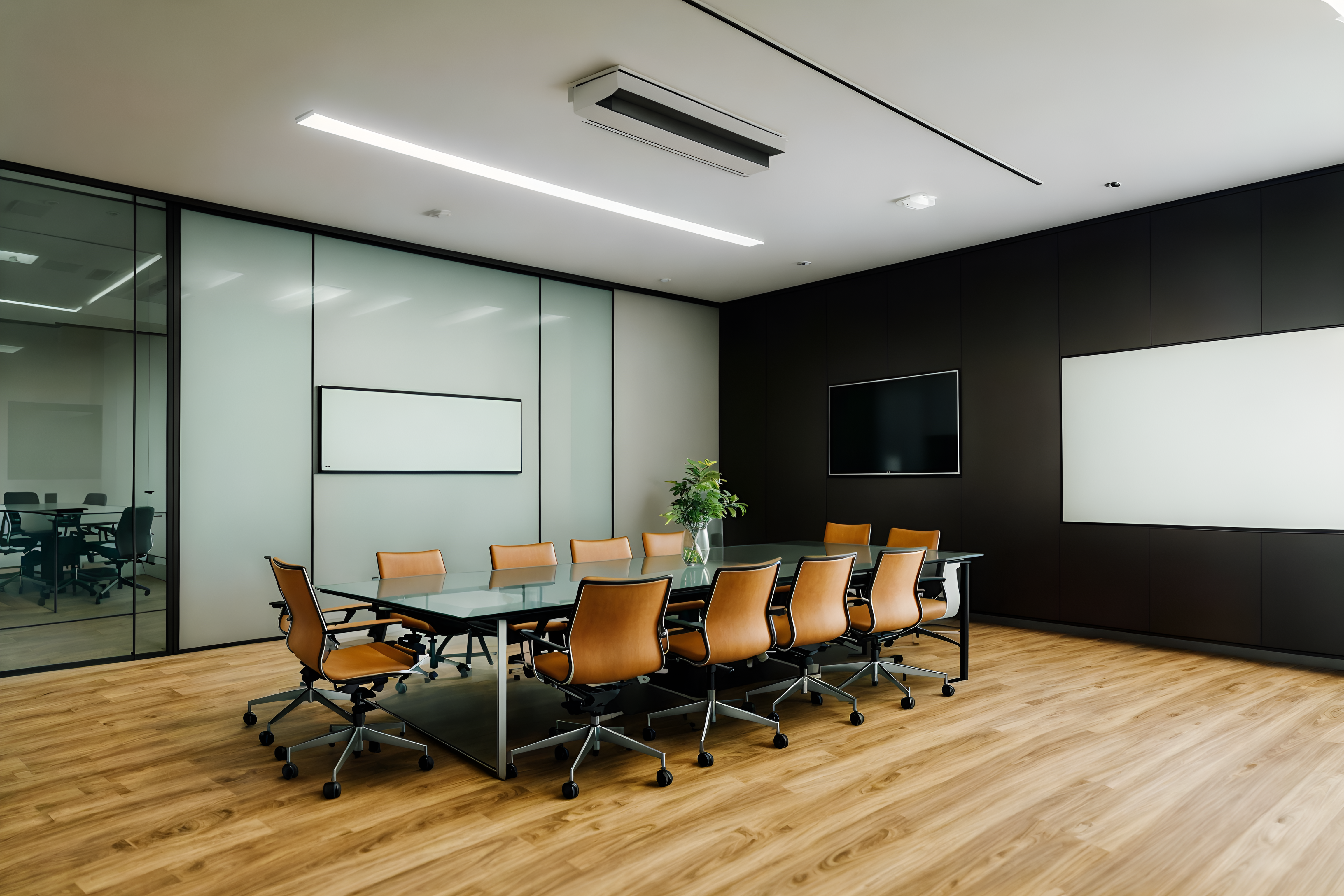 photo from pinterest of simple-style interior designed (meeting room interior) with boardroom table and plant and vase and glass walls and painting or photo on wall and glass doors and office chairs and cabinets cinematic photo, highly detailed, cinematic lighting, ultra-detailed, ultrarealistic, photorealism, 8k. trending on pinterest. simple interior design style. masterpiece, cinematic light, ultrarealistic+, photorealistic+, 8k, raw photo, realistic, sharp focus on eyes, (symmetrical eyes), (intact eyes), hyperrealistic, highest quality, best quality, , highly detailed, masterpiece, best quality, extremely detailed 8k wallpaper, masterpiece, best quality, ultra-detailed, best shadow, detailed background, detailed face, detailed eyes, high contrast, best illumination, detailed face, dulux, caustic, dynamic angle, detailed glow. dramatic lighting. highly detailed, insanely detailed hair, symmetrical, intricate details, professionally retouched, 8k high definition. strong bokeh. award winning photo.