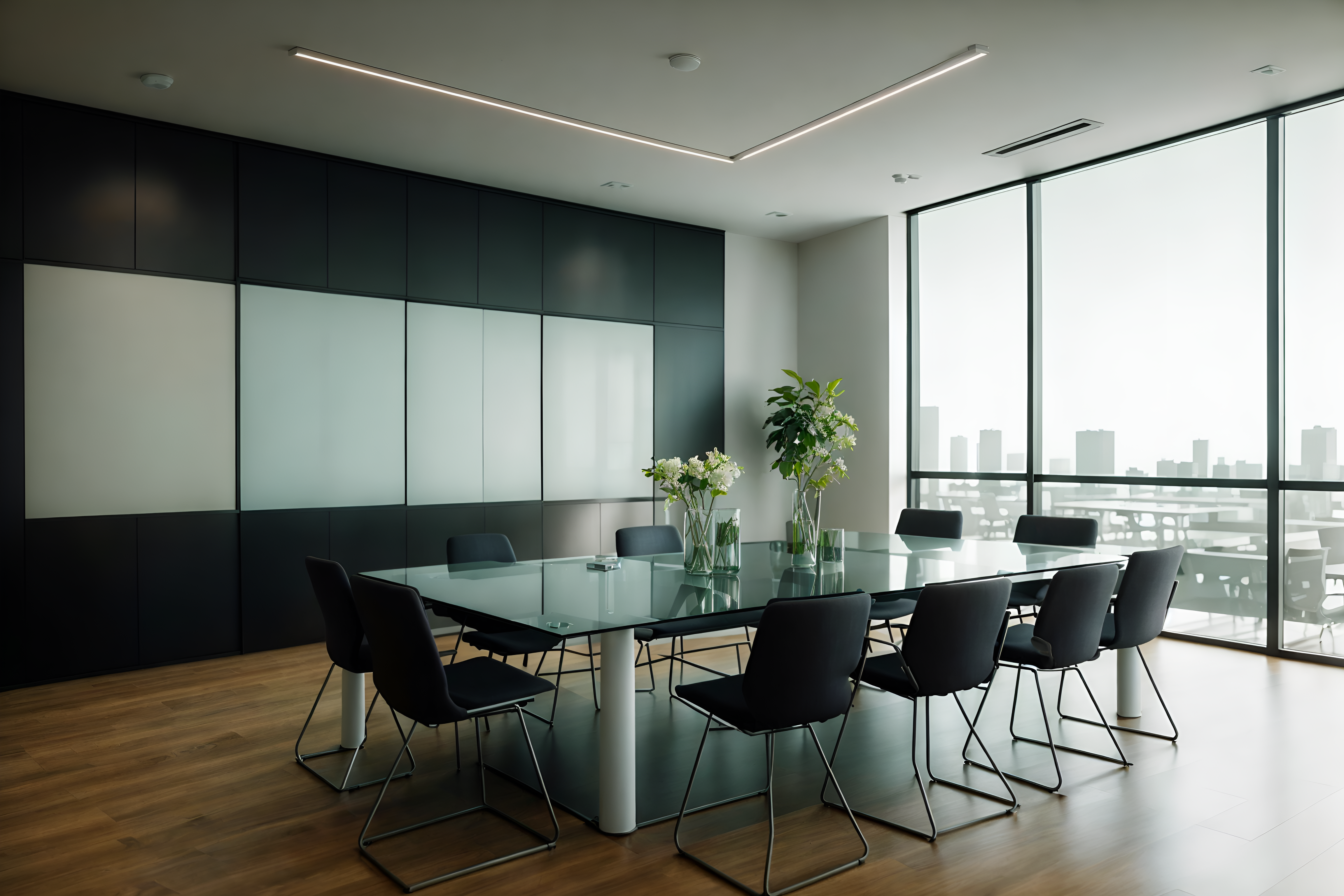 photo from pinterest of simple-style interior designed (meeting room interior) with boardroom table and plant and vase and glass walls and painting or photo on wall and glass doors and office chairs and cabinets cinematic photo, highly detailed, cinematic lighting, ultra-detailed, ultrarealistic, photorealism, 8k. trending on pinterest. simple interior design style. masterpiece, cinematic light, ultrarealistic+, photorealistic+, 8k, raw photo, realistic, sharp focus on eyes, (symmetrical eyes), (intact eyes), hyperrealistic, highest quality, best quality, , highly detailed, masterpiece, best quality, extremely detailed 8k wallpaper, masterpiece, best quality, ultra-detailed, best shadow, detailed background, detailed face, detailed eyes, high contrast, best illumination, detailed face, dulux, caustic, dynamic angle, detailed glow. dramatic lighting. highly detailed, insanely detailed hair, symmetrical, intricate details, professionally retouched, 8k high definition. strong bokeh. award winning photo.