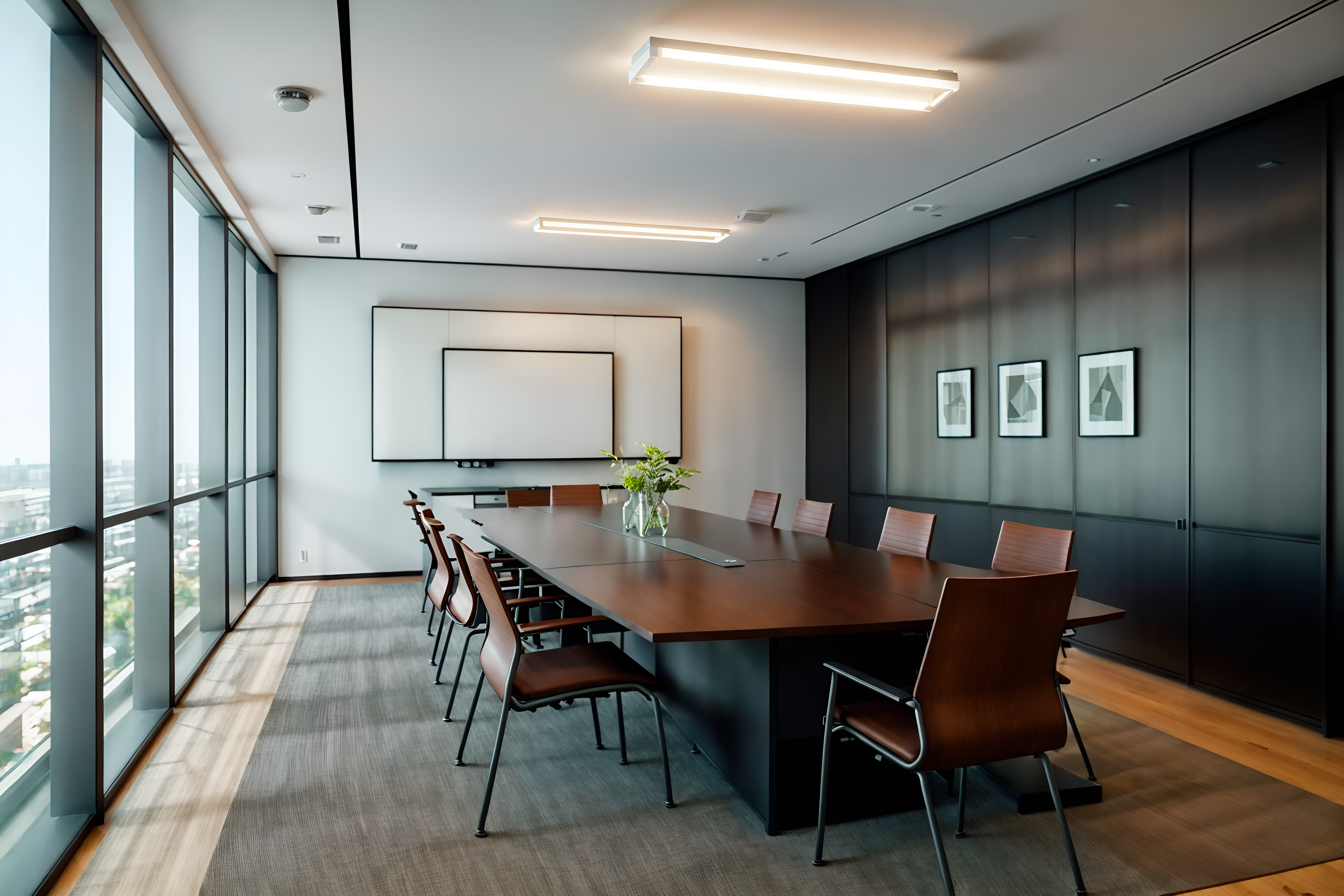 photo from pinterest of simple-style interior designed (meeting room interior) with boardroom table and plant and vase and glass walls and painting or photo on wall and glass doors and office chairs and cabinets cinematic photo, highly detailed, cinematic lighting, ultra-detailed, ultrarealistic, photorealism, 8k. trending on pinterest. simple interior design style. masterpiece, cinematic light, ultrarealistic+, photorealistic+, 8k, raw photo, realistic, sharp focus on eyes, (symmetrical eyes), (intact eyes), hyperrealistic, highest quality, best quality, , highly detailed, masterpiece, best quality, extremely detailed 8k wallpaper, masterpiece, best quality, ultra-detailed, best shadow, detailed background, detailed face, detailed eyes, high contrast, best illumination, detailed face, dulux, caustic, dynamic angle, detailed glow. dramatic lighting. highly detailed, insanely detailed hair, symmetrical, intricate details, professionally retouched, 8k high definition. strong bokeh. award winning photo.