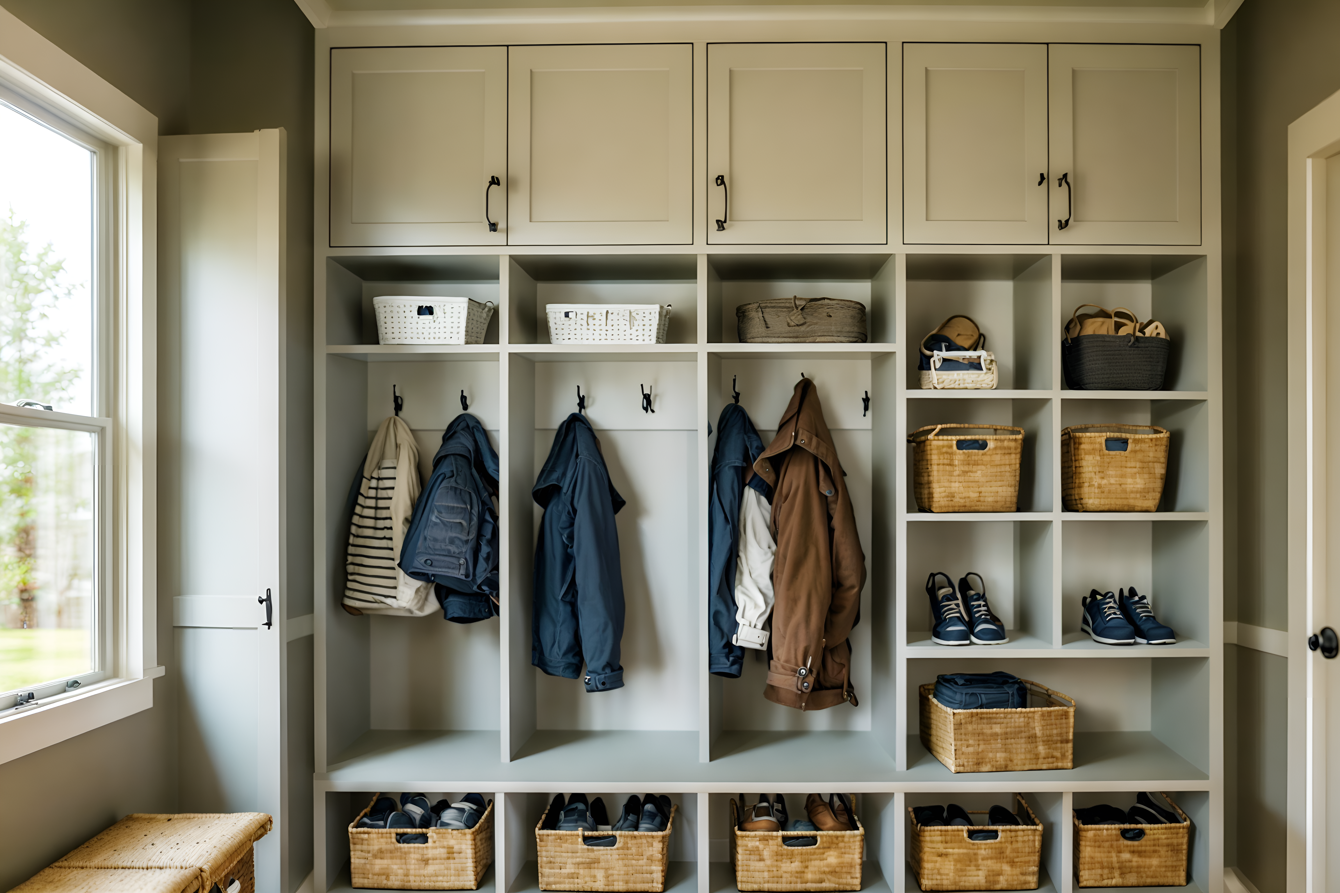 photo from pinterest of simple-style interior designed (mudroom interior) with cubbies and storage baskets and wall hooks for coats and a bench and shelves for shoes and high up storage and cabinets and storage drawers cinematic photo, highly detailed, cinematic lighting, ultra-detailed, ultrarealistic, photorealism, 8k. trending on pinterest. simple interior design style. masterpiece, cinematic light, ultrarealistic+, photorealistic+, 8k, raw photo, realistic, sharp focus on eyes, (symmetrical eyes), (intact eyes), hyperrealistic, highest quality, best quality, , highly detailed, masterpiece, best quality, extremely detailed 8k wallpaper, masterpiece, best quality, ultra-detailed, best shadow, detailed background, detailed face, detailed eyes, high contrast, best illumination, detailed face, dulux, caustic, dynamic angle, detailed glow. dramatic lighting. highly detailed, insanely detailed hair, symmetrical, intricate details, professionally retouched, 8k high definition. strong bokeh. award winning photo.