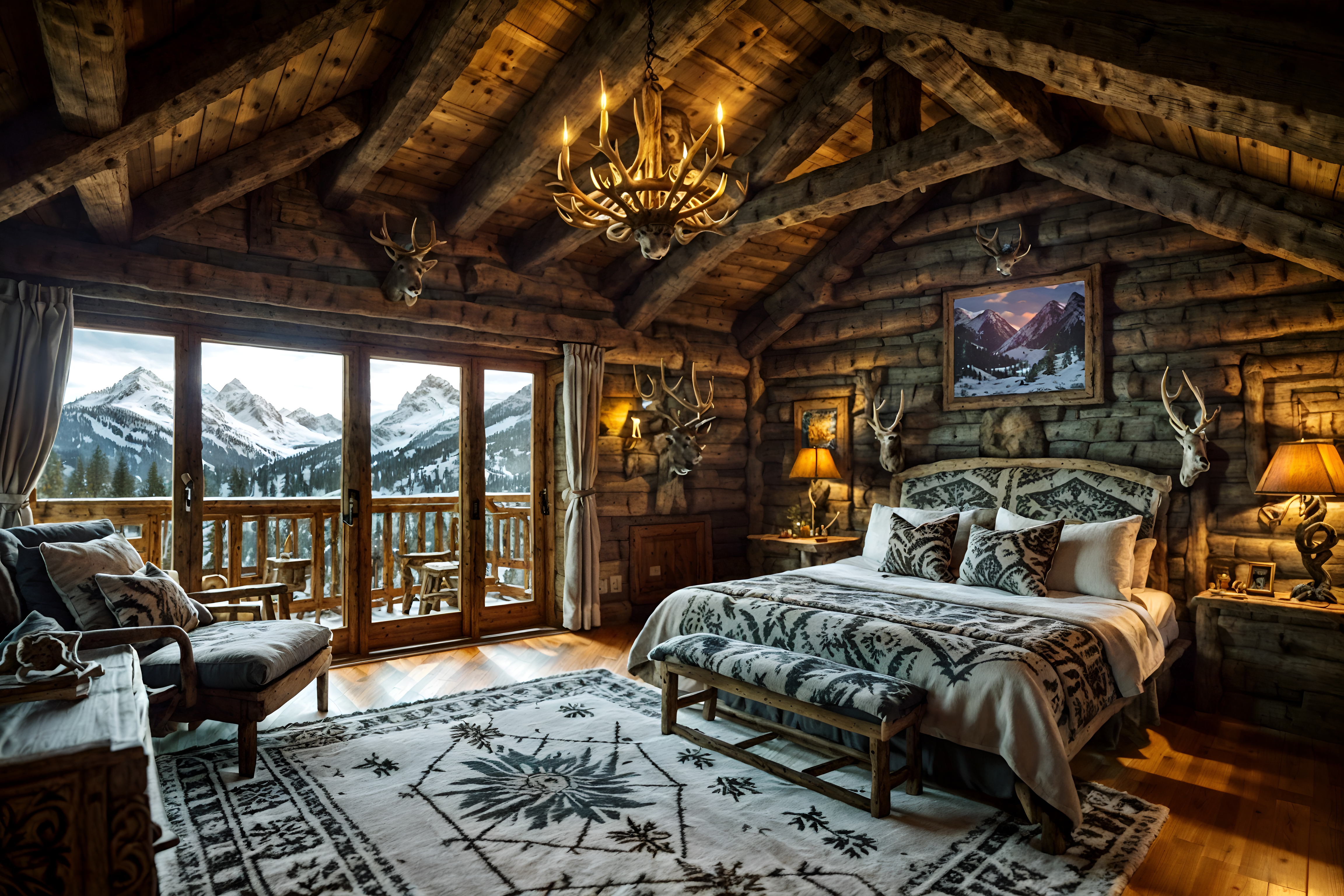 photo from pinterest of ski chalet-style interior designed (attic interior) . with mountain-inspired and animal motifs and exposed construction beams and richly patterned fabrics and hanging wall elk antler and decorative carving and mouldings and wood beams and nature-inspired. . cinematic photo, highly detailed, cinematic lighting, ultra-detailed, ultrarealistic, photorealism, 8k. trending on pinterest. ski chalet interior design style. masterpiece, cinematic light, ultrarealistic+, photorealistic+, 8k, raw photo, realistic, sharp focus on eyes, (symmetrical eyes), (intact eyes), hyperrealistic, highest quality, best quality, , highly detailed, masterpiece, best quality, extremely detailed 8k wallpaper, masterpiece, best quality, ultra-detailed, best shadow, detailed background, detailed face, detailed eyes, high contrast, best illumination, detailed face, dulux, caustic, dynamic angle, detailed glow. dramatic lighting. highly detailed, insanely detailed hair, symmetrical, intricate details, professionally retouched, 8k high definition. strong bokeh. award winning photo.
