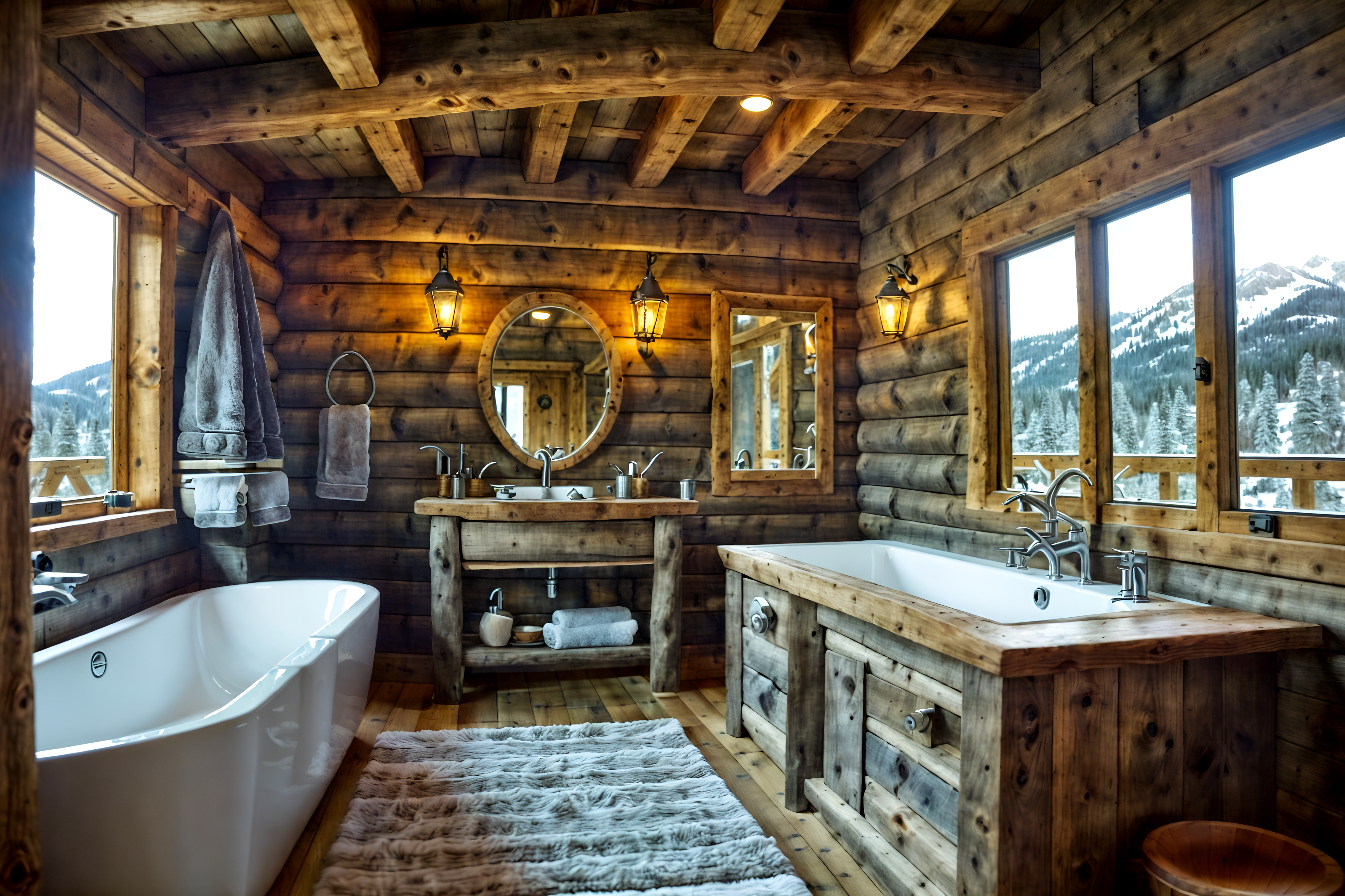 photo from pinterest of ski chalet-style interior designed (bathroom interior) with mirror and bathroom sink with faucet and bathtub and toilet seat and plant and bathroom cabinet and bath towel and waste basket. . with nature-inspired and hanging wall elk antler and animal rugs and exposed timber and wooden walls and exposed construction beams and exposed wood and animal furs. . cinematic photo, highly detailed, cinematic lighting, ultra-detailed, ultrarealistic, photorealism, 8k. trending on pinterest. ski chalet interior design style. masterpiece, cinematic light, ultrarealistic+, photorealistic+, 8k, raw photo, realistic, sharp focus on eyes, (symmetrical eyes), (intact eyes), hyperrealistic, highest quality, best quality, , highly detailed, masterpiece, best quality, extremely detailed 8k wallpaper, masterpiece, best quality, ultra-detailed, best shadow, detailed background, detailed face, detailed eyes, high contrast, best illumination, detailed face, dulux, caustic, dynamic angle, detailed glow. dramatic lighting. highly detailed, insanely detailed hair, symmetrical, intricate details, professionally retouched, 8k high definition. strong bokeh. award winning photo.