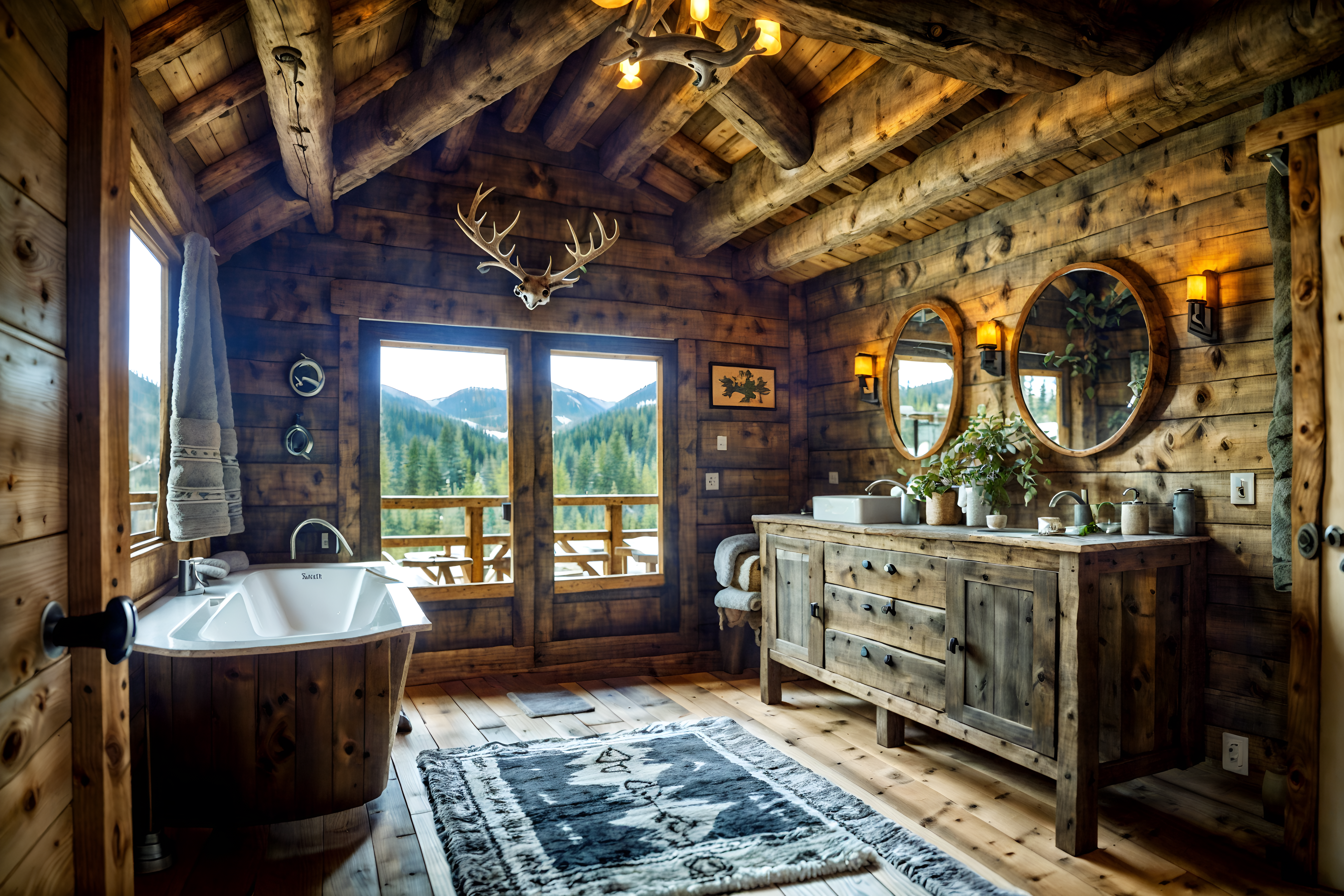 photo from pinterest of ski chalet-style interior designed (bathroom interior) with mirror and bathroom sink with faucet and bathtub and toilet seat and plant and bathroom cabinet and bath towel and waste basket. . with nature-inspired and hanging wall elk antler and animal rugs and exposed timber and wooden walls and exposed construction beams and exposed wood and animal furs. . cinematic photo, highly detailed, cinematic lighting, ultra-detailed, ultrarealistic, photorealism, 8k. trending on pinterest. ski chalet interior design style. masterpiece, cinematic light, ultrarealistic+, photorealistic+, 8k, raw photo, realistic, sharp focus on eyes, (symmetrical eyes), (intact eyes), hyperrealistic, highest quality, best quality, , highly detailed, masterpiece, best quality, extremely detailed 8k wallpaper, masterpiece, best quality, ultra-detailed, best shadow, detailed background, detailed face, detailed eyes, high contrast, best illumination, detailed face, dulux, caustic, dynamic angle, detailed glow. dramatic lighting. highly detailed, insanely detailed hair, symmetrical, intricate details, professionally retouched, 8k high definition. strong bokeh. award winning photo.