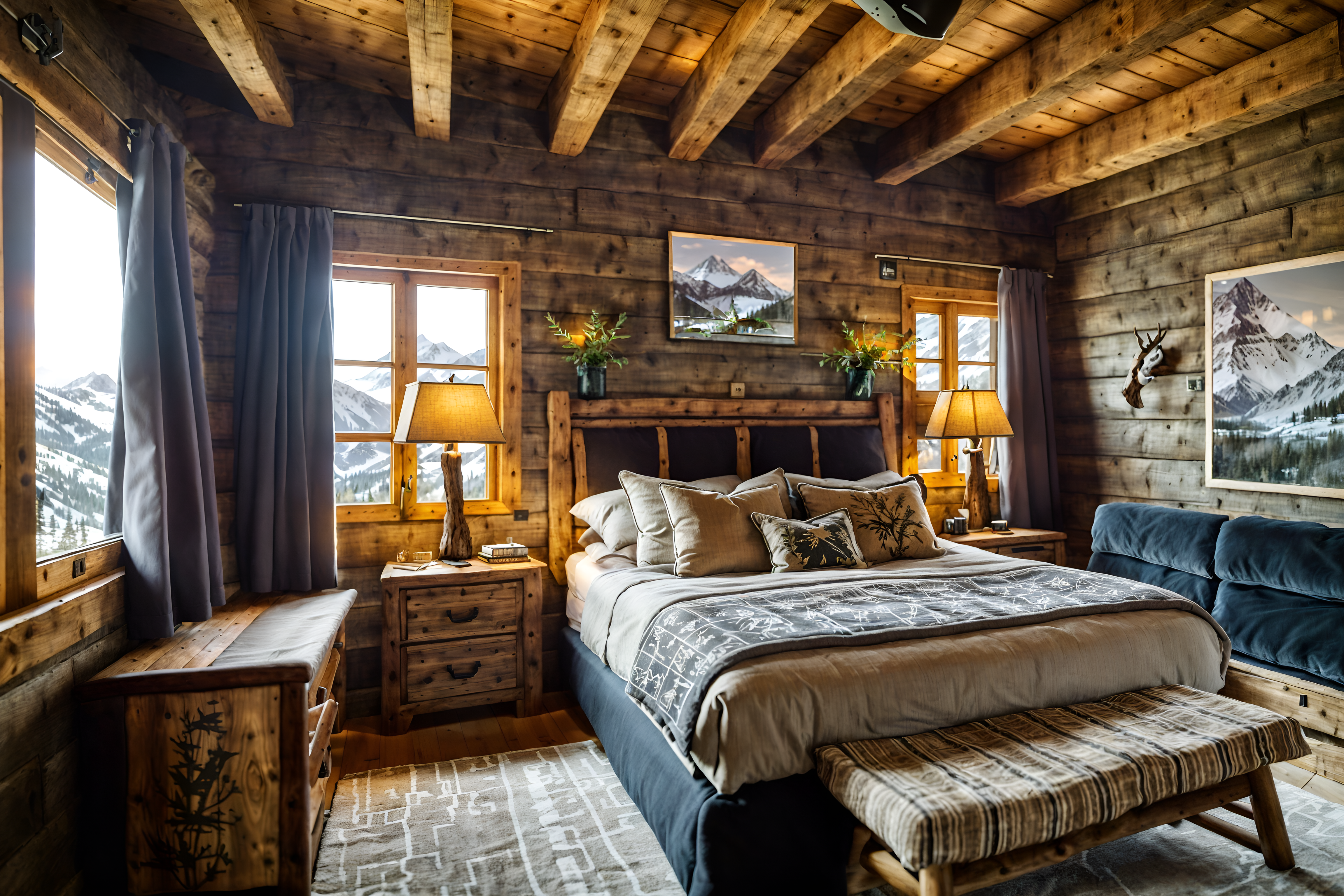 photo from pinterest of ski chalet-style interior designed (bedroom interior) with mirror and storage bench or ottoman and headboard and plant and night light and bedside table or night stand and dresser closet and accent chair. . with exposed construction beams and mountain-inspired and richly patterned fabrics and wooden walls and wood beams and nature-inspired and layered textiles and hanging wall elk antler. . cinematic photo, highly detailed, cinematic lighting, ultra-detailed, ultrarealistic, photorealism, 8k. trending on pinterest. ski chalet interior design style. masterpiece, cinematic light, ultrarealistic+, photorealistic+, 8k, raw photo, realistic, sharp focus on eyes, (symmetrical eyes), (intact eyes), hyperrealistic, highest quality, best quality, , highly detailed, masterpiece, best quality, extremely detailed 8k wallpaper, masterpiece, best quality, ultra-detailed, best shadow, detailed background, detailed face, detailed eyes, high contrast, best illumination, detailed face, dulux, caustic, dynamic angle, detailed glow. dramatic lighting. highly detailed, insanely detailed hair, symmetrical, intricate details, professionally retouched, 8k high definition. strong bokeh. award winning photo.