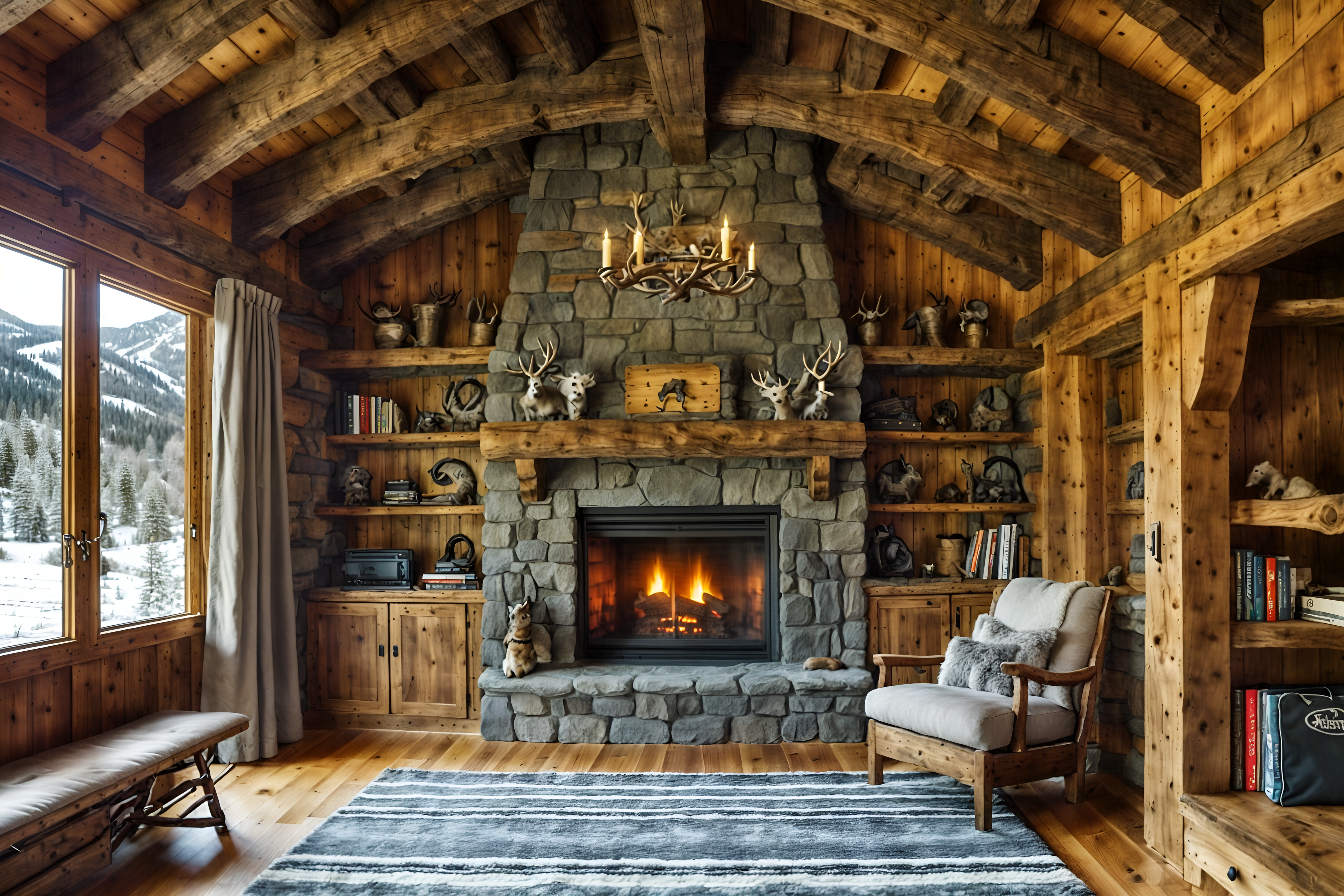 photo from pinterest of ski chalet-style interior designed (drop zone interior) with high up storage and wall hooks for coats and a bench and shelves for shoes and cabinets and cubbies and storage drawers and storage baskets. . with exposed construction beams and stone fireplace and animal furs and hanging wall elk antler and nature-inspired and exposed wood and wood beams and animal rugs. . cinematic photo, highly detailed, cinematic lighting, ultra-detailed, ultrarealistic, photorealism, 8k. trending on pinterest. ski chalet interior design style. masterpiece, cinematic light, ultrarealistic+, photorealistic+, 8k, raw photo, realistic, sharp focus on eyes, (symmetrical eyes), (intact eyes), hyperrealistic, highest quality, best quality, , highly detailed, masterpiece, best quality, extremely detailed 8k wallpaper, masterpiece, best quality, ultra-detailed, best shadow, detailed background, detailed face, detailed eyes, high contrast, best illumination, detailed face, dulux, caustic, dynamic angle, detailed glow. dramatic lighting. highly detailed, insanely detailed hair, symmetrical, intricate details, professionally retouched, 8k high definition. strong bokeh. award winning photo.