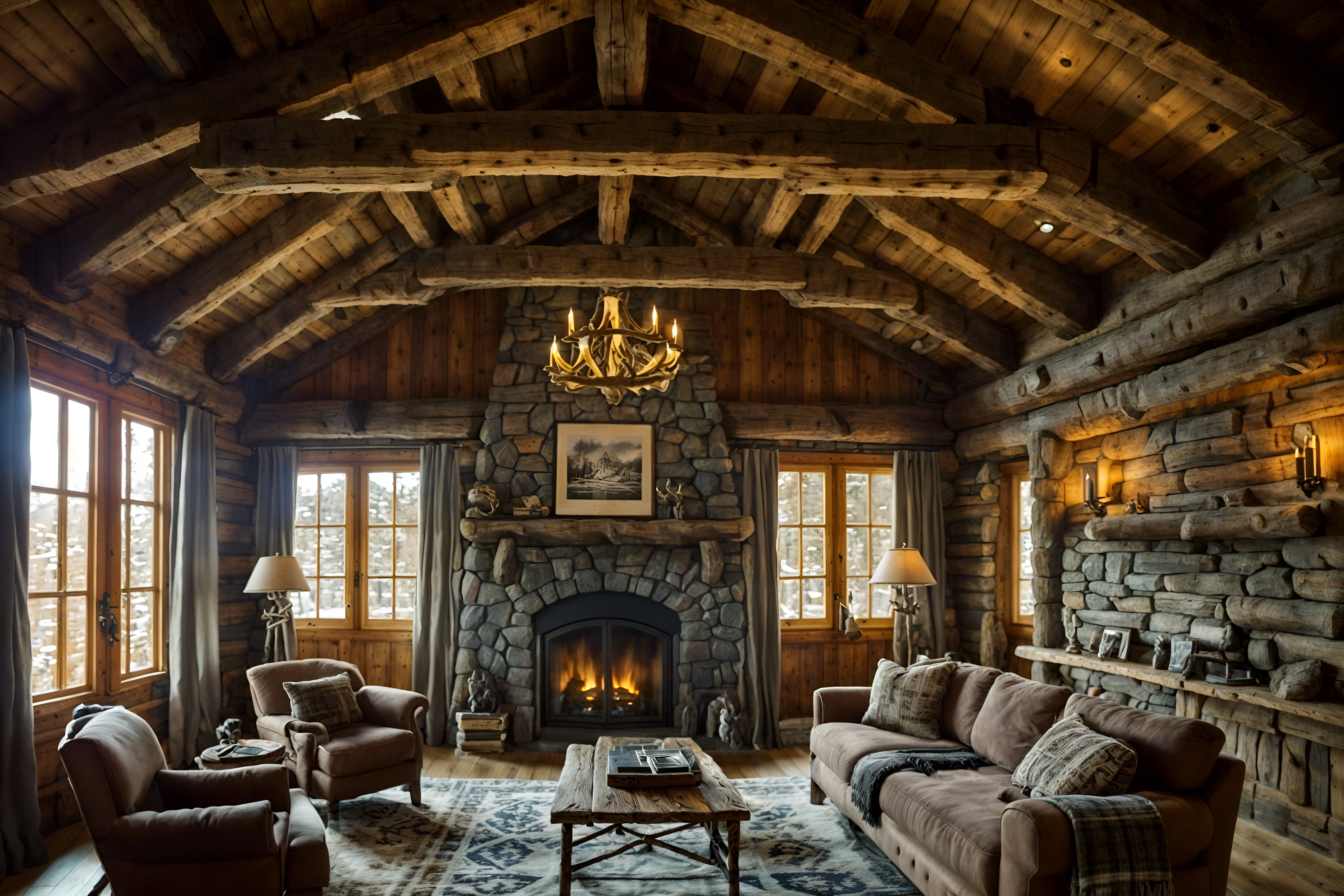 photo from pinterest of ski chalet-style interior designed (exhibition space interior) . with exposed construction beams and hanging wall elk antler and stone fireplace and decorative carving and mouldings and ski-themed decor and layered textiles and rustic and wooden logs. . cinematic photo, highly detailed, cinematic lighting, ultra-detailed, ultrarealistic, photorealism, 8k. trending on pinterest. ski chalet interior design style. masterpiece, cinematic light, ultrarealistic+, photorealistic+, 8k, raw photo, realistic, sharp focus on eyes, (symmetrical eyes), (intact eyes), hyperrealistic, highest quality, best quality, , highly detailed, masterpiece, best quality, extremely detailed 8k wallpaper, masterpiece, best quality, ultra-detailed, best shadow, detailed background, detailed face, detailed eyes, high contrast, best illumination, detailed face, dulux, caustic, dynamic angle, detailed glow. dramatic lighting. highly detailed, insanely detailed hair, symmetrical, intricate details, professionally retouched, 8k high definition. strong bokeh. award winning photo.
