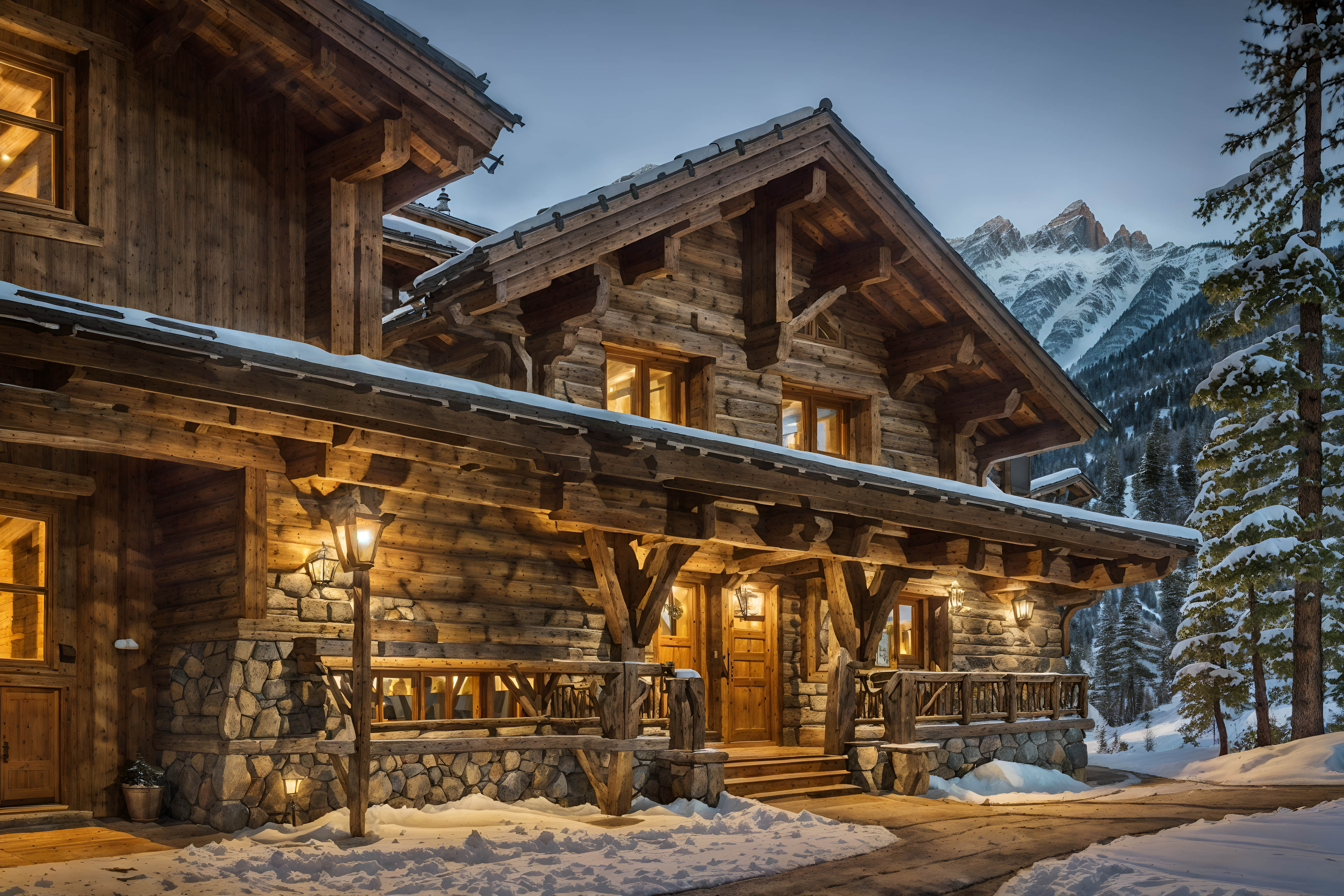 photo from pinterest of ski chalet-style exterior designed (house exterior exterior) . with exposed wood and wood beams and mountain-inspired and hanging wall elk antler and window with mountain views and animal motifs and exposed timber and stone fireplace. . cinematic photo, highly detailed, cinematic lighting, ultra-detailed, ultrarealistic, photorealism, 8k. trending on pinterest. ski chalet exterior design style. masterpiece, cinematic light, ultrarealistic+, photorealistic+, 8k, raw photo, realistic, sharp focus on eyes, (symmetrical eyes), (intact eyes), hyperrealistic, highest quality, best quality, , highly detailed, masterpiece, best quality, extremely detailed 8k wallpaper, masterpiece, best quality, ultra-detailed, best shadow, detailed background, detailed face, detailed eyes, high contrast, best illumination, detailed face, dulux, caustic, dynamic angle, detailed glow. dramatic lighting. highly detailed, insanely detailed hair, symmetrical, intricate details, professionally retouched, 8k high definition. strong bokeh. award winning photo.