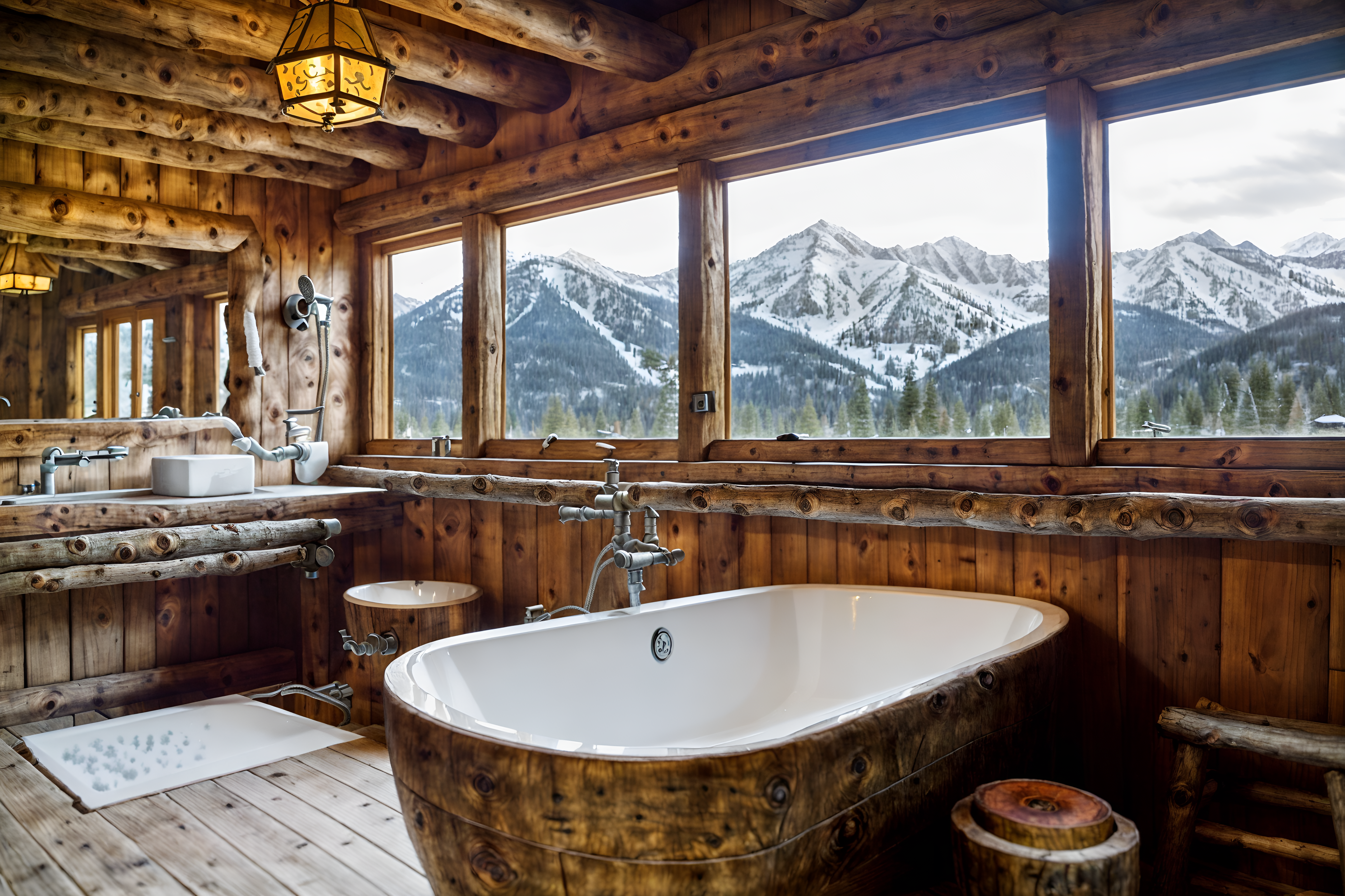 photo from pinterest of ski chalet-style interior designed (hotel bathroom interior) with bathtub and plant and bath rail and shower and bathroom cabinet and bathroom sink with faucet and mirror and waste basket. . with animal motifs and exposed construction beams and window with mountain views and mountain-inspired and richly patterned fabrics and wooden logs and wood beams and stone fireplace. . cinematic photo, highly detailed, cinematic lighting, ultra-detailed, ultrarealistic, photorealism, 8k. trending on pinterest. ski chalet interior design style. masterpiece, cinematic light, ultrarealistic+, photorealistic+, 8k, raw photo, realistic, sharp focus on eyes, (symmetrical eyes), (intact eyes), hyperrealistic, highest quality, best quality, , highly detailed, masterpiece, best quality, extremely detailed 8k wallpaper, masterpiece, best quality, ultra-detailed, best shadow, detailed background, detailed face, detailed eyes, high contrast, best illumination, detailed face, dulux, caustic, dynamic angle, detailed glow. dramatic lighting. highly detailed, insanely detailed hair, symmetrical, intricate details, professionally retouched, 8k high definition. strong bokeh. award winning photo.