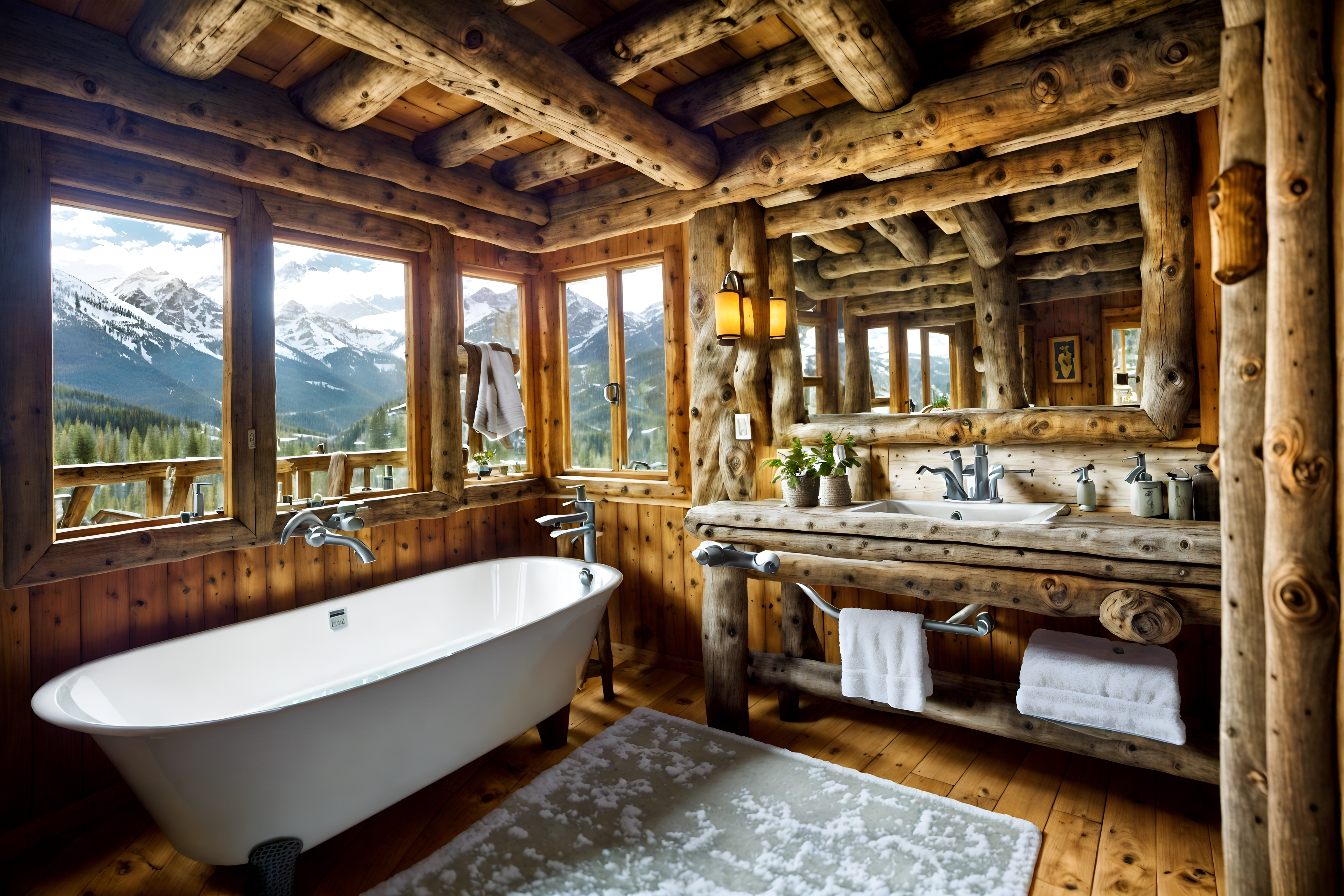 photo from pinterest of ski chalet-style interior designed (hotel bathroom interior) with bathtub and plant and bath rail and shower and bathroom cabinet and bathroom sink with faucet and mirror and waste basket. . with animal motifs and exposed construction beams and window with mountain views and mountain-inspired and richly patterned fabrics and wooden logs and wood beams and stone fireplace. . cinematic photo, highly detailed, cinematic lighting, ultra-detailed, ultrarealistic, photorealism, 8k. trending on pinterest. ski chalet interior design style. masterpiece, cinematic light, ultrarealistic+, photorealistic+, 8k, raw photo, realistic, sharp focus on eyes, (symmetrical eyes), (intact eyes), hyperrealistic, highest quality, best quality, , highly detailed, masterpiece, best quality, extremely detailed 8k wallpaper, masterpiece, best quality, ultra-detailed, best shadow, detailed background, detailed face, detailed eyes, high contrast, best illumination, detailed face, dulux, caustic, dynamic angle, detailed glow. dramatic lighting. highly detailed, insanely detailed hair, symmetrical, intricate details, professionally retouched, 8k high definition. strong bokeh. award winning photo.