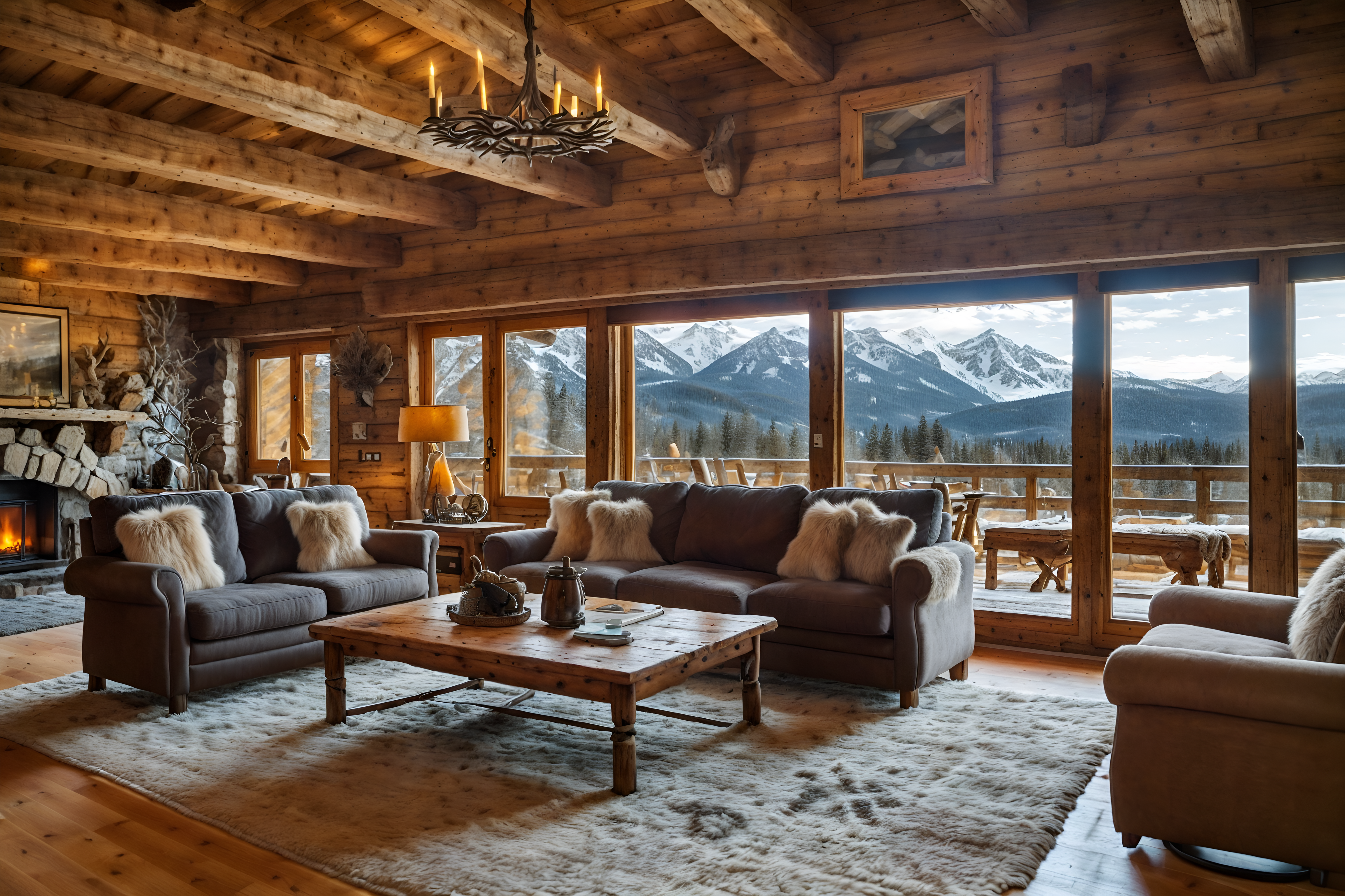 Photo from Pinterest of Ski chalet-style interior designed (living room interior) With rug and coffee tables and televisions and occasional tables and furniture and electric lamps and chairs and sofa. . With layered textiles and wooden walls and animal furs and exposed construction beams and richly patterned fabrics and window with mountain views and stone fireplace and hanging wall elk antler. . Cinematic photo, highly detailed, cinematic lighting, ultra-detailed, ultrarealistic, photorealism, 8k. Trending on Pinterest. Ski chalet interior design style