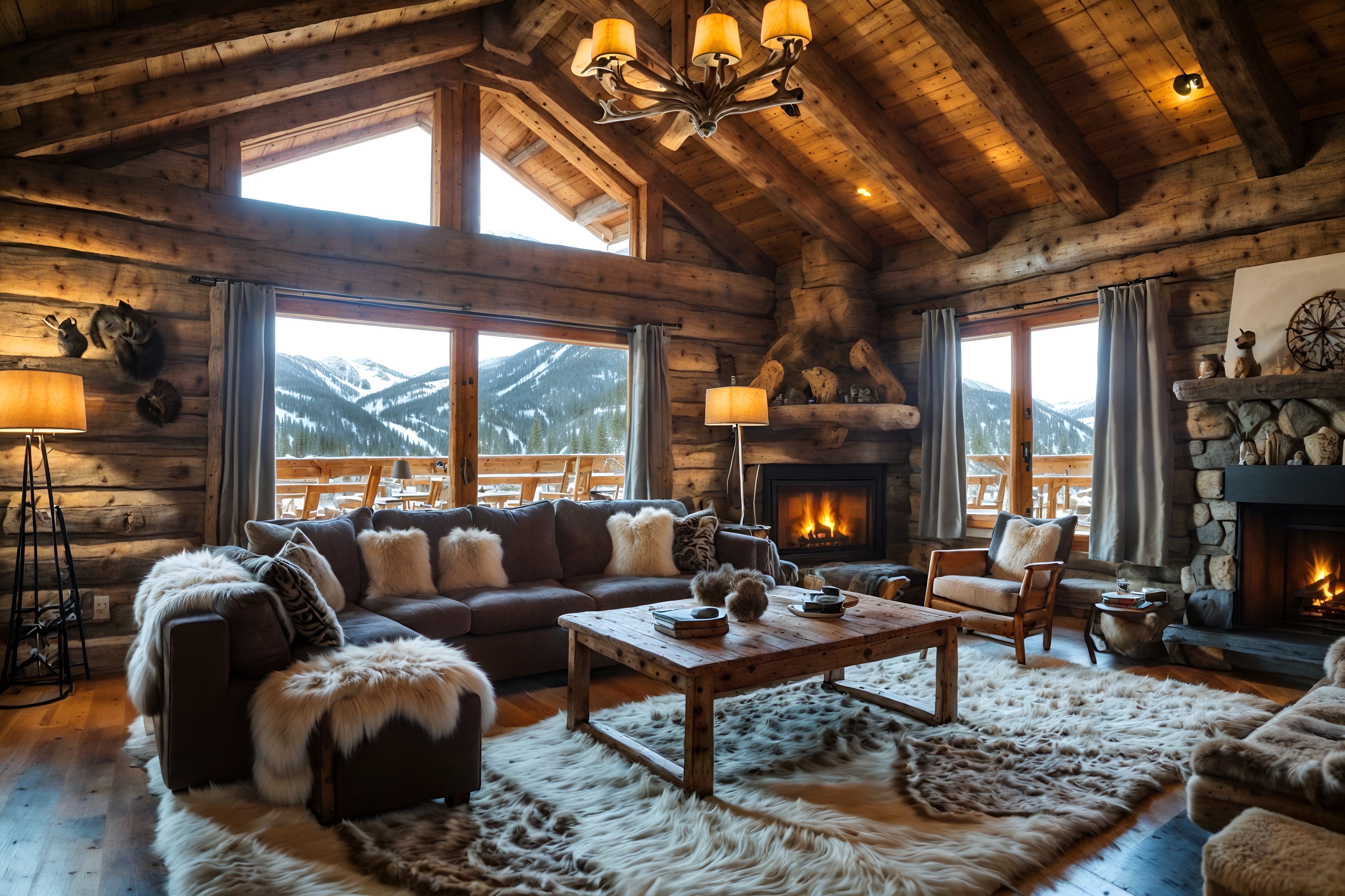 Photo from Pinterest of Ski chalet-style interior designed (living room interior) With rug and coffee tables and televisions and occasional tables and furniture and electric lamps and chairs and sofa. . With layered textiles and wooden walls and animal furs and exposed construction beams and richly patterned fabrics and window with mountain views and stone fireplace and hanging wall elk antler. . Cinematic photo, highly detailed, cinematic lighting, ultra-detailed, ultrarealistic, photorealism, 8k. Trending on Pinterest. Ski chalet interior design style